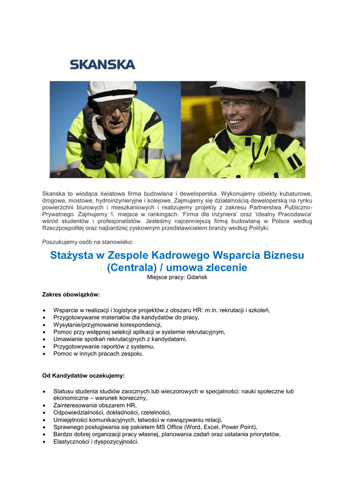 Skanska to wiodąca światowa firma budowlana i deweloperska. Wykonujemy obiekty kubaturowe, drogowe, mostowe, hydroinżynieryjne i kolejowe. Zajmujemy się działalnością deweloperską na rynku powierzchni biurowych i mieszkaniowych i realizujemy projekty z zakresu Partnerstwa PublicznoPrywatnego. Zajmujemy 1. miejsce w rankingach: ‘Firma dla Inżyniera’ oraz ‘Idealny Pracodawca’ wśród studentów i profesjonalistów. Jesteśmy najcenniejszą firmą budowlaną w Polsce według Rzeczpospolitej oraz najbardziej zyskownym przedstawicielem branży według Polityki. Poszukujemy osób na stanowisko: Stażysta w Zespole Kadrowego Wsparcia Biznesu (Centrala) / umowa zlecenie Miejsce pracy: Gdańsk Zakres obowiązków: Wsparcie w realizacji i logistyce projektów z obszaru HR: m.in. rekrutacji i szkoleń, Przygotowywanie materiałów dla kandydatów do pracy, Wysyłanie/przyjmowanie korespondencji, Pomoc przy wstępnej selekcji aplikacji w systemie rekrutacyjnym, Umawianie spotkań rekrutacyjnych z kandydatami, Przygotowywanie raportów z systemu, Pomoc w innych pracach zespołu. Od Kandydatów oczekujemy: Statusu studenta studiów zaocznych lub wieczorowych w specjalności: nauki społeczne lub ekonomiczne – warunek konieczny, Zainteresowania obszarem HR, Odpowiedzialności, dokładności, rzetelności, Umiejętności komunikacyjnych, łatwości w nawiązywaniu relacji, Sprawnego posługiwania się pakietem MS Office (Word, Excel, Power Point), Bardzo dobrej organizacji pracy własnej, planowania zadań oraz ustalania priorytetów, Elastyczności i dyspozycyjności. Zainteresowanych prosimy o przesłanie swoich zgłoszeń (cv, list motywacyjny raz z klauzulą o ochronie danych osobowych) do dnia 17.05.2015 r. na adres [email protected] lub: Angelika Sieńko Skanska S.A. ul. Budowlanych 1, 80-298 Gdańsk Matarnia Kontaktujemy się tylko z wybranymi kandydatami i nie zwracamy przesłanych dokumentów. Prosimy o zamieszczenie klauzuli: "Wyrażam zgodę na przetwarzanie moich danych osobowych dla potrzeb niezbędnych do realizacji procesu rekrutacji, zgodnie z ustawą o ochronie danych osobowych z dn. 29.08.97."