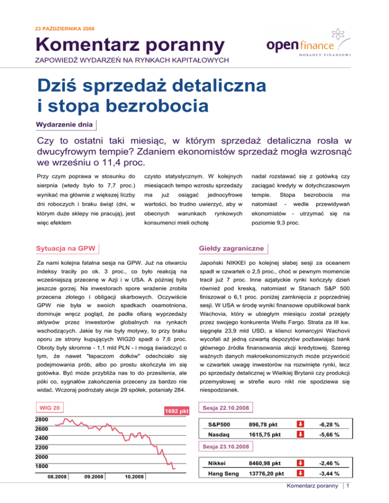 23 PAŹDZIERNIKA 2008 Komentarz poranny ZAPOWIEDŹ WYDARZEŃ NA RYNKACH KAPITAŁOWYCH Dziś sprzedaż detaliczna i stopa bezrobocia Wydarzenie dnia Czy to ostatni taki miesiąc, w którym sprzedaż detaliczna rosła w dwucyfrowym tempie? Zdaniem ekonomistów sprzedaż mogła wzrosnąć we wrześniu o 11,4 proc. Przy czym poprawa w stosunku do czysto statystycznym. W kolejnych nadal rozstawać się z gotówką czy sierpnia (wtedy było to 7,7 proc.) miesiącach tempo wzrostu sprzedaży zaciągać kredyty w dotychczasowym wynikać ma głównie z większej liczby ma tempie. dni roboczych i braku świąt (dni, w wartości, bo trudno uwierzyć, aby w natomiast którym duże sklepy nie pracują), jest obecnych ekonomistów więc efektem konsumenci mieli ochotę już osiągać jednocyfrowe warunkach rynkowych Stopa - bezrobocia wedle - ma przewidywań utrzymać się na poziomie 9,3 proc. Sytuacja na GPW Giełdy zagraniczne Za nami kolejna fatalna sesja na GPW. Już na otwarciu Japoński NIKKEI po kolejnej słabej sesji za oceanem indeksy traciły po ok. 3 proc., co było reakcją na spadł w czwartek o 2,5 proc., choć w pewnym momencie wcześniejszą przecenę w Azji i w USA. A później było tracił już 7 proc. Inne azjatyckie rynki kończyły dzień jeszcze gorzej. Na inwestorach spore wrażenie zrobiła również pod kreską, natomiast w Stanach S&P 500 przecena złotego i obligacji skarbowych. Oczywiście finiszował o 6,1 proc. poniżej zamknięcia z poprzedniej GPW nie była w swoich spadkach osamotniona, sesji. W USA w środę wyniki finansowe opublikował bank dominuje wręcz pogląd, że padła ofiarą wyprzedaży Wachovia, który w ubiegłym miesiącu został przejęty aktywów przez inwestorów globalnych na rynkach przez swojego konkurenta Wells Fargo. Strata za III kw. wschodzących. Jakie by nie były motywy, to przy braku sięgnęła 23,9 mld USD, a klienci komercyjni Wachovii oporu ze strony kupujących WIG20 spadł o 7,6 proc. wycofali aż jedną czwartą depozytów pozbawiając bank Obroty były skromne - 1,1 mld PLN - i mogą świadczyć o głównego źródła finansowania akcji kredytowej. Szereg tym, że nawet "łapaczom dołków" odechciało się ważnych danych makroekonomicznych może przywrócić podejmowania prób, albo po prostu skończyła im się w czwartek uwagę inwestorów na rozwinięte rynki, lecz gotówka. Być może przybliża nas to do przesilenia, ale po sprzedaży detalicznej w Wielkiej Brytanii czy produkcji póki co, sygnałów zakończenia przeceny za bardzo nie przemysłowej w strefie euro nikt nie spodziewa się widać. Wczoraj podrożały akcje 29 spółek, potaniały 284. niespodzianek. WIG 20 1692 pkt Sesja 22.10.2008 2800 2600 2400 S&P500 896,78 pkt -6,28 % Nasdaq 1615,75 pkt -5,66 % Sesja 23.10.2008 2200 2000 1800 08.2008 09.2008 10.2008 Nikkei 8460,98 pkt -2,46 % Hang Seng 13776,20 pkt -3,44 % Komentarz poranny 1 Obserwuj akcje Poinformowali przed sesją TPSA - nie bez powodu akcje największego gracza na PBG - skorygował prognozę wyników finansowych na ten polskim rynku telekomunikacji określa się mianem spółki rok. Zysk netto (grupy) ma wynieść 195,4 mln PLN w tym defensywnej - podczas gdy ostatnie spadki nierzadko zysk przypadający jednostce dominującej 157,8 mln odchudziły portfele inwestycyjne o więcej niż połowę, PLN(wcześniej planowano 142,6 mln PLN). Prognoza udziałowcy przychodów pozostała niezmieniona (1,9 mld PLN). TP SA mogą pocieszać się, że od wierzchołka ze stycznia 2007 papiery potaniały o ok. 6 PLN z 26 do 20 PLN. Na wykresie tygodniowych zmian Hydrobudowa kursu obejmującym kilka lat widzimy, że od wiosny 2007 finansowych na ten rok. Skonsolidowane przychody mają - r. cena akcji znalazła się w konsolidacji i porusza się w wynieść horyzontalnym kanale odchylając się od poziomu 22 PLN jednostkowe przychody na poziomie 748 mln PLN), a o nie więcej niż 2 PLN. We wtorek obserwowaliśmy zysk netto 83,7 mln PLN (wcześniej 53,6 mln PLN). 1,26 skorygowała mld PLN prognozę (wcześniej wyników planowano bardzo wysokie obroty (ponad 500 mln PLN) na walorach TP SA będące wynikiem jednej dużej, lecz trudno Lotos - wydał 161 mln PLN na zakup 10 proc. udziałów wyciągać na jej podstawie wnioski. Posiadacze akcji w spółki powinni ustawić zlecenia obronne poniżej 19 PLN, wydobycie ropy ze złoża Yme na Morzu Północnym. ponieważ wiele wskazuje na to, że w ciągu najbliższych Rozpoczęcie wydobycia przewidywane jest na drugą sesji może nastąpić wybicie dołem z trendu bocznego, połowę przyszłego roku. np. MACD na wykresie tygodniowym dał spółce Det norske, posiadającej koncesję na sygnał sprzedaży. eCard - zarząd poinformował, że niektóre komunikaty wysłane do systemu emitent 22 października zostały wysłane bez należytych uprawnień. Podano także, że trzech z sześciu członków rady nadzorczej uważa, że decyzje o zmianie w zarządzie nie zostały ważnie podjęte. Prognoza giełdowa MCI - sprzedał wszystkie udziały w Innovation Technology Group. Ostatnia transza sprzedaży ma Każda przecena musi mieć swoje granice. Nie można przynieść funduszowi 5,6 mln PLN, a zysk na całej oczywiście odgadnąć, czy akurat wczoraj ta granica transakcji wyniesie 6,55 mln PLN. została osiągnięta, ale trzeba pamiętać, że spadek był spory i nie został poparty obrotami. Tymczasem w USA Pekao - członek zarządu sprzedał 5 tys. akcji banku na zniżka także była silna, ale w Azji już mniej, a indeksy sesji 21 października. pięły się tam w górę od połowy sesji odrabiając wcześniejsze straty. Kontrakty na amerykańskie indeksy zwyżkują, co zawsze dodaje nieco otuchy. Zatem choć być może spadków nie da się uniknąć i dziś, to ich skala może wcale nie być znacząca. Dane makroekonomiczne z Polski przejdą Indeksy GPW WIG 27282,25 pkt -6,24 % WIG 20 1683,66 pkt -7,60 % sWIG80 7486,36 pkt -3,21 % mWIG40 1670,44 pkt -4,87 % WIG - BUDOW 4859,04 pkt -
