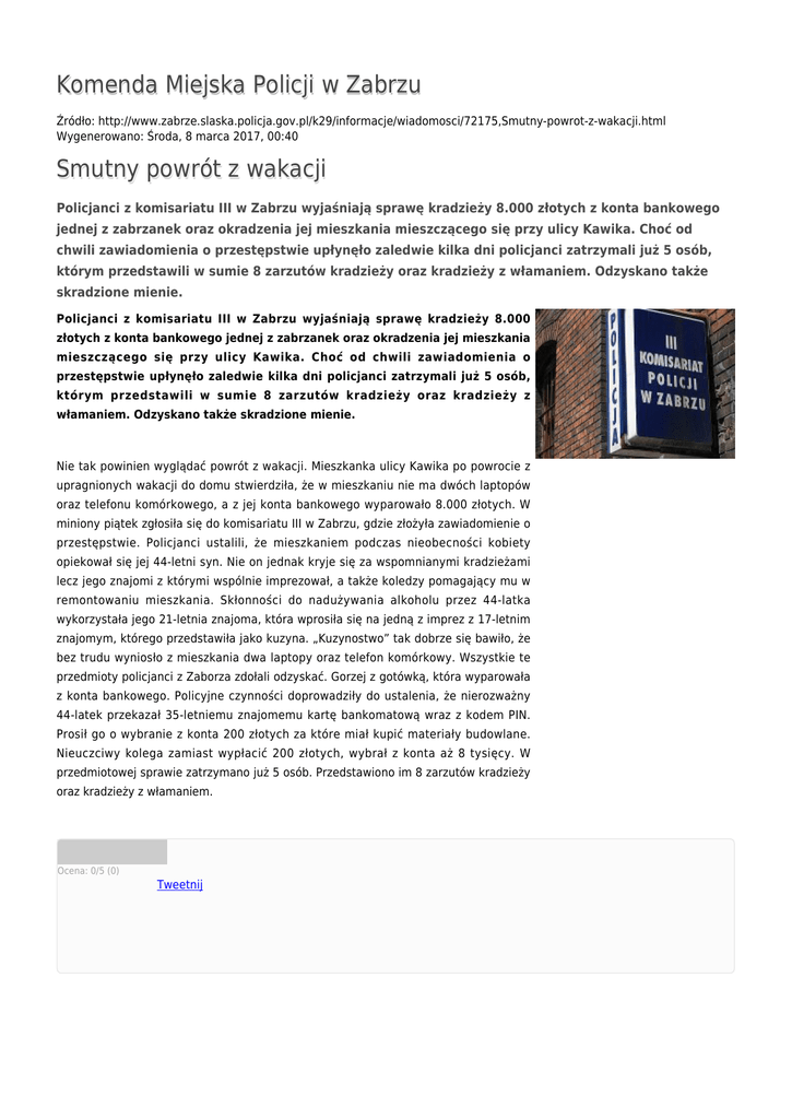 Komenda Miejska Policji w Zabrzu Źródło: http://www.zabrze.slaska.policja.gov.pl/k29/informacje/wiadomosci/72175,Smutny-powrot-z-wakacji.html Wygenerowano: Środa, 8 marca 2017, 00:40 Smutny powrót z wakacji Policjanci z komisariatu III w Zabrzu wyjaśniają sprawę kradzieży 8.000 złotych z konta bankowego jednej z zabrzanek oraz okradzenia jej mieszkania mieszczącego się przy ulicy Kawika. Choć od chwili zawiadomienia o przestępstwie upłynęło zaledwie kilka dni policjanci zatrzymali już 5 osób, którym przedstawili w sumie 8 zarzutów kradzieży oraz kradzieży z włamaniem. Odzyskano także skradzione mienie. Policjanci z komisariatu III w Zabrzu wyjaśniają sprawę kradzieży 8.000 złotych z konta bankowego jednej z zabrzanek oraz okradzenia jej mieszkania mieszczącego się przy ulicy Kawika. Choć od chwili zawiadomienia o przestępstwie upłynęło zaledwie kilka dni policjanci zatrzymali już 5 osób, którym przedstawili w sumie 8 zarzutów kradzieży oraz kradzieży z włamaniem. Odzyskano także skradzione mienie. Nie tak powinien wyglądać powrót z wakacji. Mieszkanka ulicy Kawika po powrocie z upragnionych wakacji do domu stwierdziła, że w mieszkaniu nie ma dwóch laptopów oraz telefonu komórkowego, a z jej konta bankowego wyparowało 8.000 złotych. W miniony piątek zgłosiła się do komisariatu III w Zabrzu, gdzie złożyła zawiadomienie o przestępstwie. Policjanci ustalili, że mieszkaniem podczas nieobecności kobiety opiekował się jej 44-letni syn. Nie on jednak kryje się za wspomnianymi kradzieżami lecz jego znajomi z którymi wspólnie imprezował, a także koledzy pomagający mu w remontowaniu mieszkania. Skłonności do nadużywania alkoholu przez 44-latka wykorzystała jego 21-letnia znajoma, która wprosiła się na jedną z imprez z 17-letnim znajomym, którego przedstawiła jako kuzyna. „Kuzynostwo” tak dobrze się bawiło, że bez trudu wyniosło z mieszkania dwa laptopy oraz telefon komórkowy. Wszystkie te przedmioty policjanci z Zaborza zdołali odzyskać. Gorzej z gotówką, która wyparowała z konta bankowego. Policyjne czynności doprowadziły do ustalenia, że nierozważny 44-latek przekazał 35-letniemu znajomemu kartę bankomatową wraz z kodem PIN. Prosił go o wybranie z konta 200 złotych za które miał kupić materiały budowlane. Nieuczciwy kolega zamiast wypłacić 200 złotych, wybrał z konta aż 8 tysięcy. W przedmiotowej sprawie zatrzymano już 5 osób. Przedstawiono im 8 zarzutów kradzieży oraz kradzieży z włamaniem. Ocena: 0/5 (0) Tweetnij
