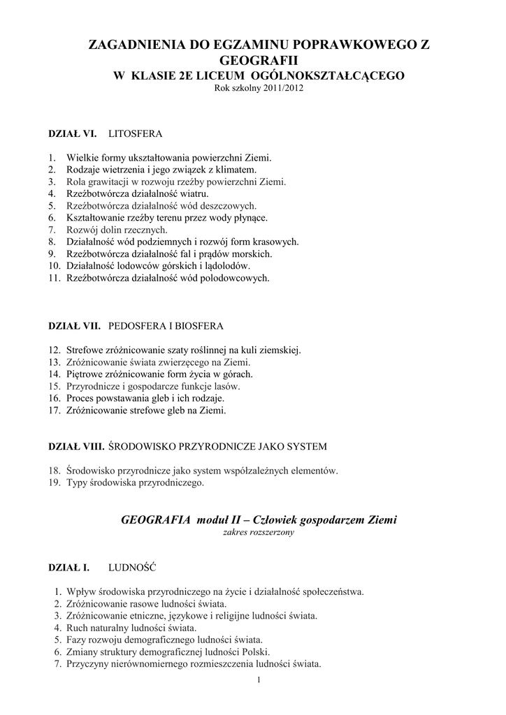 ZAGADNIENIA DO EGZAMINU POPRAWKOWEGO Z GEOGRAFII W KLASIE 2E LICEUM OGÓLNOKSZTAŁCĄCEGO Rok szkolny 2011/2012 DZIAŁ VI. 1. 2. 3. 4. 5. 6. 7. 8. 9. 10. 11. LITOSFERA Wielkie formy ukształtowania powierzchni Ziemi. Rodzaje wietrzenia i jego związek z klimatem. Rola grawitacji w rozwoju rzeźby powierzchni Ziemi. Rzeźbotwórcza działalność wiatru. Rzeźbotwórcza działalność wód deszczowych. Kształtowanie rzeźby terenu przez wody płynące. Rozwój dolin rzecznych. Działalność wód podziemnych i rozwój form krasowych. Rzeźbotwórcza działalność fal i prądów morskich. Działalność lodowców górskich i lądolodów. Rzeźbotwórcza działalność wód polodowcowych. DZIAŁ VII. PEDOSFERA I BIOSFERA 12. 13. 14. 15. 16. 17. Strefowe zróżnicowanie szaty roślinnej na kuli ziemskiej. Zróżnicowanie świata zwierzęcego na Ziemi. Piętrowe zróżnicowanie form życia w górach. Przyrodnicze i gospodarcze funkcje lasów. Proces powstawania gleb i ich rodzaje. Zróżnicowanie strefowe gleb na Ziemi. DZIAŁ VIII. ŚRODOWISKO PRZYRODNICZE JAKO SYSTEM 18. Środowisko przyrodnicze jako system współzależnych elementów. 19. Typy środowiska przyrodniczego. GEOGRAFIA moduł II – Człowiek gospodarzem Ziemi zakres rozszerzony DZIAŁ I. 1. 2. 3. 4. 5. 6. 7. LUDNOŚĆ Wpływ środowiska przyrodniczego na życie i działalność społeczeństwa. Zróżnicowanie rasowe ludności świata. Zróżnicowanie etniczne, językowe i religijne ludności świata. Ruch naturalny ludności świata. Fazy rozwoju demograficznego ludności świata. Zmiany struktury demograficznej ludności Polski. Przyczyny nierównomiernego rozmieszczenia ludności świata. 1 8. 9. 10. 11. Praca źródłem utrzymania ludności. Przyczyny i skutki bezrobocia w Polsce. Migracje ludności świata. Wielkie migracje ludności Polski. DZIAŁ II. 12. 13. 14. 15. 16. Typy osadnictwa wiejskiego. Struktura i funkcjonowanie miast świata. Zróżnicowanie procesów urbanizacyjnych na świecie. Procesy urbanizacyjne i rozwój miast w Polsce. Problemy wielkich miast i aglomeracji miejskich świata. DZIAŁ III. 17. 18. 19. 20. 21. 22. 23. 24. 25. OSADNICTWO ROLNICTWO I WYŻYWIENIE LUDNOŚCI Zróżnicowanie przyrodniczych warunków produkcji rolnej na świecie. Zróżnicowanie pozaprzyrodniczych warunków produkcji rolnej na świecie. Główne kierunki produkcji rolnej w wybranych państwach świata. Rozmieszczenie upraw i zbiory roślin wyżywieniowych. Obszary upraw używek i roślin przemysłowych. Zróżnicowanie produkcji rolniczej w Polsce. Hodowla zwierząt na świecie i w Polsce. Zróżnicowanie poziomu wyżywienia ludności świata. Przegląd głównych regionów rolniczych świata i Polski. ZNAJOMOŚĆ MAPY. - znajomość w stopniu podstawowym mapy politycznej świata (państwa i stolice) – przede wszystkim obiekty wiążące się z wyżej wymienionymi tematami. 2