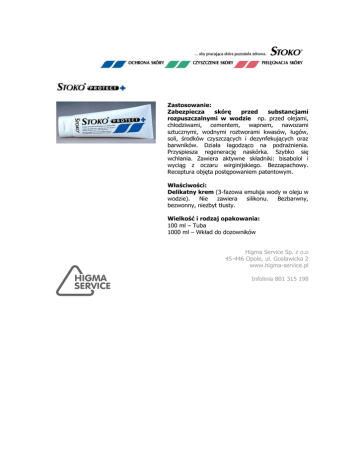 Zastosowanie: Zabezpiecza skórę przed substancjami rozpuszczalnymi w wodzie np. przed olejami, chłodziwami, cementem, wapnem, nawozami sztucznymi, wodnymi roztworami kwasów, ługów, soli, środków czyszczących i dezynfekujących oraz barwników. Działa łagodząco na podrażnienia. Przyspiesza regenerację naskórka. Szybko się wchłania. Zawiera aktywne składniki: bisabolol i wyciąg z oczaru wirginijskiego. Bezzapachowy. Receptura objęta postępowaniem patentowym. Właściwości: Delikatny krem (3-fazowa emulsja wody w oleju w wodzie). Nie zawiera silikonu. Bezbarwny, bezwonny, niezbyt tłusty. Wielkość i rodzaj opakowania: 100 ml – Tuba 1000 ml – Wkład do dozowników Higma Service Sp. z o.o 45-446 Opole, ul. Gosławicka 2 www.higma-service.pl Infolinia 801 315 198