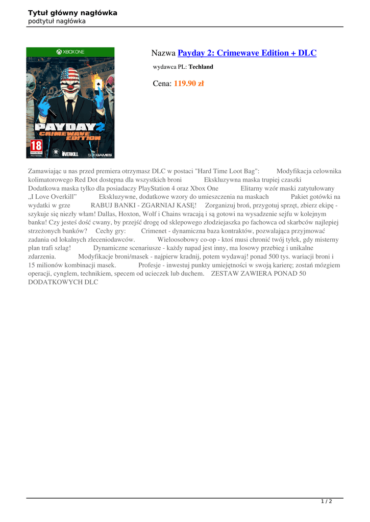 Tytuł główny nagłówka podtytuł nagłówka Nazwa Payday 2: Crimewave Edition + DLC wydawca PL: Techland Cena: 119.90 zł Zamawiając u nas przed premiera otrzymasz DLC w postaci "Hard Time Loot Bag": Modyfikacja celownika kolimatorowego Red Dot dostępna dla wszystkich broni Ekskluzywna maska trupiej czaszki Dodatkowa maska tylko dla posiadaczy PlayStation 4 oraz Xbox One Elitarny wzór maski zatytułowany „I Love Overkill” Ekskluzywne, dodatkowe wzory do umieszczenia na maskach Pakiet gotówki na wydatki w grze RABUJ BANKI - ZGARNIAJ KASĘ! Zorganizuj broń, przygotuj sprzęt, zbierz ekipę szykuje się niezły włam! Dallas, Hoxton, Wolf i Chains wracają i są gotowi na wysadzenie sejfu w kolejnym banku! Czy jesteś dość cwany, by przejść drogę od sklepowego złodziejaszka po fachowca od skarbców najlepiej strzeżonych banków? Cechy gry: Crimenet - dynamiczna baza kontraktów, pozwalająca przyjmować zadania od lokalnych zleceniodawców. Wieloosobowy co-op - ktoś musi chronić twój tyłek, gdy misterny plan trafi szlag! Dynamiczne scenariusze - każdy napad jest inny, ma losowy przebieg i unikalne zdarzenia. Modyfikacje broni/masek - najpierw kradnij, potem wydawaj! ponad 500 tys. wariacji broni i 15 milionów kombinacji masek. Profesje - inwestuj punkty umiejętności w swoją karierę; zostań mózgiem operacji, cynglem, technikiem, specem od ucieczek lub duchem. ZESTAW ZAWIERA PONAD 50 DODATKOWYCH DLC 1/2 Tytuł główny nagłówka podtytuł nagłówka Nazwa Wartość Wydawca PL Techland Data premiery 12.06.2015 Producent Tryb gry Kategoria wiekowa Wersja językowa Wymagania sprzętowe Format OVERKILL Software Single / Multiplayer 18+ ENG Konsola Xbox One Blu-Ray 2/2