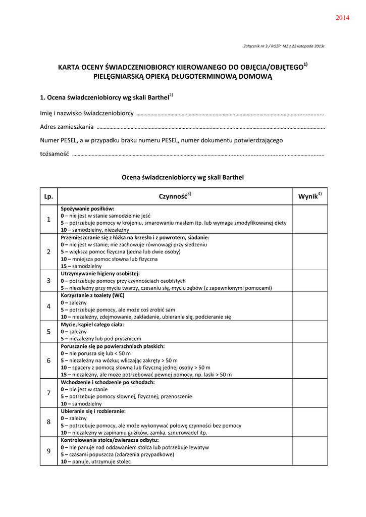 2014 Załącznik nr 3 / ROZP. MZ z 22 listopada 2013r. KARTA OCENY ŚWIADCZENIOBIORCY KIEROWANEGO DO OBJĘCIA/OBJĘTEGO1) PIELĘGNIARSKĄ OPIEKĄ DŁUGOTERMINOWĄ DOMOWĄ 1. Ocena świadczeniobiorcy wg skali Barthel2) Imię i nazwisko świadczeniobiorcy …………………………………………………………………………………………..……….................. Adres zamieszkania ……………………………………………………………………………………..………………………………..……….…………... Numer PESEL, a w przypadku braku numeru PESEL, numer dokumentu potwierdzającego tożsamośd …………………………………………………………………………………………………......................................…………….......... Ocena świadczeniobiorcy wg skali Barthel Lp. 1 2 3 4 5 6 7 8 9 Czynnośd3) Spożywanie posiłków: 0 – nie jest w stanie samodzielnie jeśd 5 – potrzebuje pomocy w krojeniu, smarowaniu masłem itp. lub wymaga zmodyfikowanej diety 10 – samodzielny, niezależny Przemieszczanie się z łóżka na krzesło i z powrotem, siadanie: 0 – nie jest w stanie; nie zachowuje równowagi przy siedzeniu 5 – większa pomoc fizyczna (jedna lub dwie osoby) 10 – mniejsza pomoc słowna lub fizyczna 15 – samodzielny Utrzymywanie higieny osobistej: 0 – potrzebuje pomocy przy czynnościach osobistych 5 – niezależny przy myciu twarzy, czesaniu się, myciu zębów (z zapewnionymi pomocami) Korzystanie z toalety (WC) 0 – zależny 5 – potrzebuje pomocy, ale może coś zrobid sam 10 – niezależny, zdejmowanie, zakładanie, ubieranie się, podcieranie się Mycie, kąpiel całego ciała: 0 – zależny 5 – niezależny lub pod prysznicem Poruszanie się po powierzchniach płaskich: 0 – nie porusza się lub < 50 m 5 – niezależny na wózku; wliczając zakręty > 50 m 10 – spacery z pomocą słowną lub fizyczną jednej osoby > 50 m 15 – niezależny, ale może potrzebowad pewnej pomocy, np. laski > 50 m Wchodzenie i schodzenie po schodach: 0 – nie jest w stanie 5 – potrzebuje pomocy słownej, fizycznej; przenoszenie 10 – samodzielny Ubieranie się i rozbieranie: 0 – zależny 5 – potrzebuje pomocy, ale może wykonywad połowę czynności bez pomocy 10 – niezależny w zapinaniu guzików, zamka, sznurowadeł itp. Kontrolowanie stolca/zwieracza odbytu: 0 – nie panuje nad oddawaniem stolca lub potrzebuje lewatyw 5 – czasami popuszcza (zdarzenia przypadkowe) 10 – panuje, utrzymuje stolec Wynik4) 10 Kontrolowanie moczu/zwieracza pęcherza moczowego: 0 – nie panuje nad oddawaniem moczu lub cewnikowany i przez to niesamodzielny 5 – czasami popuszcza (zdarzenia przypadkowe) 10 – panuje, utrzymuje mocz Wynik kwalifikacji5) Wynik oceny stanu zdrowia: Stwierdzam, że wyżej wymieniona osoba wymaga/nie wymaga1) pielęgniarskiej opieki długoterminowej domowej ………………………………………………………………………………………………………………………………………………………………………………… ………………………………………………………………………………………………………………………………………………………………………………… ………………………………………………………………………………………………………………………………………………………………….…………..… ……………………………………………………………………….…… data, pieczęd, podpis lekarza ubezpieczenia zdrowotnego ……………………………………………………………………………… data, pieczęd, podpis pielęgniarki ubezpieczenia zdrowotnego albo pielęgniarki opieki długoterminowej domowej _________________________ 1) Niepotrzebne skreślid. 2) Mahoney Fl, Barthel D. „Badanie funkcjonalne: Wskaźnik Barthel”. Maryland State Med. Jurnal 1965; 14:56 – 61. Wykorzystane za zgodą. Skala ta może byd używana bez ograniczeo dla celów niekomercyjnych. 3) W lp. 1 – 10 należy wybrad i podkreślid jedną z możliwości najlepiej opisującą stan świadczeniobiorcy. 4) Należy wpisad wartośd punktową przypisaną wybranej możliwości. 5) Należy wpisad uzyskaną sumę punktów z lp. 1 – 10. 6) Dotyczy oceny świadczeniobiorcy, wg. skali Barthel, przebywającego pod opieką pielęgniarki opieki długoterminowej domowej. 6)