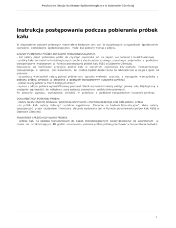 Powiatowa Stacja Sanitarno-Epidemiologiczna w Dąbrowie Górniczej Instrukcja postępowania podczas pobierania próbek kału W diagnostyce zakażeń jelitowych materiałem badanym jest kał. W wyjątkowych przypadkach (podejrzenie czerwonki, dochodzenie epidemiologiczne), może być pobrany wymaz z odbytu. ZASADY POBIERANIA PRÓBEK DO BADAŃ MIKROBIOLOGICZNYCH: - kał należy przed pobraniem oddać do czystego pojemnika lub na papier, nie pobierać z muszli klozetowej - próbkę kału do badań mikrobiologicznych pobiera się do jednorazowego, sterylnego pojemnika z podłożem transportowym wydawanym w Punkcie przyjmowania próbek kału PSSE w Dąbrowie Górniczej. Dopuszcza się moŜliwość przyjęcia próbki kału w sterylnym pojemniku bez podłoża transportowego (zakupionego w aptece), pod warunkiem, że próbka będzie dostarczona do laboratorium w ciągu 2 godz. od pobrania - za pomocą wymazówki należy pobrać próbkę kału (grudka wielkości grochu), a następnie wymazówkę z pobraną próbką umieścić w probówce z podłożem transportowym i szczelnie zamknąć - próbki należy pobrać w trzech kolejnych dniach - wymaz z odbytu pobiera wykwalifikowany personel. Wacik wymazówki należy zwilżyć jałową solą fizjologiczną a następnie wprowadzić do odbytnicy poza zwieracz zewnętrzny i wielokrotnie przekręcić. Po pobraniu wymazu, wymazówkę umieścić w probówce z podłożem transportowym i szczelnie zamknąć. DOKUMENTACJA POBRANEJ PRÓBKI: - należy opisać etykietę probówki / pojemnika nazwiskiem i imieniem badanego oraz datą poboru próbki - do próbki kału należy dołączyć czytelnie wypełnione „Zlecenie na badania laboratoryjne”, które należy zabezpieczyć przed skażeniem (formularz zlecenia wydawany jest w Punkcie przyjmowania próbek kału PSSE w Dąbrowie Górniczej) TRANSPORT I PRZECHOWYWANIE PRÓBEK - próbkę kału na podłożu transportowym do badań mikrobiologicznych należy dostarczyć do laboratorium w czasie nie przekraczającym 48 godzin od momentu pobrania próbki (próbkę przechować w temperaturze lodówki) 1