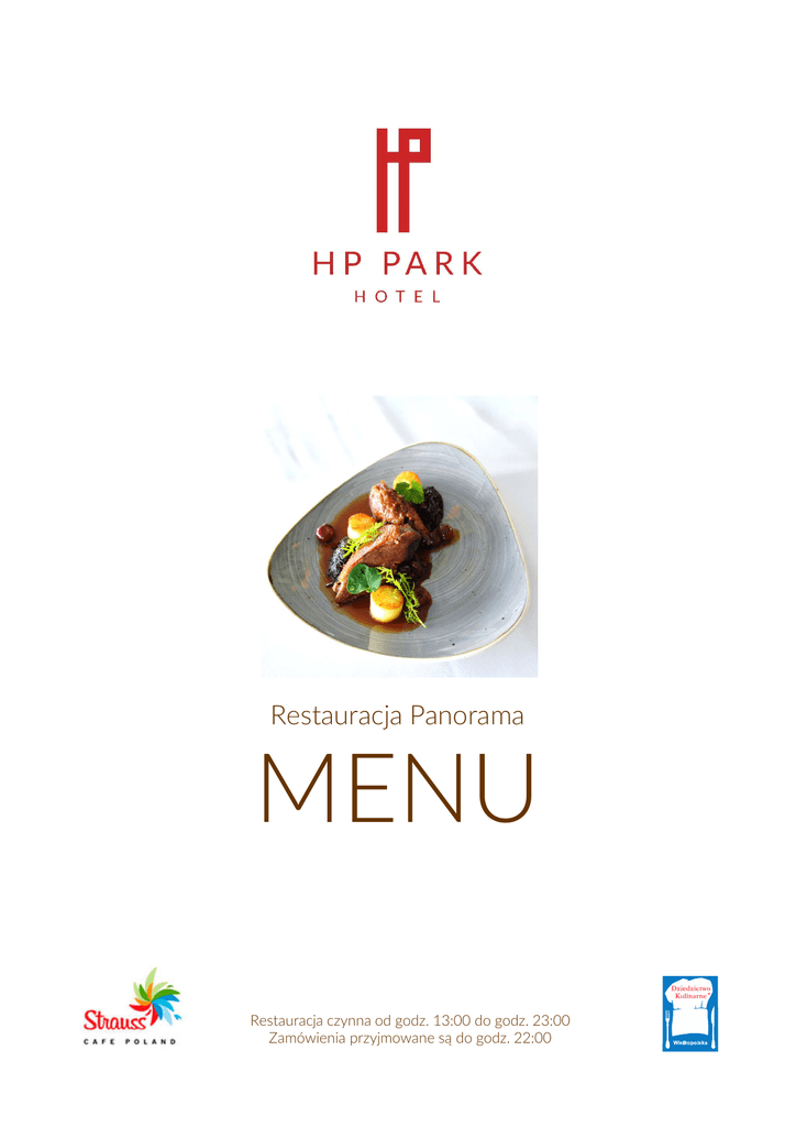 Restauracja Panorama MENU Restauracja czynna od godz. 13:00 do godz. 23:00 Zamówienia przyjmowane są do godz. 22:00 KUCHNIA REGIONALNA ZUPA SZCZAWIOWA Zupa szczawiowa, jajko poche, purée ziemniaczane Alergeny: mleko, jajo 12 pln KACZKA PIECZONA Pół kaczki upieczonej z jabłkami, cebulą i majerankiem, pyzy poznańskie, modra kapusta Alergeny: gluten, jaja 50 pln GOLONKA PIECZONA 30 GODZIN Golonka pieczona, kapusta kwaszona, purée z grochu, ciemny sos Alergeny: gluten, seler 40 pln ROLADA WOŁOWA Zraz zawijany z boczkiem i ogórkiem kiszonym, buraczki zasmażane, pyzy poznańskie Alergeny: gluten, jaja 38 pln POLICZKI WIEPRZOWE Peklowane policzki wieprzowe, purée ziemniaczane, młoda kapusta, chrzan Alergeny: gluten 42 pln PRZYSTAWKI ZIMNE TATAR WOŁOWY Tatar z polędwicy wołowej, korniszony, cebula, marynowane pieczarki, wędzony szpik Alergeny: grzyby, jaja 38 pln ŚLEDŹ W ŚMIETANIE Marynowane w soku z cytryny kawałki matiasa, kwaśna śmietana, jabłko, sałatka ziemniaczana Alergeny: mleko 25 pln PRZYSTAWKI GORĄCE PIEROGI Z KACZKĄ Sześć pierogów z farszem z piersi kaczej, tymianek, kurki, pasternak, sos grzybowy Alergeny: gluten, jaja, grzyby 30 pln MULE GOTOWANE Gotowane małże w sosie z białego wina, tymianek, frytki, sos aioli Alergeny : małże 40 pln SAŁATY SAŁATA Z GRILLOWANYM KURCZAKIEM Świeże sałaty, grillowana pierś z kurczaka, pomidory suszone, oliwki, vinaigrette bazyliowy 30 pln SAŁATKA Z AVOCADO I PIECZONYM ŁOSOSIEM Bukiet świeżych sałat, avocado, łosoś pieczony z chilli, oliwki z migdałami, pomidorki cherry, ser Manchego Alergeny: ryba 34 pln ZUPY ZUPA KURKOWA Kremowa zupa z kurek, pietruszka, kluski kładzione Alergeny : mleko, gluten, grzyby 14 pln KREM Z DYNI Pikantny krem z dyni, ser bursztyn, olej z pestek dyni Alergeny: mleko, gluten, pestki dyni 12 pln RAMEN WIEPRZOWY Pikantny bulion wieprzowy, imbir, makaron, jajko, policzki wieprzowe, shitake Alergeny: jaja, gluten, sezam, grzyby 16 pln DANIA GŁÓWNE ANTRYKOT Z GRILLA Grillowany antrykot argentyński, fasolka szparagowa, ziemniaki fondant, ciemny sos z zielonym pieprzem, palone masło Alergeny: gluten, mleko 69 pln SZPONDER WOŁOWY Duszone żeberka wołowe, ziemniaki purée, sos Chaseur Alergeny: mleko, grzyby 45 pln KURCZAK ZAGRODOWY Filet z kurczaka zagrodowego, duszony świeży szpinak, pierogi ruskie, sos śmietankowy Alergeny: mleko 39 pln PIECZONA CIELĘCINA Pieczony udziec cielęcy, purée z pieczonej dyni, sos z musztardą i wanilią, ziemniaki fondant Alergeny: gluten 65 pln FILET Z GĘSI Filet gotowany w gęsim tłuszczu, ciemny sos z wiśniami, powidła z czerwonej cebuli, ziemniaki opiekane 60 pln RYBY FILET Z MAKRELI Filet z makreli, pomidorki cherry, czosnek, tapenade z oliwek, warzywa grillowane, oliwa z koperku Alergeny: ryba 50 pln FILET Z MIECZNIKA Smażony filet z miecznika, sos z małżami, kapary, czosnek , kiszone cytryny, opiekane ziemniaki Alergeny : mleko, małże 60 pln PASTY / RISOTTO FETTUCCINE Z POLĘDWICĄ WOŁOWĄ Makaron fettuccine z kawałkami polędwicy wołowej, karczochy, pieczarki, pomidorki cherry Alergeny: grzyby 35 pln RISOTTO Z GRZYBAMI Kremowy ryż Arborio, borowiki, parmezan, szpinak Alergeny: mleko, grzyby 32 pln DESERY BISZKOPT CZEKOLADOWY Gorący biszkopt z belgijskiej czekolady z pomarańczami, sos miodowy Alergeny: jaja, gluten 17 pln PRAWDZIWE LODY Trzy gałki tradycyjnych lodów, coulis z brzoskwiń, chrupiący wafel Alergeny: mleko, jaja, gluten 16 pln CRUMBLE GRUSZKOWE Gruszki zapiekane pod chrupiącą kruszonką, tonka, lody waniliowe Alergeny: mleko, gluten, jaja 16 pln TIRAMISU Biszkopty z kremem mascarpone, ciasteczka amaretti Alergeny: mleko, jaja, gluten 16 pln CIASTO DNIA Zapytaj obsługę 12 pln NAPOJE GORĄCE Herbata 4 PLN Kawa Espresso 8 PLN 8 PLN Espresso macchiato 8 PLN Espresso doppio 10 PLN 8 PLN Americano Cappuccino 8,50 PLN Kawa po wiedeńsku 10 PLN Latte macchiato 10 PLN Kawa bezkofeinowa 6,50 PLN DRINKI KAWOWE Z ALKOHOLEM Ice coffee ananasowo-rumowa 18 PLN Irish coffee 20 PLN Baileys coffee 14 PLN NAPOJE ZIMNE Woda mineralna: Cisowianka 30 cl 4 PLN Cisowianka 70 cl 8 PLN Woda Evian 33 cl 8 PLN Woda Evian 75 cl 12 PLN Woda Badoit 33 cl 8 PLN Woda Badoit 75 cl 12 PLN Soki owocowe 20 cl 6 PLN Pepsi, Mirinda, 7Up, Tonic 20 cl 4,50 PLN Napój energetyczny 25 cl 10 PLN PIWO Pilsner Urquell 33 cl 10 PLN Grolsch 33 cl 10 PLN Tyskie Gronie 33 cl 8 PLN Lech Premium 33 cl 8 PLN Lech Free (bezalkoholowe) 33 cl 8 PLN Wszystkie potrawy w karcie menu przygotowane są na bazie świeżych produktów. O alergeny oraz gramaturę dań, zamówienia specjalne i menu dla dzieci zapytaj obsługę.