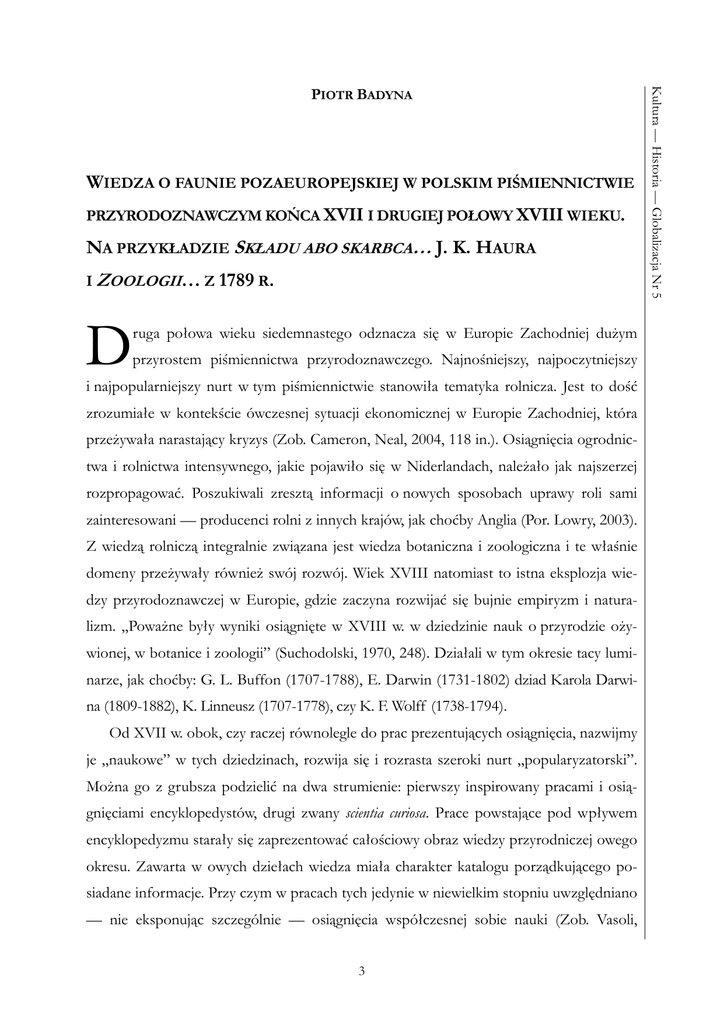 WIEDZA O FAUNIE POZAEUROPEJSKIEJ W POLSKIM PIŚMIENNICTWIE PRZYRODOZNAWCZYM KOŃCA XVII I DRUGIEJ POŁOWY XVIII WIEKU. NA PRZYKŁADZIE SKŁADU ABO SKARBCA… J. K. HAURA I ZOOLOGII… Z 1789 R. D ruga połowa wieku siedemnastego odznacza się w Europie Zachodniej dużym przyrostem piśmiennictwa przyrodoznawczego. Najnośniejszy, najpoczytniejszy i najpopularniejszy nurt w tym piśmiennictwie stanowiła tematyka rolnicza. Jest to dość zrozumiałe w kontekście ówczesnej sytuacji ekonomicznej w Europie Zachodniej, która przeżywała narastający kryzys (Zob. Cameron, Neal, 2004, 118 in.). Osiągnięcia ogrodnictwa i rolnictwa intensywnego, jakie pojawiło się w Niderlandach, należało jak najszerzej rozpropagować. Poszukiwali zresztą informacji o nowych sposobach uprawy roli sami zainteresowani — producenci rolni z innych krajów, jak choćby Anglia (Por. Lowry, 2003). Z wiedzą rolniczą integralnie związana jest wiedza botaniczna i zoologiczna i te właśnie domeny przeżywały również swój rozwój. Wiek XVIII natomiast to istna eksplozja wiedzy przyrodoznawczej w Europie, gdzie zaczyna rozwijać się bujnie empiryzm i naturalizm. „Poważne były wyniki osiągnięte w XVIII w. w dziedzinie nauk o przyrodzie ożywionej, w botanice i zoologii” (Suchodolski, 1970, 248). Działali w tym okresie tacy luminarze, jak choćby: G. L. Buffon (1707-1788), E. Darwin (1731-1802) dziad Karola Darwina (1809-1882), K. Linneusz (1707-1778), czy K. F. Wolff (1738-1794). Od XVII w. obok, czy raczej równolegle do prac prezentujących osiągnięcia, nazwijmy je „naukowe” w tych dziedzinach, rozwija się i rozrasta szeroki nurt „popularyzatorski”. Można go z grubsza podzielić na dwa strumienie: pierwszy inspirowany pracami i osiągnięciami encyklopedystów, drugi zwany scientia curiosa. Prace powstające pod wpływem encyklopedyzmu starały się zaprezentować całościowy obraz wiedzy przyrodniczej owego okresu. Zawarta w owych dziełach wiedza miała charakter katalogu porządkującego posiadane informacje. Przy czym w pracach tych jedynie w niewielkim stopniu uwzględniano — nie eksponując szczególnie — osiągnięcia współczesnej sobie nauki (Zob. Vasoli, 3 Kultura — Historia — Globalizacja Nr 5 PIOTR BADYNA Piotr Badyna, Wiedza o faunie pozaeuropejskiej… 1987). Dużą poczytnością cieszyły się również prace powstające w konwencji scientiów curiosów. Zawierały one dane dotyczące przyrody ożywionej i nie ożywionej w formie zbioru ciekawostek. Wiele z tych prac prezentowało informacje na poły sensacyjne, których zadaniem było zainteresowanie czytelnika i przykucie jego uwagi. Adresowano je często do odbiorców o wykształceniu humanistycznym, uczniów kolegiów i łacińskich szkół retorycznych (Bieńkowski, Dobrzycki, 1998, 82 in.). Scientia curiosa swój rozkwit i największą świetność w Europie przeżywały od połowy XVII do początków XVIII stulecia. Wraz z rozwojem i pogłębianiem wiedzy przyrodoznawczej opartej na empiryzmie zmienił się również nurt popularyzujący osiągnięcia nauki. Coraz rzadziej autorzy tego typu prac sięgali po niesprawdzone i empirycznie niezweryfikowane informacje. Starając się raczej uprzystępnić wiedzę stricte naukową nie poszukując już ciekawostek i „sensacji”. Jednak bez względu na to, czy była to nauka sensu stricto (oczywiście należy pamiętać o zrelatywizowaniu pojęcia nauka do danego czasu), czy też któryś z nurtów jej popularyzacji, ogromnym zainteresowaniem cieszyły się tak w wieku XVII-tym jak i XVIII-tym informacje o faunie i florze krajów egzotycznych. Na kilku wybranych przykładach chciałbym przyjrzeć się jak prezentowano wiedzę o faunie pozaeuropejskiej w polskim piśmiennictwie przyrodoznawczym XVII i XVIII w. Skoncentruję się tu na dwóch właściwie przykładach: J. K. Haur, Skład abo skarbiec znakomitych sekretów ekonomiej ziemiańskiej wyd. z 1693 r., oraz anonimowo wydanej Zoologii czyli zwierzęto piśmie dla szkół narodowych wyd. 1789 r. Postaram się zestawić te prace pod kątem informacji dotyczących tych samych zwierząt. Jakub Kazimierz Haur był autorem najpoczytniejszych poradników gospodarskich (Ekonomika ziemiańska z 1675 oraz wspomniany wcześniej Skład abo skarbiec… z 1693 r.) w końcu XVII i pierwszej połowie XVIII stulecia (Zob. Podraza, 1961; Kowalski, 2000). Prace jego były kilkakrotnie wznawiane na przestrzeni ponad pięćdziesięciu lat (przykładowo Ekonomikę… wydano w 1730 i 1744 r.). Zawarte w jego pracach informacje współkształtowały więc ogląd egzotycznego, obcego świata wielu Sarmatów. W pracy Skład abo skarbiec… Jakub. K. Haur cały traktat XXI poświęcił zwierzętom egzotycznym i magicznym. Notabene te ostatnie traktował równie realnie jak te pierwsze. Brak w jego pracy jakiejkolwiek idei w układzie prezentowanych zwierząt. Przemieszane są ze sobą ssaki, gady i ptaki, pomiędzy którymi pomieszczono informacje o takich „zwie- 4 prezentacji niektórych zwierząt egzotycznych. Zacznijmy od największego lądowego ssaka, a więc słonia. Jak pisał Haur jest to zwierz ogromny rozmiarami, ale wielki też sercem i przyozdobiony wieloma cnotami. Żyje wg Haura w Azji, Afryce, Ameryce i Indiach, i co ciekawe „(…) języki rozumie wszystkie, według którego kraju, jako gdzie gadają” (Haur, 1693, 320). Słoń jest delikatny, sprawiedliwy, opiekuje się swoim potomstwem i słabszymi w stadzie. Ma doskonałą pamięć i dlatego, jeśli ludzie postępują z nim dobrze, on im się odpłaca miłością. Słonie nawet tę mają zdolność, że potrafią rozpoznać władców ziem, na których żyją. Więc gdy jakiś król lub inny monarcha jedzie, słoń czuje przymus, by mu się pokłonić (sic!). Słonie — wg Haura — boją się myszy, a to dlatego, że mają wielkie uszy, do których owe gryzonie wchodzą, gryzą je i szurają, czym mogą je doprowadzić do śmierci. Dlatego też słonie ko