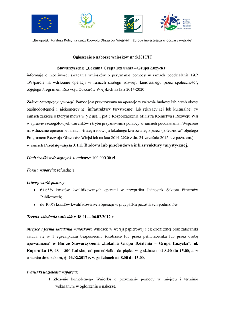 „Europejski Fundusz Rolny na rzecz Rozwoju Obszarów Wiejskich: Europa inwestująca w obszary wiejskie” Ogłoszenie o naborze wniosków nr 5/2017/IT Stowarzyszenie „Lokalna Grupa Działania – Grupa Łużycka” informuje o możliwości składania wniosków o przyznanie pomocy w ramach poddziałania 19.2 „Wsparcie na wdrażanie operacji w ramach strategii rozwoju kierowanego przez społeczność”, objętego Programem Rozwoju Obszarów Wiejskich na lata 2014-2020. Zakres tematyczny operacji: Pomoc jest przyznawana na operacje w zakresie budowy lub przebudowy ogólnodostępnej i niekomercyjnej infrastruktury turystycznej lub rekreacyjnej lub kulturalnej (w ramach zakresu o którym mowa w § 2 ust. 1 pkt 6 Rozporządzenia Ministra Rolnictwa i Rozwoju Wsi w sprawie szczegółowych warunków i trybu przyznawania pomocy w ramach poddziałania „Wsparcie na wdrażanie operacji w ramach strategii rozwoju lokalnego kierowanego przez społeczność” objętego Programem Rozwoju Obszarów Wiejskich na lata 2014-2020 z dn. 24 września 2015 r. z późn. zm.), w ramach Przedsięwzięcia 3.1.1. Budowa lub przebudowa infrastruktury turystycznej. Limit środków dostępnych w naborze: 100 000,00 zł. Forma wsparcia: refundacja. Intensywność pomocy: 63,63% kosztów kwalifikowanych operacji w przypadku Jednostek Sektora Finansów Publicznych; do 100% kosztów kwalifikowanych operacji w przypadku pozostałych podmiotów. Termin składania wniosków: 18.01. – 06.02.2017 r. Miejsce i forma składania wniosków: Wniosek w wersji papierowej i elektronicznej oraz załączniki składa się w 1 egzemplarzu bezpośrednio (osobiście lub przez pełnomocnika lub przez osobę upoważnioną) w Biurze Stowarzyszenia „Lokalna Grupa Działania – Grupa Łużycka”, ul. Kopernika 19, 68 – 300 Lubsko, od poniedziałku do piątku w godzinach od 8.00 do 15.00, a w ostatnim dniu naboru, tj. 06.02.2017 r. w godzinach od 8.00 do 13.00. Warunki udzielenia wsparcia: 1. Złożenie kompletnego Wniosku o przyznanie pomocy w miejscu i terminie wskazanym w ogłoszeniu o naborze. „Europejski Fundusz Rolny na rzecz Rozwoju Obszarów Wiejskich: Europa inwestująca w obszary wiejskie” 2. Zgodność zakresu tematycznego planowanej operacji z zakresem tematycznym wskazanym w ogłoszeniu o naborze. 3. Spełnienie warunków udzielenia wsparcia obowiązujących w ramach naboru: a) operacja realizuje cele główne i szczegółowe LSR, przez osiągnięcie zaplanowanych w LSR wskaźników (zgodnie z załącznikiem nr 1 do ogłoszenia); b) złożenie wszystkich obligatoryjnych dokumentów zgodnie z „Listą wymaganych dokumentów” (zgodnie z załącznikiem nr 2 do ogłoszenia) potwierdzających spełnienie warunków udzielenia wsparcia oraz lokalnych kryteriów wyboru operacji. 4. Zgodność operacji z LSR, w tym zgodność z warunkami przyznania pomocy określonymi w PROW na lata 2014-2020. 5. Uzyskanie wymaganego minimum punktowego określonego w lokalnych kryteriach wyboru operacji (zgodnie z załącznikiem nr 3 do ogłoszenia), tj. uzyskanie minimum 40 pkt., a w przypadku Jednostek Sektora Finansów Publicznych minimum 34 pkt. Pozostałe warunki udzielenia wsparcia określa Rozporządzenie Ministra Rolnictwa i Rozwoju Wsi w sprawie szczegółowych warunków i trybu przyznawania pomocy w ramach poddziałania „Wsparcie na wdrażanie operacji w ramach strategii rozwoju lokalnego kierowanego przez społeczność” objętego Programem Rozwoju Obszarów Wiejskich na lata 2014-2020 z dn. 24 września 2015 r. z późn. zm. Informacja o miejscu udostępnienia dokumentów: Formularz wniosku o udzielenie wsparcia oraz wszystkie dokumenty aplikacyjne; Lokalne kryteria wyboru operacji wraz z opisem; Lista wymaganych dokumentów potwierdzających spełnienie warunków udzielenia wsparcia oraz lokalnych kryteriów wyboru operacji; znajdują się na stronie internetowej www.grupaluzycka.pl, w zakładce NABORY 2014-2020 – NABÓR nr 5/2017/IT. Lokalna Strategia Rozwoju na lata 2014-2020 Stowarzyszenia „Lokalna Grupa Działania – Grupa Łużycka” (LSR) znajduje się na stronie internetowej www.grupaluzycka.pl, w zakładce NABORY 2014-2020 – LSR; Procedura wyboru i oceny operacji w ramach LSR znajduje się na stronie internetowej www.grupaluzycka.pl, w zakładce NABORY 2014-2020 – PROCEDURA. „Europejski Fundusz Rolny na rzecz Rozwoju Obszarów Wiejskich: Europa inwestująca w obszary wiejskie” Szczegółowe informacje dotyczące naboru udzielane są w Biurze Stowarzyszenia „Lokalna Grupa Działania – Grupa Łużycka”, ul. Kopernika 19, 68 – 300 Lubsko lub telefonicznie pod numerem 68 457 61 51. Załączniki: 1. Cel ogólny i szczegółowy LSR oraz przedsięwzięcie wraz ze wskazaniem planowanych do osiągnięcia w ramach naboru wniosków o przyznanie pomocy wskaźników. 2. Lista wymaganych dokumentów. 3. Lokalne kryteria wyboru operacji.