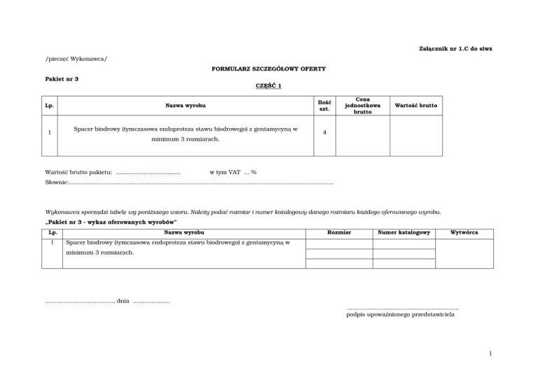 Załącznik nr 1.C do siwz /pieczęć Wykonawca/ FORMULARZ SZCZEGÓŁOWY OFERTY Pakiet nr 3 CZĘŚĆ 1 Lp. 1 Ilość szt. Nazwa wyrobu Spacer biodrowy (tymczasowa endoproteza stawu biodrowego) z gentamycyną w Cena jednostkowa brutto Wartość brutto 4 minimum 3 rozmiarach. Wartość brutto pakietu: .................................., w tym VAT ... % Słownie:................................................................................................................................................ Wykonawca sporządzi tabelę wg poniższego wzoru. Należy podać rozmiar i numer katalogowy danego rozmiaru każdego oferowanego wyrobu. „Pakiet nr 3 - wykaz oferowanych wyrobów” Lp. 1 Nazwa wyrobu Rozmiar Numer katalogowy Wytwórca Spacer biodrowy (tymczasowa endoproteza stawu biodrowego) z gentamycyną w minimum 3 rozmiarach. ....................................., dnia .................... ............................................................. podpis upoważnionego przedstawiciela 1 CZĘŚĆ 2 Wymagany „bank” Lp. Wyszczególnienie Ilość Spacer biodrowy (tymczasowa endoporteza stawu biodrowego) z gentamycyną w 1 minimum 3 rozmiarach. Wyroby w pełnym zakresie wymiarów Wykaz składu „banku” Wykonawca sporządzi tabelę – Wykaz składu „banku”. Wykaz rubryk w tabeli: lp. nazwa wyrobu wraz z podziałem na rozmiary cena jednostkowa brutto nr katalogowy wytwórca oferowana ilość sztuk w zestawie „banku” ....................................., dnia .................... ............................................................. podpis upoważnionego przedstawiciela 2 CZĘŚĆ 3 Wykaz: instrumentarium udostępnione nieodpłatnie na czas obowiązywania umowy Wykonawca sporządzi tabelę – Wykaz instrumentarium udostępnione nieodpłatnie na czas obowiązywania umowy. Wykaz rubryk w tabeli: - lp. nazwa narzędzia nr katalogowy wytwórca ilość sztuk w zestawie Instrumentarium musi być kompatybilne z wyrobami wymienionymi w części 1. Wymagania dotyczące instrumentarium podano w części C SIWZ, instrumentarium. ....................................., dnia .................... ............................................................. podpis upoważnionego przedstawiciela 3