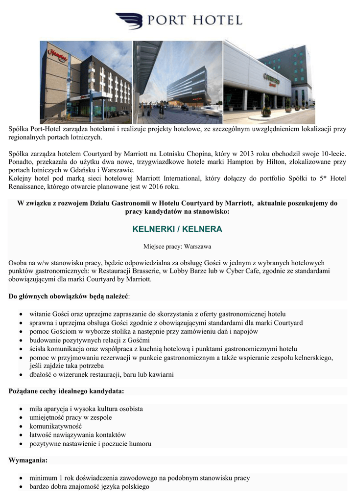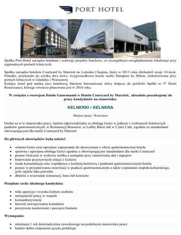 Spółka Port-Hotel zarządza hotelami i realizuje projekty hotelowe, ze szczególnym uwzględnieniem lokalizacji przy regionalnych portach lotniczych. Spółka zarządza hotelem Courtyard by Marriott na Lotnisku Chopina, który w 2013 roku obchodził swoje 10-lecie. Ponadto, przekazała do użytku dwa nowe, trzygwiazdkowe hotele marki Hampton by Hilton, zlokalizowane przy portach lotniczych w Gdańsku i Warszawie. Kolejny hotel pod marką sieci hotelowej Marriott International, który dołączy do portfolio Spółki to 5* Hotel Renaissance, którego otwarcie planowane jest w 2016 roku. W związku z rozwojem Działu Gastronomii w Hotelu Courtyard by Marriott, aktualnie poszukujemy do pracy kandydatów na stanowisko: KELNERKI / KELNERA Miejsce pracy: Warszawa Osoba na w/w stanowisku pracy, będzie odpowiedzialna za obsługę Gości w jednym z wybranych hotelowych punktów gastronomicznych: w Restauracji Brasserie, w Lobby Barze lub w Cyber Cafe, zgodnie ze standardami obowiązującymi dla marki Courtyard by Marriott. Do głównych obowiązków będą należeć: witanie Gości oraz uprzejme zapraszanie do skorzystania z oferty gastronomicznej hotelu sprawna i uprzejma obsługa Gości zgodnie z obowiązującymi standardami dla marki Courtyard pomoc Gościom w wyborze stolika a następnie przy zamówieniu dań i napojów budowanie pozytywnych relacji z Gośćmi ścisła komunikacja oraz współpraca z kuchnią hotelową i punktami gastronomicznymi hotelu pomoc w przyjmowaniu rezerwacji w punkcie gastronomicznym a także wspieranie zespołu kelnerskiego, jeśli zajdzie taka potrzeba dbałość o wizerunek restauracji, baru lub kawiarni Pożądane cechy idealnego kandydata: miła aparycja i wysoka kultura osobista umiejętność pracy w zespole komunikatywność łatwość nawiązywania kontaktów pozytywne nastawienie i poczucie humoru Wymagania: minimum 1 rok doświadczenia zawodowego na podobnym stanowisku pracy bardzo dobra znajomość języka polskiego komunikatywna znajomość języka angielskiego, znajomość innych języków obcych mile widziana gotowość do pracy w systemie zmianowym, w tym w godzinach nocnych wymagana książeczka do celów sanitarno-epidemiologicznych Oferujemy: zatrudnienia na podstawie umowy o pracę/ stałe wynagrodzenie zasadnicze uczestnictwo w hotelowym planie premiowym szkolenia w zakresie powierzonego stanowiska pracy oraz inne szkolenia zapewniane przez Pracodawcę atrakcyjny pakiet świadczeń socjalnych, w tym atrakcyjne zniżki na pobyty w hotelach sieci Marriott możliwość korzystania z pakietu świadczeń socjalnych i motywacyjnych (uczestnictwo w programie Multisport, możliwość korzystania z ubezpieczenia grupowego dla pracownika oraz członków rodziny, w tym ubezpieczenie na życie opłacana przez Pracodawcę, pakiety świadczeń medycznych w konkurencyjnych cenach, dofinansowanie w ramach ZFŚS) rozwój zawodowy oraz podnoszenie kwalifikacji pracę w stabilnej i prestiżowej firmie Poszukujemy także absolwentów szkół hotelarskich i gastronomicznych do prac zleconych w charakterze Kelnera / Kelnerki i Hostessy. Osoby zainteresowane prosimy o przesłanie CV i listu motywacyjnego do Małgorzaty Karwackiej na adres email: [email protected] lub faxem: +48 22 650 06 90. W tytule maila prosimy o wpisanie nazwy stanowiska, na które została wysłana aplikacja. Prosimy o dopisanie klauzuli: "Wyrażam zgodę na przetwarzanie moich danych osobowych zawartych w mojej ofercie pracy dla potrzeb niezbędnych do realizacji procesu rekrutacji prowadzanego przez firmę Port - Hotel Sp. z o.o. z siedzibą w Warszawie przy ul. Żwirki i Wigury 1 (zgodnie z Ustawą z dnia 29.08.1997 o ochronie danych osobowych, Dz.U. z 2002 r., nr 101 poz 926, ze zm.) Podanie danych jest dobrowolne. Oświadczam, że zostałem/am poinformowany/na o prawie dostępu do moich danych osobowych, ich poprawiania i aktualizowania.": Uprzejmie informujemy, że skontaktujemy się z wybranymi kandydatami. Pozostałym osobom dziękujemy za zainteresowanie naszą ofertą.