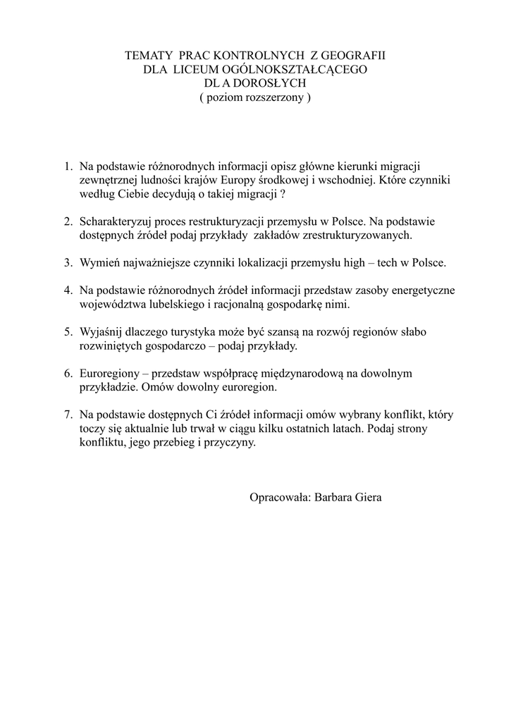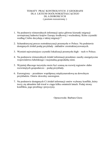 TEMATY PRAC KONTROLNYCH Z GEOGRAFII DLA LICEUM OGÓLNOKSZTAŁCĄCEGO DL A DOROSŁYCH ( poziom rozszerzony ) 1. Na podstawie różnorodnych informacji opisz główne kierunki migracji zewnętrznej ludności krajów Europy środkowej i wschodniej. Które czynniki według Ciebie decydują o takiej migracji ? 2. Scharakteryzuj proces restrukturyzacji przemysłu w Polsce. Na podstawie dostępnych źródeł podaj przykłady zakładów zrestrukturyzowanych. 3. Wymień najważniejsze czynniki lokalizacji przemysłu high – tech w Polsce. 4. Na podstawie różnorodnych źródeł informacji przedstaw zasoby energetyczne województwa lubelskiego i racjonalną gospodarkę nimi. 5. Wyjaśnij dlaczego turystyka może być szansą na rozwój regionów słabo rozwiniętych gospodarczo – podaj przykłady. 6. Euroregiony – przedstaw współpracę międzynarodową na dowolnym przykładzie. Omów dowolny euroregion. 7. Na podstawie dostępnych Ci źródeł informacji omów wybrany konflikt, który toczy się aktualnie lub trwał w ciągu kilku ostatnich latach. Podaj strony konfliktu, jego przebieg i przyczyny. Opracowała: Barbara Giera