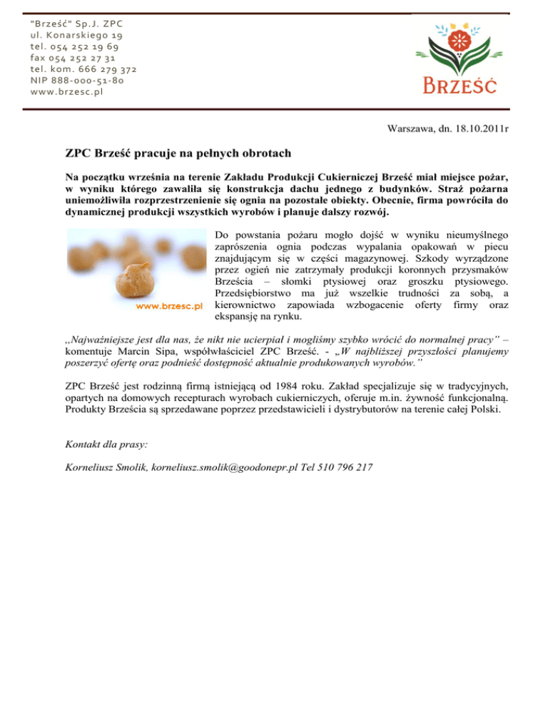 "Brześć " Sp.J. ZPC ul. Konarskiego 19 tel. 054 252 19 69 fax 054 252 27 31 tel. kom. 666 279 3 72 NIP 888-000-51-80 www.brzesc.pl Warszawa, dn. 18.10.2011r ZPC Brześć pracuje na pełnych obrotach Na początku września na terenie Zakładu Produkcji Cukierniczej Brześć miał miejsce pożar, w wyniku którego zawaliła się konstrukcja dachu jednego z budynków. Straż pożarna uniemożliwiła rozprzestrzenienie się ognia na pozostałe obiekty. Obecnie, firma powróciła do dynamicznej produkcji wszystkich wyrobów i planuje dalszy rozwój. Do powstania pożaru mogło dojść w wyniku nieumyślnego zaprószenia ognia podczas wypalania opakowań w piecu znajdującym się w części magazynowej. Szkody wyrządzone przez ogień nie zatrzymały produkcji koronnych przysmaków Brześcia – słomki ptysiowej oraz groszku ptysiowego. Przedsiębiorstwo ma już wszelkie trudności za sobą, a kierownictwo zapowiada wzbogacenie oferty firmy oraz ekspansję na rynku. ,,Najważniejsze jest dla nas, że nikt nie ucierpiał i mogliśmy szybko wrócić do normalnej pracy” – komentuje Marcin Sipa, współwłaściciel ZPC Brześć. - ,,W najbliższej przyszłości planujemy poszerzyć ofertę oraz podnieść dostępność aktualnie produkowanych wyrobów.” ZPC Brześć jest rodzinną firmą istniejącą od 1984 roku. Zakład specjalizuje się w tradycyjnych, opartych na domowych recepturach wyrobach cukierniczych, oferuje m.in. żywność funkcjonalną. Produkty Brześcia są sprzedawane poprzez przedstawicieli i dystrybutorów na terenie całej Polski. Kontakt dla prasy: Korneliusz Smolik, [email protected] Tel 510 796 217