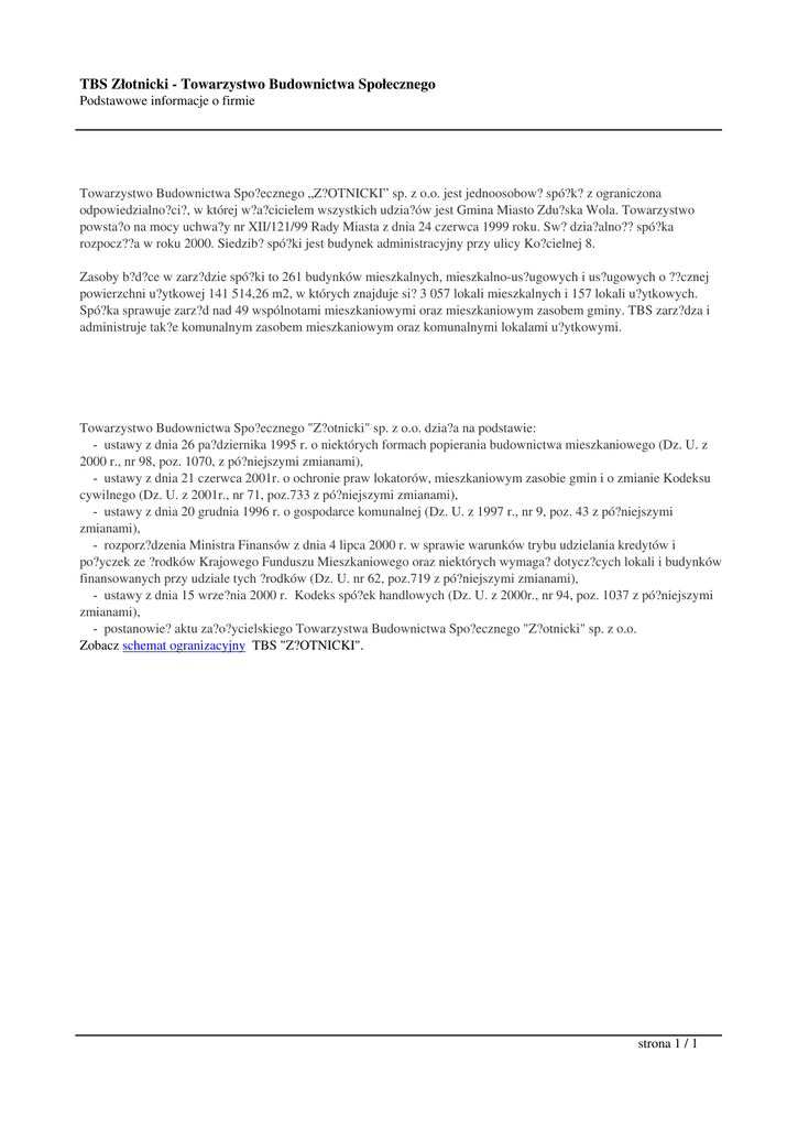 TBS Złotnicki - Towarzystwo Budownictwa Społecznego Podstawowe informacje o firmie Towarzystwo Budownictwa Spo?ecznego „Z?OTNICKI” sp. z o.o. jest jednoosobow? spó?k? z ograniczona odpowiedzialno?ci?, w której w?a?cicielem wszystkich udzia?ów jest Gmina Miasto Zdu?ska Wola. Towarzystwo powsta?o na mocy uchwa?y nr XII/121/99 Rady Miasta z dnia 24 czerwca 1999 roku. Sw? dzia?alno?? spó?ka rozpocz??a w roku 2000. Siedzib? spó?ki jest budynek administracyjny przy ulicy Ko?cielnej 8. Zasoby b?d?ce w zarz?dzie spó?ki to 261 budynków mieszkalnych, mieszkalno-us?ugowych i us?ugowych o ??cznej powierzchni u?ytkowej 141 514,26 m2, w których znajduje si? 3 057 lokali mieszkalnych i 157 lokali u?ytkowych. Spó?ka sprawuje zarz?d nad 49 wspólnotami mieszkaniowymi oraz mieszkaniowym zasobem gminy. TBS zarz?dza i administruje tak?e komunalnym zasobem mieszkaniowym oraz komunalnymi lokalami u?ytkowymi. Towarzystwo Budownictwa Spo?ecznego "Z?otnicki" sp. z o.o. dzia?a na podstawie: - ustawy z dnia 26 pa?dziernika 1995 r. o niektórych formach popierania budownictwa mieszkaniowego (Dz. U. z 2000 r., nr 98, poz. 1070, z pó?niejszymi zmianami), - ustawy z dnia 21 czerwca 2001r. o ochronie praw lokatorów, mieszkaniowym zasobie gmin i o zmianie Kodeksu cywilnego (Dz. U. z 2001r., nr 71, poz.733 z pó?niejszymi zmianami), - ustawy z dnia 20 grudnia 1996 r. o gospodarce komunalnej (Dz. U. z 1997 r., nr 9, poz. 43 z pó?niejszymi zmianami), - rozporz?dzenia Ministra Finansów z dnia 4 lipca 2000 r. w sprawie warunków trybu udzielania kredytów i po?yczek ze ?rodków Krajowego Funduszu Mieszkaniowego oraz niektórych wymaga? dotycz?cych lokali i budynków finansowanych przy udziale tych ?rodków (Dz. U. nr 62, poz.719 z pó?niejszymi zmianami), - ustawy z dnia 15 wrze?nia 2000 r. Kodeks spó?ek handlowych (Dz. U. z 2000r., nr 94, poz. 1037 z pó?niejszymi zmianami), - postanowie? aktu za?o?ycielskiego Towarzystwa Budownictwa Spo?ecznego "Z?otnicki" sp. z o.o. Zobacz schemat ogranizacyjny TBS "Z?OTNICKI". strona 1 / 1