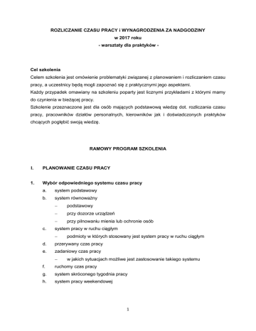 ROZLICZANIE CZASU PRACY i WYNAGRODZENIA ZA NADGODZINY w 2017 roku - warsztaty dla praktyków - Cel szkolenia Celem szkolenia jest omówienie problematyki związanej z planowaniem i rozliczaniem czasu pracy, a uczestnicy będą mogli zapoznać się z praktycznymi jego aspektami. Każdy przypadek omawiany na szkoleniu poparty jest licznymi przykładami z którymi mamy do czynienia w bieżącej pracy. Szkolenie przeznaczone jest dla osób mających podstawową wiedzę dot. rozliczania czasu pracy, pracowników działów personalnych, kierowników jak i doświadczonych praktyków chcących pogłębić swoją wiedzę. RAMOWY PROGRAM SZKOLENIA I. PLANOWANIE CZASU PRACY 1. Wybór odpowiedniego systemu czasu pracy a. system podstawowy b. system równoważny c. podstawowy przy dozorze urządzeń przy pilnowaniu mienia lub ochronie osób system pracy w ruchu ciągłym podmioty w których stosowany jest system pracy w ruchu ciągłym d. przerywany czas pracy e. zadaniowy czas pracy w jakich sytuacjach możliwe jest zastosowanie takiego systemu f. ruchomy czas pracy g. system skróconego tygodnia pracy h. system pracy weekendowej 1 2. 3. Wymiar i normy czasu pracy a. wymiar czasu pracy w 2017 r. dla pracownika pełno i niepełnoetatowego b. wskazanie obowiązujących normy czasu pracy w informacji dodatkowej c. zasada przeciętnie pięciodniowego tygodnia pracy Czas pracy pracowników niepełnosprawnych a. normy czasu pracy osób niepełnosprawnych b. niepełnosprawny zatrudniony w niepełnym wymiarze czasu pracy c. możliwości wykonywania pracy w godzinach nadliczbowych i porze nocnej d. wysokość wynagrodzenia niepełnosprawnego objętego obniżonymi normami czasu pracy e. 4. przerwy pomiędzy okresami niepełnosprawności a wysokość wynagrodzenia Praca w niedziele i święta a. czy w każdej sytuacji pracodawca może zaplanować lub zlecić pracę w niedziele b. co spowoduje ustalenie innych godzin pracy w niedziele niż kodeksowe c. zaplanowałeś pracę w niedzielę, kiedy należy udzielić pracownikowi dnia wolnego 5. d. jak postąpić w sytuacji, kiedy dzień wolny nie został udzielony pracownikowi e. jak powinien wyglądać rozkład czasu pracy przewidujący pracę w niedzielę f. czy możemy pracownikowi zaplanować każdą niedzielę w pracy ? Sporządzanie rozkładów czasu pracy a. w jakich sytuacjach powstaje obowiązek tworzenia rozkładów czasu pracy b. w jakiej formie i na jaki okres należy stworzyć rozkład czasu pracy c. w jaki sposób i w jakim terminie należy przekazać rozkład czasu pracy pracownikowi d. kiedy pracodawca będzie zwolniony ze sporządzania rozkładów czasu pracy e. kiedy pracodawca będzie miał możliwość zmiany rozkładu czasu pracy aktualne stanowisko PIP oraz MRPiPS f. jakie zasady muszą być zachowane aby rozkład czasu pracy nie był zakwestionowany przez PIP ? 2 6. Odpracowanie wyjść prywatnych a. wniosek o wyjście prywatne b. możliwość odpracowania wyjścia prywatnego: c. kobiet w ciąży pracowników niepełnosprawnych na bazie wyjaśnień GIP pracowników młodocianych odpracowanie wyjścia prywatnego w innym miesiącu a prawidłowe rozliczenie wynagrodzenia II. ROZLICZENIE CZASU PRACY 1. Zatrudnienie lub zwolnienie w trakcie okresu rozliczeniowego a. rozwiązanie umowy o pracę w trakcie okresu rozliczeniowego skutkujące wypłatą dodatkowego wynagrodzenia wraz z dodatkiem b. prawidłowe ustalenie stawki godzinowej (wymiar czy rozkład czasu pracy) c. niedopracowanie godzin w związku z nierównomiernym rozkładem czasu pracy na poszczególne miesiące danego okresu rozliczeniowego d. w jakiej wysokości wypłacić dodatek do wynagrodzenia ? – Stanowisko Państwowej Inspekcji Pracy 2. Rozliczanie pracy w godzinach nadliczbowych a. która godzina będzie godziną nadliczbową dla pracownika niepełnoetatowego b. obliczanie przekroczeń godzin ponadwymiarowych dobowych i średniotygodniowych c. przekroczenie godzin ponadwymiarowych a prawidłowe ustalenie dodatku do wynagrodzenia d. konsekwencje nieokreślenia limitu godzin e. pracownik składa wniosek o odebranie czasu wolnego za nadgodziny f. wskazanie pracownikowi termin odbioru czasu wolnego za nadgodziny g. jak rozliczyć wynagrodzenie w przypadku odbioru czasu wolnego w innym miesiącu h. jakie dodatki do wynagrodzenia przysługują pracownikowi za pracę w godzinach nadliczbowych i. prawidłowe ustalenie nadgodzin „dobowych i średniotygodniowych” a wysokość dodatku: wcześniejsze wezwanie pracownika do pracy 3 wezwanie pracownika do pracy w dniu wolnym a przekroczenie normy dobowej wezwanie pracownika do pracy w dniu wolnym z tytułu przeciętnie pięciodniowego tygodnia pracy a przekroczenie normy dobowej wezwanie pracownika do pracy w niedziele i święto a przekroczenie normy dobowej planowana praca w niedziele i święto a przekroczenie normy dobowej wezwanie do pracy pracownika zatrudnionego w niepełnym wymiarze czasu pracy a naruszenie limitu godzin ponadwymiarowych i norm czasu pracy j. pojęcie dnia wolnego od pracy: w jakich godzinach przypada dzień wolny za pracę w niedzielę – święto i dniu wolnym z tytułu przeciętnie pięciodniowego tygodnia pracy 3. Jak nieobecności w pracy wpływają na kwalifikację nadgodzin a. omówienie najnowszego stanowiska MRPiPS z września 2016 r. b. opieka nad dzieckiem na część dnia (wymiar godzinowy) a zlecenie dodatkowej pracy w tym dniu c. udzielenie czasu wolnego za nadgodziny na część dnia a zlecenie dodatkowej pracy w tym dniu d. wcześniejsze wezwanie pracownika do pracy po urlopie wypoczynkowym 4