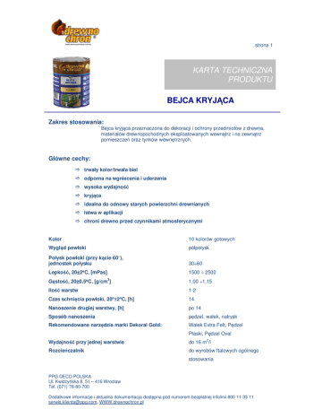 strona 1 KARTA TECHNICZNA PRODUKTU BEJCA KRYJĄCA Zakres stosowania: Bejca kryjąca przeznaczona do dekoracji i ochrony przedmiotów z drewna, materiałów drewnopochodnych eksploatowanych wewnątrz i na zewnątrz pomieszczeń oraz tynków wewnętrznych. Główne cechy: trwały kolor/trwała biel odporna na wgniecenia i uderzenia wysoka wydajność kryjąca idealna do odnowy starych powierzchni drewnianych łatwa w aplikacji chroni drewno przed czynnikami atmosferycznymi Kolor 10 kolorów gotowych Wygląd powłoki półpołysk Połysk powłoki (przy kącie 60°), jednostek połysku 30÷60 Lepkość, 20± ±2°° C, [mPas] 1500 ÷ 2500 3 Gęstość, 20± ±0,5°° C, [g/cm ] 1,00 ÷1,15 Ilość warstw 1-2 Czas schnięcia powłoki, 20°°±2°°C, [h] 14 Nanoszenie drugiej warstwy, [h] po 14 Sposób nanoszenia pędzel, wałek, natrysk Rekomendowane narzędzia marki Dekoral Gold: Wałek Extra Felt, Pędzel Płaski, Pędzel Oval 2 Wydajność przy jednej warstwie do 16 m /l Rozcieńczalnik do wyrobów ftalowych ogólnego stosowania PPG DECO POLSKA Ul. Kwidzyńska 8, 51 – 416 Wrocław Tel. (071) 78-80-700 Dodatkowe informacje i aktualna dokumentacja dostępna pod numerem bezpłatnej infolinii 800 11 33 11 [email protected], WWW.drewnochron.pl strona 2 Sposób użycia 1.Przygotowanie podłoża • Tynki wewnętrzne zagruntuj GRUNTOMALEM marki Dekoral. Drewno surowe: • • • • Z podłoża przeznaczonego do malowania należy usunąć wszelkie zabrudzenia, nierówności, odtłuścić i wysuszyć. Podłoża eksploatowane na zewnątrz zagruntuj DREWNOCHRONEM IMPREGNATEM bezbarwnym. Jako farbę podkładową zalecamy zastosować GRUNTOMAL marki Dekoral. Wewnątrz pomieszczeń bejca może być nanoszona bezpośrednio na surowe drewno lub uprzednio zagruntowane POKOSTEM marki Drewnochron. Drewno wcześniej malowane: • Stare powłoki zmatuj papierem ściernym i odpyl. Usuń powłoki złuszczone i spękane. 2. Malowanie • • • • Przed użyciem wyrób należy dokładnie wymieszać. Niewłaściwe wymieszanie wyrobu może powodować różnice w kolorze oraz stopniu połysku finalnej powłoki. W razie potrzeby rozcieńczyć dodatkiem max 2% obj. rozcieńczalnika. Malować za pomocą pędzla, wałka lub natrysku. Zaleca się nakładanie 1-2 warstw. Nanoszenie kolejnej warstwy zaleca się po 14 h. 3. Dodatkowe informacje • • • • • • 0 0 Maluj w temperaturze powietrza i podłoża od +10 C do +25 C. Niska temperatura, zawyżona wilgotność powietrza wydłużają czas schnięcia powłoki. Temperatura podłoża powinna być wyższa od punktu rosy o przynajmniej 3 0C. Po zakończeniu malowania narzędzia umyj rozcieńczalnikiem. Wyrób przechowuj w opakowaniach szczelnie zamkniętych, z dala od źródeł ognia i ciepła w pomieszczeniach zamkniętych. W trakcie prac malarskich i po ich zakończeniu pomieszczenia wywietrz intensywnie do zaniku specyficznego zapachu. Farby w różnych kolorach mogą być mieszane ze sobą w celu uzyskania innego koloru. Producent wyrobu nie odpowiada za jakość powłok w przypadku nie zastosowania się do zaleceń zawartych w niniejszej karcie. 4. Wskazówki BHP i PPOŻ • • Stosować się do zaleceń podanych na opakowaniu. Szczegółowe informacje zamieszczone są w www.drewnochron.pl Norma: Atesty: PKWiU: Data ważności: Karcie Charakterystyki na stronie ZN-PPGDP-202 Posiada Atest Higieniczny PZH 20.30.12.0 36 miesięcy od daty produkcji Limit zawartości LZO wg Dyrektywy 2004/42/WE dla tego produktu (kat. A/e/FR): 400 g/l (2010). Produkt zawiera max. 400 g/l. Opakowanie handlowe 0,9 L, 5 L, 10 L PPG DECO POLSKA Ul. Kwidzyńska 8, 51 – 416 Wrocław Tel. (071) 78-80-700 Dodatkowe informacje i aktualna dokumentacja dostępna pod numerem bezpłatnej infolinii 800 11 33 11 [email protected], WWW.drewnochron.pl