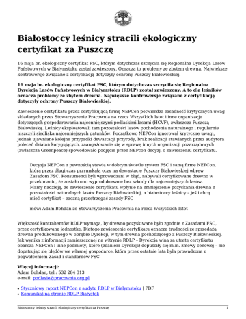 Białostoccy leśnicy stracili ekologiczny certyfikat za Puszczę 16 maja br. ekologiczny certyfikat FSC, którym dotychczas szczyciła się Regionalna Dyrekcja Lasów Państwowych w Białymstoku został zawieszony. Oznacza to problemy ze zbytem drewna. Największe kontrowersje związane z certyfikacją dotyczyły ochrony Puszczy Białowieskiej. 16 maja br. ekologiczny certyfikat FSC, którym dotychczas szczyciła się Regionalna Dyrekcja Lasów Państwowych w Białymstoku (RDLP) został zawieszony. A to dla leśników oznacza problemy ze zbytem drewna. Największe kontrowersje związane z certyfikacją dotyczyły ochrony Puszczy Białowieskiej. Zawieszenie certyfikatu przez certyfikującą firmę NEPCon potwierdza zasadność krytycznych uwag składanych przez Stowarzyszenie Pracownia na rzecz Wszystkich Istot i inne organizacje dotyczących gospodarowania najcenniejszymi podlaskimi lasami (HCVF), zwłaszcza Puszczą Białowieską. Leśnicy eksploatowali tam pozostałości lasów pochodzenia naturalnego i regularnie niszczyli siedliska najcenniejszych gatunków. Początkowo NEPCon ignorował krytyczne uwagi, jednak ujawniane kolejne przypadki dewastacji przyrody, brak realizacji stawianych przez audytora poleceń działań korygujących, zaangażowanie się w sprawę innych organizacji pozarządowych (zwłaszcza Greenpeace) spowodowało podjęcie przez NEPcon decyzji o zawieszeniu certyfikatu. Decyzja NEPCon z pewnością stawia w dobrym świetle system FSC i samą firmę NEPCon, która przez długi czas przymykała oczy na dewastację Puszczy Białowieskiej wbrew Zasadom FSC. Konsumenci byli wprowadzani w błąd, nabywali certyfikowane drewno w przekonaniu, że zostało ono wyprodukowane bez szkody dla najcenniejszych lasów. Mamy nadzieję, że zawieszenie certyfikatu wpłynie na zmniejszenie pozyskania drewna z pozostałości naturalnych lasów Puszczy Białowieskiej, a białostoccy leśnicy – jeśli chcą mieć certyfikat – zaczną przestrzegać zasady FSC mówi Adam Bohdan ze Stowarzyszenia Pracownia na rzecz Wszystkich Istot Większość kontrahentów RDLP wymaga, by drewno pozyskiwane było zgodnie z Zasadami FSC, przez certyfikowaną jednostkę. Dlatego zawieszenie certyfikatu oznacza trudności ze sprzedażą drewna produkowanego w obrębie Dyrekcji, w tym drewna pochodzącego z Puszczy Białowieskiej. Jak wynika z informacji zamieszczonej na witrynie RDLP – Dyrekcja winą za utratę certyfikatu obarcza NEPCon i inne podmioty, które (zdaniem Dyrekcji) dopuściły się m.in. zmowy cenowej – nie dopatrując się błędów we własnej gospodarce, która przez ostatnie lata była prowadzona z pogwałceniem Zasad i standardów FSC. Więcej informacji: Adam Bohdan, tel.: 532 284 313 e-mail: [email protected] ● ● Styczniowy raport NEPCon z audytu RDLP w Białymstoku | PDF Komunikat na stronie RDLP Białystok Białostoccy leśnicy stracili ekologiczny certyfikat za Puszczę 1 ● Uwagi Pracowni dotyczące certyfikacji RDLP Białystok (Dzikie Życie, nr 2, 2010) Białostoccy leśnicy stracili ekologiczny certyfikat za Puszczę 2