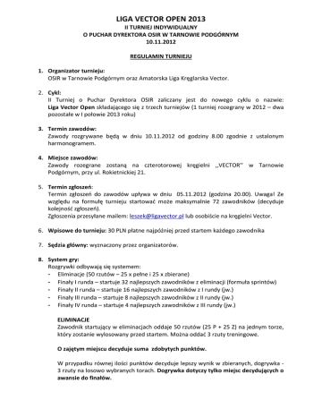 LIGA VECTOR OPEN 2013 II TURNIEJ INDYWIDUALNY O PUCHAR DYREKTORA OSIR W TARNOWIE PODGÓRNYM 10.11.2012 REGULAMIN TURNIEJU 1. Organizator turnieju: OSIR w Tarnowie Podgórnym oraz Amatorska Liga Kręglarska Vector. 2. Cykl: II Turniej o Puchar Dyrektora OSIR zaliczany jest do nowego cyklu o nazwie: Liga Vector Open składającego się z trzech turniejów (1 turniej rozegrany w 2012 – dwa pozostałe w I połowie 2013 roku) 3. Termin zawodów: Zawody rozgrywane będą w dniu 10.11.2012 od godziny 8.00 zgodnie z ustalonym harmonogramem. 4. Miejsce zawodów: Zawody rozegrane zostaną na czterotorowej kręgielni ,,VECTOR’’ w Tarnowie Podgórnym, przy ul. Rokietnickiej 21. 5. Termin zgłoszeń: Termin zgłoszeń do zawodów upływa w dniu 05.11.2012 (godzina 20.00). Uwaga! Ze względu na formułę turnieju startować może maksymalnie 72 zawodników (decyduje kolejność zgłoszeń). Zgłoszenia przesyłane mailem: [email protected] lub osobiście na kręgielni Vector. 6. Wpisowe do turnieju: 30 PLN płatne najpóźniej przed startem każdego zawodnika 7. Sędzia główny: wyznaczony przez organizatorów. 8. System gry: Rozgrywki odbywają się systemem: - Eliminacje (50 rzutów – 25 x pełne i 25 x zbierane) - Finały I runda – startuje 32 najlepszych zawodników z eliminacji (formuła sprintów) - Finały II runda – startuje 16 najlepszych zawodników z I rundy (jw.) - Finały III runda – startuje 8 najlepszych zawodników z II rundy (jw.) - Finały IV runda – startuje 4 najlepszych zawodników z III rundy (jw.) ELIMINACJE Zawodnik startujący w eliminacjach oddaje 50 rzutów (25 P + 25 Z) na jednym torze, który zostanie wylosowany przed startem. Można oddać 3 rzuty treningowe. O zajętym miejscu decyduje suma zdobytych punktów. W przypadku równej ilości punktów decyduje lepszy wynik w zbieranych, dogrywka 3 rzuty na losowo wybranych torach. Dogrywka dotyczy tylko miejsc decydujących o awansie do finałów. FINAŁY Zawodnik startujący w rundach finałowych oddaje 20 rzutów (10 P + 10 Z) na jednym torze zgodnie z zajmowanym miejscem. Zawodnicy starują w odwrotnej kolejności do zajętych miejsc. Nie ma rzutów treningowych. O zajętym miejscu decyduje suma poszczególnych rundach finałowych. zdobytych punktów w eliminacjach i W przypadku równej ilości punktów decyduje dogrywka - 3 rzuty na losowo wybranych torach. Dogrywka dotyczy tylko miejsc decydujących o awansie do dalszej rundy finałowej i o zajętym miejscu od 1 do 6. − − − − − − − − − Punktacja za turnieje w cyklu Liga Vector Open 2013. 1 miejsce 100 pkt. 2 miejsce 90 pkt. 3 miejsce 80 pkt. 4 miejsce 75 pkt. 5 miejsce 68 pkt. 6 miejsce 67 pkt. …................. …................ 72 miejsce 1 pkt. O zwycięstwie w całym cyklu decyduje suma zdobytych punktów w trzech turniejach. W przypadku równej ilości – suma zbitych kręgli we wszystkich turniejach, dogrywka 3 rzuty na losowo wybranych torach (dotyczy tylko miejsc 1 – 6). Uwaga: Do łącznej klasyfikacji generalnej klasyfikowani będą tylko zawodnicy, którzy wezmą udział we wszystkich turniejach Liga Vector Open. 9. Nagrody w turnieju: − I miejsce Puchar oraz 500 złotych − II miejsce 400 złotych − III miejsce 300 złotych − IV miejsce 200 złotych − V miejsce 100 złotych − VI miejsce 50 złotych 10. Nagrody w cyklu Liga Vector Open 2013 − I miejsce Puchar oraz 1000 złotych − II miejsce 800 złotych − III miejsce 600 złotych − IV miejsce 400 złotych − V miejsce 200 złotych – VI miejsce 100 złotych Przewidziane są nagrody dodatkowe za największą sumę zbitych kręgli we wszystkich turniejach, najwyższy wynik w 50 rzutach, najwyższy wynik w 20 rzutach. 11. Kary: Za niesportowe zachowanie zawodnik otrzymuje żółtą kartkę, kolejne wykroczenieczerwona kartka zawodnik musi zejść z toru - zalicza się wynik do momentu opuszczenia toru. Zawodnik, który otrzymał czerwoną kartkę nie może wystąpić w dwóch kolejnych turniejach. Za wyjątkowo niesportowe zachowanie zawodnik może zostać dożywotnio zdyskwalifikowany na wszelkie turnieje i zawody organizowane przez Ligę Vector. 12. Uwagi ogólne : W zawodach startować mogą osoby, które ukończyły 30 lat, nie brały udziału w rozgrywkach Superligi PZK (oraz ligach zagranicznych) w ostatnich dwóch sezonach i nie są zgłoszone do rozgrywek Superligi PZK (oraz lig zagranicznych) w obecnym sezonie. Nie ma podziału na kategorie kobiet i mężczyzn. Zawodnik zgłaszając swój udział może podać godzinę startu w eliminacjach. Zawodnik bierze udział w zawodach na własną odpowiedzialność. Zawodnicy startują w strojach sportowych. Obuwie sportowe przeznaczone tylko do rozgrywek halowych . Szpitale: Poznań ul. Juraszów 7/19. Tel. 061 8212 200 W sprawach nie ujętych w niniejszym regulaminie decyduje sędzia główny w porozumieniu z organizatorami. Ostateczna interpretacja niniejszego regulaminu należy do organizatorów.