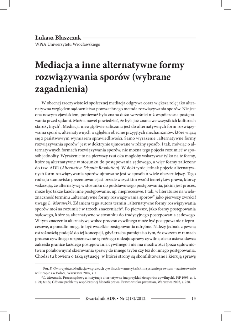 Łukasz Błaszczak WPiA Uniwersytetu Wrocławskiego Mediacja a inne alternatywne formy rozwiązywania sporów (wybrane zagadnienia) W obecnej rzeczywistości społecznej mediacja odgrywa coraz większą rolę jako alternatywna względem sądownictwa powszechnego metoda rozwiązywania sporów. Nie jest ona nowym zjawiskiem, ponieważ była znana dużo wcześniej niż współczesne postępowania przed sądami. Można nawet powiedzieć, że była już znana we wszystkich kulturach starożytnych1. Mediacja niewątpliwie zaliczana jest do alternatywnych form rozwiązywania sporów, alternatywnych względem obecnie przyjętych mechanizmów, które wiążą się z państwowym wymiarem sprawiedliwości. Samo wyrażenie „alternatywne formy rozwiązywania sporów” jest w doktrynie ujmowane w różny sposób. I tak, mówiąc o alternatywnych formach rozwiązywania sporów, nie można tego pojęcia rozumieć w sposób jednolity. Wyrażenie to na pierwszy rzut oka mogłoby wskazywać tylko na te formy, które są alternatywne w stosunku do postępowania sądowego, a więc formy zaliczone do tzw. ADR (Alternative Dispute Resolution). W doktrynie jednak pojęcie alternatywnych form rozwiązywania sporów ujmowane jest w sposób o wiele obszerniejszy. Tego rodzaju stanowisko prezentowane jest przede wszystkim wśród teoretyków prawa, którzy wskazują, że alternatywą w stosunku do podstawowego postępowania, jakim jest proces, może być także każde inne postępowanie, np. nieprocesowe. I tak, w literaturze na wieloznaczność terminu „alternatywne formy rozwiązywania sporów” jako pierwszy zwrócił uwagę L. Morawski. Zdaniem tego autora termin „alternatywne formy rozwiązywania sporów można rozumieć w trzech znaczeniach2. Po pierwsze, jako formy postępowania sądowego, które są alternatywne w stosunku do tradycyjnego postępowania sądowego. W tym znaczeniu alternatywą wobec procesu cywilnego może być postępowanie nieprocesowe, a ponadto mogą to być wszelkie postępowania odrębne. Należy jednak z pewną ostrożnością podejść do tej koncepcji, gdyż trzeba pamiętać o tym, że owszem w ramach procesu cywilnego rozpoznawane są różnego rodzaju sprawy cywilne, ale to ustawodawca zakreśla granice każdego postępowania cywilnego i nie ma możliwości (poza sądownictwem polubownym) skierowania sprawy do innego trybu czy też do innego postępowania. Chodzi tu bowiem o taką sytuację, w której strony są skonfliktowane i kierują sprawę 1 Por. E. Gmurzyńska, Mediacja w sprawach cywilnych w amerykańskim systemie prawnym – zastosowanie w Europie i w Polsce, Warszawa 2007, s. 1. 2 L. Morawski, Proces sądowy a instytucje alternatywne (na przykładzie sporów cywilnych), PiP 1993, z. 1, s. 21; tenże, Główne problemy współczesnej filozofii prawa. Prawo w toku przemian, Warszawa 2003, s. 228. Kwartalnik ADR • Nr 2(18)/2012 13 Błaszczak do sądu. Wówczas nie mogą samodzielnie wybrać trybu postępowania procesowego czy też nieprocesowego, gdyż Kodeks postępowania cywilnego wskazuje w art. 13, że sąd rozpoznaje sprawy w procesie, chyba że ustawa stanowi inaczej. Jeżeli zachodzą ku temu określone ustawowe przesłanki, to nie ma przeszkód, aby sąd rozpoznał sprawę w ramach określonego trybu, tym bardziej że jest do tego zobowiązany. W związku z powyższym powstaje zasadnicze pytanie, czy można mówić o alternatywie, jeżeli coś jest nakazane lub zakazane, a strony nie mają na to większego wpływu. Po drugie, „alternatywne formy rozwiązywania sporów” mogą oznaczać te formy sądowego postępowania, które nie mają charakteru adjudykacyjnego. Tutaj należy wskazać postępowanie pojednawcze oraz mediacyjne. Trzeba zauważyć, że na każdym etapie postępowania sędzia sądu powszechnego powinien dążyć do ugodowego załatwienia sporu. Z art. 10 KPC wynika, że w sprawach, w których zawarcie ugody jest dopuszczalne, sąd powinien w każdym stanie postępowania dążyć do ich ugodowego załatwienia. W tych sprawach strony mogą także zawrzeć ugodę przed mediatorem. Zarówno w pierwszym, jak i w drugim przypadku alternatywy w ramach sądowego postępowania cywilnego zwykło się określać mianem alternatyw wewnętrznych3. Po trzecie, przez alternatywne formy rozwiązywania sporów należy rozumieć wszelkie formy pozasądowe. Formy te funkcjonują poza państwowym wymiarem sprawiedliwości. Wiążą się one z działalnością orzeczniczą (np. arbitraż) lub oparte są na technikach mediacyjnych lub koncyliacyjnych. Te formy z kolei zwykło się określać mianem alternatyw zewnętrznych4. Analizując wskazane alternatywy, zarówno zewnętrzne, jak i wewnętrzne, trudno o akceptację takiego zróżnicowanego podejścia. O ile bowiem w odniesieniu do sądownictwa powszechnego nie wydaje się uzasadnione wskazywanie na alternatywę wewnętrzną, ponieważ postępowanie sądowe jest przede wszystkim podstawowym trybem rozstrzygania spraw cywilnych, o tyle właśnie względem postępowania sądowego alternatywą będą te wszystkie metody, które nie wiążą się z rozstrzyganiem spraw cywilnych przez organy procesowe sprawujące wymiar sprawiedliwości. Inną okolicznością, która przemawiałaby za tym, że wskazany podział nie jest uzasadniony, jest również to, że struktura i przebieg postępowania sądowego nie pozostaje w gestii stron, lecz mamy w tym wypadku wyraźne kryteria wskazane przez samego ustawodawcę. Postępowanie sądowe nacechowane jest bowiem formalizmem, czego z kolei nie można powiedzieć o pozasądowych metodach rozwiązywania sporów, gdzie stykamy się z większą elastycznością i możliwością kształtowania samych reguł postępowania. Z tej więc perspektywy nieuzasadnione wydaje się wskazywanie w ramach państwowego wymiaru sprawiedliwości jakichkolwiek alternatywnych rozwiązań czy też metod rozstrzygania spraw cywilnych. Pamiętać należy, że nawet jeśli wyróżniamy tryb procesowy 