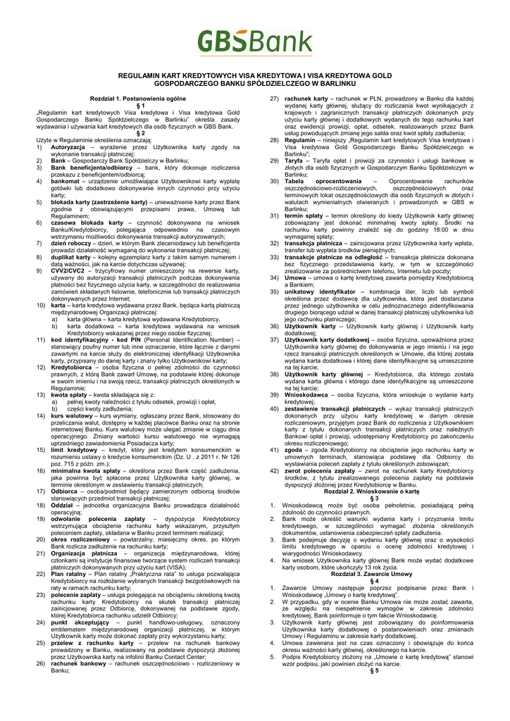 REGULAMIN KART KREDYTOWYCH VISA KREDYTOWA I VISA KREDYTOWA GOLD GOSPODARCZEGO BANKU SPÓŁDZIELCZEGO W BARLINKU Rozdział 1. Postanowienia ogólne §1 „Regulamin kart kredytowych Visa kredytowa i Visa kredytowa Gold Gospodarczego Banku Spółdzielczego w Barlinku” określa zasady wydawania i używania kart kredytowych dla osób fizycznych w GBS Bank. §2 Użyte w Regulaminie określenia oznaczają: 1) Autoryzacja – wyrażenie przez Użytkownika karty zgody na wykonanie transakcji płatniczej; 2) Bank – Gospodarczy Bank Spółdzielczy w Barlinku; 3) Bank beneficjenta/odbiorcy – bank, który dokonuje rozliczenia przekazu z beneficjentem/odbiorcą; 4) bankomat – urządzenie umożliwiające Użytkownikowi karty wypłatę gotówki lub dodatkowo dokonywanie innych czynności przy użyciu karty; 5) blokada karty (zastrzeżenie karty) – unieważnienie karty przez Bank zgodnie z obowiązującymi przepisami prawa, Umową lub Regulaminem; 6) czasowa blokada karty – czynność dokonywana na wniosek Banku/Kredytobiorcy, polegająca odpowiednio na czasowym wstrzymaniu możliwości dokonywania transakcji autoryzowanych; 7) dzień roboczy – dzień, w którym Bank zleceniodawcy lub beneficjenta prowadzi działalność wymaganą do wykonania transakcji płatniczej; 8) duplikat karty – kolejny egzemplarz karty z takim samym numerem i datą ważności, jak na karcie dotychczas używanej; 9) CVV2/CVC2 – trzycyfrowy numer umieszczony na rewersie karty, używany do autoryzacji transakcji płatniczych podczas dokonywania płatności bez fizycznego użycia karty, w szczególności do realizowania zamówień składanych listownie, telefonicznie lub transakcji płatniczych dokonywanych przez Internet; 10) karta – karta kredytowa wydawana przez Bank, będąca kartą płatniczą międzynarodowej Organizacji płatniczej: a) karta główna – karta kredytowa wydawana Kredytobiorcy, b) karta dodatkowa – karta kredytowa wydawana na wniosek Kredytobiorcy wskazanej przez niego osobie fizycznej; 11) kod identyfikacyjny - kod PIN (Personal Identification Number) – stanowiący poufny numer lub inne oznaczenie, które łącznie z danymi zawartymi na karcie służy do elektronicznej identyfikacji Użytkownika karty, przypisany do danej karty i znany tylko Użytkownikowi karty; 12) Kredytobiorca – osoba fizyczna o pełnej zdolności do czynności prawnych, z którą Bank zawarł Umowę, na podstawie której dokonuje w swoim imieniu i na swoją rzecz, transakcji płatniczych określonych w Regulaminie; 13) kwota spłaty – kwota składająca się z: a) pełnej kwoty należności z tytułu odsetek, prowizji i opłat, b) części kwoty zadłużenia; 14) kurs walutowy – kurs wymiany, ogłaszany przez Bank, stosowany do przeliczania walut, dostępny w każdej placówce Banku oraz na stronie internetowej Banku. Kurs walutowy może ulegać zmianie w ciągu dnia operacyjnego. Zmiany wartości kursu walutowego nie wymagają uprzedniego zawiadomienia Posiadacza karty; 15) limit kredytowy – kredyt, który jest kredytem konsumenckim w rozumieniu ustawy o kredycie konsumenckim (Dz. U . z 2011 r. Nr 126 poz. 715 z późn. zm.); 16) minimalna kwota spłaty – określona przez Bank część zadłużenia, jaka powinna być spłacona przez Użytkownika karty głównej, w terminie określonym w zestawieniu transakcji płatniczych; 17) Odbiorca – osoba/podmiot będący zamierzonym odbiorcą środków stanowiących przedmiot transakcji płatniczej; 18) Oddział – jednostka organizacyjna Banku prowadząca działalność operacyjną; 19) odwołanie polecenia zapłaty – dyspozycja Kredytobiorcy wstrzymująca obciążenie rachunku karty wskazanym, przyszłym poleceniem zapłaty, składana w Banku przed terminem realizacji; 20) okres rozliczeniowy – powtarzalny, miesięczny okres, po którym Bank rozlicza zadłużenie na rachunku karty; 21) Organizacja płatnicza – organizacja międzynarodowa, której członkami są instytucje finansowe tworzące system rozliczeń transakcji płatniczych dokonywanych przy użyciu kart (VISA); 22) Plan ratalny – Plan ratalny „Praktyczna rata” to usługa pozwalająca Kredytobiorcy na rozłożenie wybranych transakcji bezgotówkowych na raty w ramach rachunku karty; 23) polecenie zapłaty – usługa polegająca na obciążeniu określoną kwotą rachunku karty Kredytobiorcy na skutek transakcji płatniczej zainicjowanej przez Odbiorcę, dokonywanej na podstawie zgody, której Kredytobiorca rachunku udzielił Odbiorcy; 24) punkt akceptujący – punkt handlowo-usługowy, oznaczony emblematem międzynarodowej organizacji płatniczej, w którym Użytkownik karty może dokonać zapłaty przy wykorzystaniu karty; 25) przelew z rachunku karty – przelew na rachunek bankowy prowadzony w Banku, realizowany na podstawie dyspozycji złożonej przez Użytkownika karty na infolinii Banku Contact Center; 26) rachunek bankowy – rachunek oszczędnościowo - rozliczeniowy w Banku; 27) 28) 29) 30) 31) 32) 33) 34) 35) 36) 37) 38) 39) 40) 41) 42) 1. 2. 3. 4. 1. 2. 3. 4. 5. rachunek karty – rachunek w PLN, prowadzony w Banku dla każdej wydanej karty głównej, służący do rozliczania kwot wynikających z krajowych i zagranicznych transakcji płatniczych dokonanych przy użyciu karty głównej i dodatkowych wydanych do tego rachunku kart oraz ewidencji prowizji, opłat, odsetek, realizowanych przez Bank usług powodujących zmianę jego salda oraz kwot spłaty zadłużenia; Regulamin – niniejszy „Regulamin kart kredytowych Visa kredytowa i Visa kredytowa Gold Gospodarczego Banku Spółdzielczego w Barlinku”; Taryfa – Taryfa opłat i prowizji za czynności i usługi bankowe w złotych dla osób fizycznych w Gospodarczym Banku Spółdzielczym w Barlinku; Tabela oprocentowania – Oprocentowanie rachunków oszczędnościowo-rozliczeniowych, oszczędnościowych oraz terminowych lokat oszczędnościowych dla osób fizycznych w złotych i walutach wymienialnych otwieranych i prowa