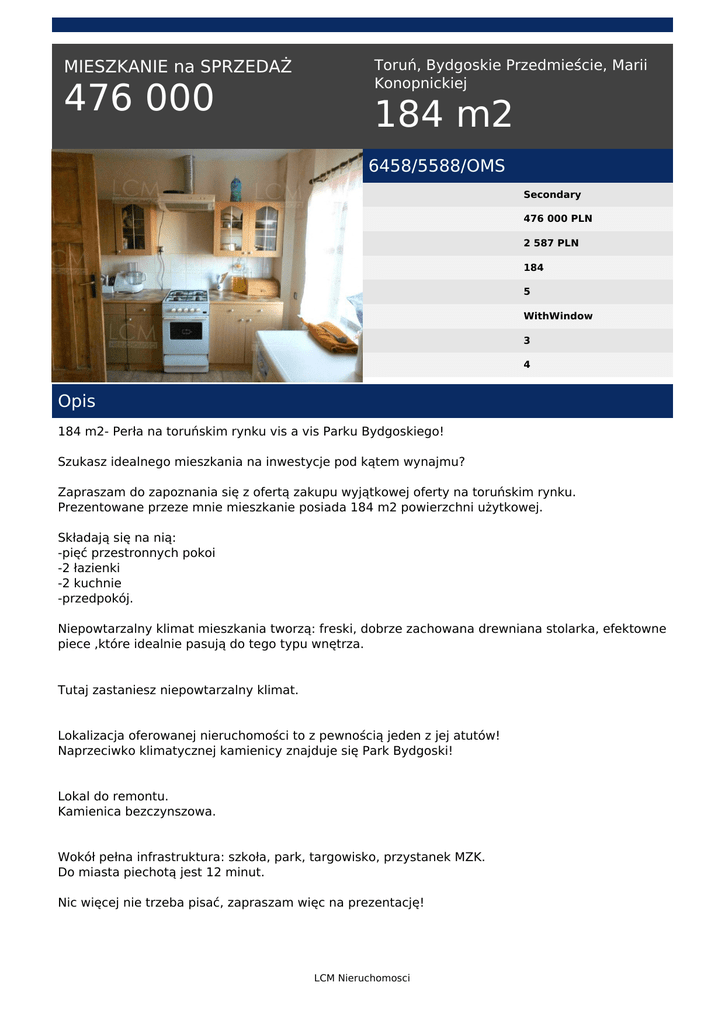 MIESZKANIE na SPRZEDAŻ 476 000 Toruń, Bydgoskie Przedmieście, Marii Konopnickiej 184 m2 6458/5588/OMS Secondary 476 000 PLN 2 587 PLN 184 5 WithWindow 3 4 Opis 184 m2- Perła na toruńskim rynku vis a vis Parku Bydgoskiego! Szukasz idealnego mieszkania na inwestycje pod kątem wynajmu? Zapraszam do zapoznania się z ofertą zakupu wyjątkowej oferty na toruńskim rynku. Prezentowane przeze mnie mieszkanie posiada 184 m2 powierzchni użytkowej. Składają się na nią: -pięć przestronnych pokoi -2 łazienki -2 kuchnie -przedpokój. Niepowtarzalny klimat mieszkania tworzą: freski, dobrze zachowana drewniana stolarka, efektowne piece ,które idealnie pasują do tego typu wnętrza. Tutaj zastaniesz niepowtarzalny klimat. Lokalizacja oferowanej nieruchomości to z pewnością jeden z jej atutów! Naprzeciwko klimatycznej kamienicy znajduje się Park Bydgoski! Lokal do remontu. Kamienica bezczynszowa. Wokół pełna infrastruktura: szkoła, park, targowisko, przystanek MZK. Do miasta piechotą jest 12 minut. Nic więcej nie trzeba pisać, zapraszam więc na prezentację! LCM Nieruchomosci POŚREDNICTWO W OBROCIE NIERUCHOMOŚCIAMI JEST USŁUGĄ ODPŁATNĄ. Oświadczenie Biuro Pośrednictwa LCM Nieruchomości działa zgodnie z zasadami Standardów Zawodowych Pośredników w Obrocie Nieruchomościami, zamieszcza w ofertach informacje prawdziwe wg wszelkiej wiedzy i starania, nie łamie regulaminów serwisów nieruchomościowych, w tym nie publikuje celowo nieaktualnych i nieistniejących ofert, oraz stanowczo odcina się od praktyk nieetycznych i wprowadzających inne firmy oraz potencjalnych klientów w błąd. ZAPEWNIAMY BEZPŁATNE I PROFESJONALNE DORADZTWO W ZAKRESIE POZYSKIWANIA KREDYTÓW HIPOTECZNYCH NA ZAKUP NIERUCHOMOŚCI Powyższe informacje zostały sporządzone na podstawie oświadczeń i nie są ofertą w rozumieniu przepisów Kodeksu Cywilnego. Mają one jedynie charakter informacyjny. Jolanta Adamczyk tel. 883941097 email: [email protected] LCM Nieruchomosci Powered by TCPDF (www.tcpdf.org)