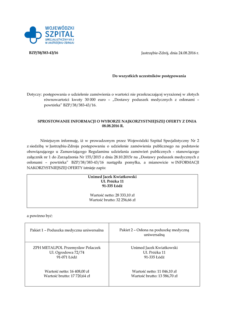 BZP/38/383-43/16 Jastrzębie-Zdrój, dnia 24.08.2016 r. Do wszystkich uczestników postępowania Dotyczy: postępowania o udzielenie zamówienia o wartości nie przekraczającej wyrażonej w złotych równowartości kwoty 30 000 euro – „Dostawy poduszek medycznych z osłonami – powtórka” BZP/38/383-43/16. SPROSTOWANIE INFORMACJI O WYBORZE NAJKORZYSTNIEJSZEJ OFERTY Z DNIA 08.08.2016 R. Niniejszym informuję, iż w prowadzonym przez Wojewódzki Szpital Specjalistyczny Nr 2 z siedzibą w Jastrzębiu-Zdroju postępowaniu o udzielenie zamówienia publicznego na podstawie obowiązującego u Zamawiającego Regulaminu udzielania zamówień publicznych - stanowiącego załącznik nr 1 do Zarządzenia Nr 155/2015 z dnia 28.10.2015r na „Dostawy poduszek medycznych z osłonami – powtórka” BZP/38/383-43/16 nastąpiła pomyłka, a mianowicie w INFORMACJI NAKORZYSTNIEJSZEJ OFERTY istnieje zapis: Unimed Jacek Kwiatkowski Ul. Próżka 11 91-335 Łódź Wartość netto: 28 333,10 zł Wartość brutto: 32 256,66 zł a powinno być: Pakiet 1 – Poduszka medyczna uniwersalna Pakiet 2 – Osłona na poduszkę medyczną uniwersalną ZPH METALPOL Przemysław Polaczek Ul. Ogrodowa 72/74 91-071 Łódź Unimed Jacek Kwiatkowski Ul. Próżka 11 91-335 Łódź Wartość netto: 16 408,00 zł Wartość brutto: 17 720,64 zł Wartość netto: 11 046,10 zł Wartość brutto: 13 586,70 zł Umowę z Wykonawcą, którego oferta została wybrana, Zamawiający podpisze w terminie określonym w regulaminie udzielania zamówień, stanowiącego załącznik nr 1 do zarządzenia nr 155/2015 z dnia 28.10.2015 r. Dyrektora WSS Nr 2 w Jastrzębiu- Zdroju. Z poważaniem Wojewódzki Szpital Specjalistyczny Nr 2 w Jastrzębiu - Zdroju, Aleja Jana Pawła II 7, 44 - 330 Jastrzębie – Zdrój tel. 32 47 84 200, fax. 32 74 84 506, e-mail:[email protected], www.wss2.pl