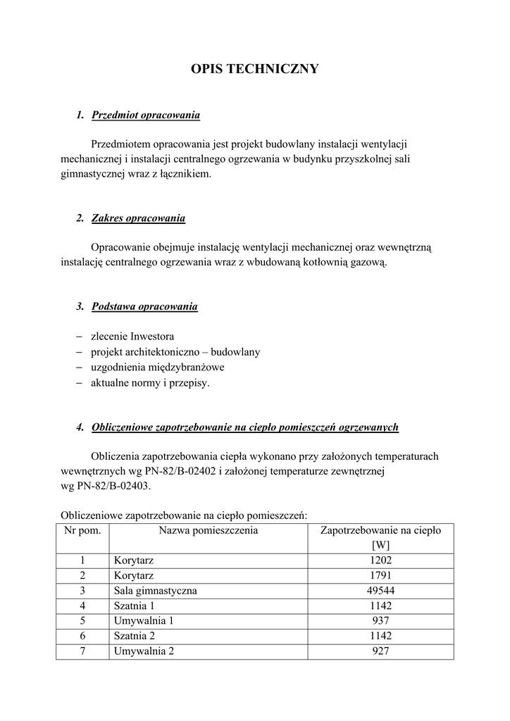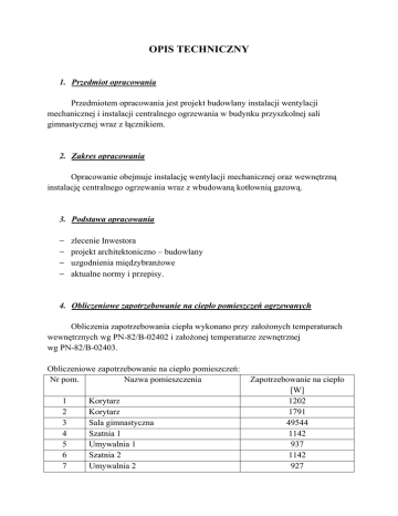OPIS TECHNICZNY 1. Przedmiot opracowania Przedmiotem opracowania jest projekt budowlany instalacji wentylacji mechanicznej i instalacji centralnego ogrzewania w budynku przyszkolnej sali gimnastycznej wraz z łącznikiem. 2. Zakres opracowania Opracowanie obejmuje instalację wentylacji mechanicznej oraz wewnętrzną instalację centralnego ogrzewania wraz z wbudowaną kotłownią gazową. 3. Podstawa opracowania − − − − zlecenie Inwestora projekt architektoniczno – budowlany uzgodnienia międzybranŜowe aktualne normy i przepisy. 4. Obliczeniowe zapotrzebowanie na ciepło pomieszczeń ogrzewanych Obliczenia zapotrzebowania ciepła wykonano przy załoŜonych temperaturach wewnętrznych wg PN-82/B-02402 i załoŜonej temperaturze zewnętrznej wg PN-82/B-02403. Obliczeniowe zapotrzebowanie na ciepło pomieszczeń: Nr pom. Nazwa pomieszczenia 1 2 3 4 5 6 7 Korytarz Korytarz Sala gimnastyczna Szatnia 1 Umywalnia 1 Szatnia 2 Umywalnia 2 Zapotrzebowanie na ciepło [W] 1202 1791 49544 1142 937 1142 927 8 9 10 11 12 13 14 15 16 17 18 19 K1 1/1 1/2 1/3 1/4 1/5 1/7 1/8 Pokój 1 - pomocy Magazyn sprzętu sportowego Pomieszczenie porządkowe WC niepełnosprawnych WC męski WC damski Pokój nauczyciela WF Magazyn Pomieszczenie techniczne Przedsionek Korytarz Jadalnia 2 Klatka schodowa Korytarz Sala gimnastyki korekcyjnej Sala gimnastyki korekcyjnej Magazyn sprzętu Magazyn sprzętu Korytarz Oddział „0” 693 1154 172 366 612 612 1003 726 0 720 2450 3317 1497 1763 5116 5088 621 456 2505 3228 Zapotrzebowanie ciepła na potrzeby ogrzewania wynosi ~ 88,8 kW. 5. Zapotrzebowanie ciepła do przygotowania ciepłej wody uŜytkowej Przygotowanie ciepłej wody zostanie zrealizowane w podgrzewaczu pojemnościowym 500 dm3, ładowanym z kotłów w trybie tzw. priorytetu ciepłej wody. Zapotrzebowanie na energię dla potrzeb ciepłej wody nie wymaga ujęcia w łącznym bilansie zapotrzebowania ciepła. 6. Zapotrzebowanie ciepła technologicznego Zapotrzebowanie ciepła technologicznego do nagrzewnic wodnych central wentylacyjnych wynosi: − dla centrali AHU-1: 14 kW − dla centrali AHU-2: 8 kW Łączne obliczeniowe zapotrzebowanie ciepła technologicznego wynosi: 22 kW. 7. ZałoŜona wydajność wentylacji w pomieszczeniach wentylowanych mechanicznie w układzie nawiewno- wywiewnym i wywiewnym Wydajność wentylacji mechanicznej nawiewno – wywiewnej została określona dla poszczególnych pomieszczeń na podstawie przepisów techniczno – budowlanych oraz wg PN-83/B-03430. Wydajność wentylacji w pomieszczeniach wentylowanych mechanicznie (nawiew/wywiew) jest następująca: − sala gimnastyczna – 5800/5800 m3/h, − sale gimnastyki korekcyjnej – 400/400 m3/h, − szatnie – 300/300 m3/h, − umywalnie – 150/150 m3/h, − WC, pom. porządkowe – wywiew min. 50 m3/h. W pomieszczeniach: − sala gimnastyczna, − sale gimnastyki korekcyjnej na piętrze zaprojektowana została wentylacja z odzyskiem energii na wymiennikach krzyŜowych w centralach wentylacyjnych (układ wywiewny realizowany przez centralę). W pomieszczeniach: − szatnie, − umywalnie zaprojektowany został układ nawiewny realizowany przez centralę, układ wywiewny realizowany przez wentylator dachowy. W pomieszczeniach na parterze: WC oraz pom. porządkowe zaprojektowany został układ wywiewny realizowany przez wentylatory ścienne i sufitowe, załączane wraz z oświetleniem. 8. Instalacja wentylacji mechanicznej W części budynku została zaprojektowana instalacja wentylacji mechanicznej, obsługiwana przez 2 centrale nawiewno – wywiewne z odzyskiem energii na wymienniku obrotowym. Instalacja nawiewno-wywiewna w układzie NW1 z centralą AHU-1 zlokalizowana na dachu sali gimnastycznej jest przewidziana dla pomieszczenia tej sali. Instalacja nawiewno-wywiewna w układzie NW2 centralą z AHU-2 zlokalizowana na stropie piętra jest przewidziana dla pomieszczeń: − sal gimnastyki korekcyjnej na poziomie piętra, − szatni i umywalni na poziomie parteru. Instalację wentylacji mechanicznej naleŜy wykonać z kanałów stalowych ocynkowanych - w układzie NW1o przekroju prostokątnym, w układzie NW2 o przekroju okrągłym typu „spiro”. Przy załamaniach przewodów, zmianie przekroju, przed i za przepustnicami i nagrzewnicami i nie rzadziej niŜ co 10 m naleŜy zastosować otwory rewizyjne. Rozmieszczenie otworów rewizyjnych na kanałach wentylacyjnych powinno umoŜliwić wprowadzenie do nich elementów czyszczących i dotarcie do kaŜdego miejsca instalacji. Na głównych odgałęzieniach kanałów wentylacyjnych, doprowadzających powietrze do elementów nawiewnych i odprowadzających powietrze z elementów wywiewnych, przewidziano przepustnice regulacyjne. Kanały wentylacyjne wymagają zaizolowania samoprzylepnymi matami lamelowymi ze skalnej wełny mineralnej, na podkładzie z folii aluminiowej, o gr.: − 100 mm (λ = 0,035 W/(m*K) – na zewnątrz budynku, − 40 mm (λ = 0,035 W/(m*K) – nad stropem poddasza − 20 mm (λ = 0,035 W/(m*K) – w pozostałej lokalizacji. Kanały wentylacyjne wraz z izolacją cieplną prowadzone ponad dachem naleŜy obudować blachą stalową ocynkowaną. Komfort akustyczny zapewnią tłumiki kanałowe zamontowane na kanałach wylotowych i dolotowych central od strony instalacji. Opis układu NW1 Układ z centralą wentylacyjną nawiewno-wywiewną z odzyskiem energii, umieszczoną na dachu. Obliczeniowa wydajność wentylacji (nawiew/wywiew): 5800/5800 m3/h. Projektowana obróbka powietrza to filtrowanie, ogrzewanie oraz odzysk energii. Dobrana została centrala wentylacyjna AHU-1 z odzyskiem energii na wymienniku obrotowym, o następujących zasadniczych parametrach: − wydajność centrali: 5800/5800 m3/h, − centrala nawiewno – wywiewna, − wymiennik obrotowy higroskopijny z płynną regulacją, − sprawność temperaturowa wymiennika: 79,5%, − sprawność odzysku wilgoci w zimie: 77,5%, w lecie: 72,5%, − moc odzysku ciepła: 73 kW, − filtry klasy F7, − wen