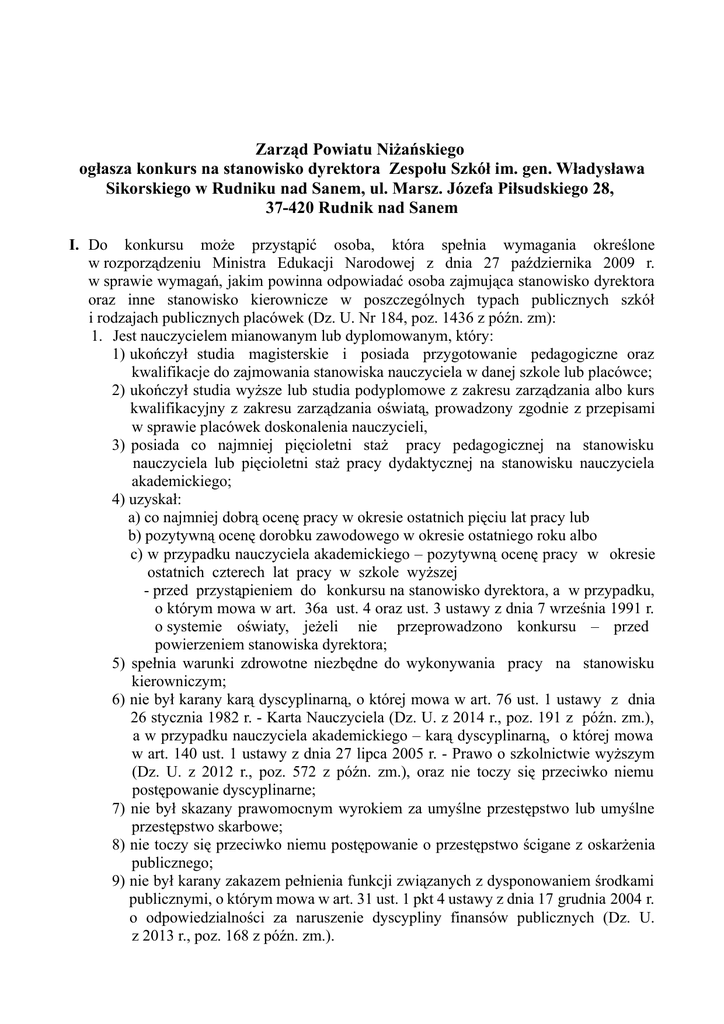 Zarząd Powiatu Niżańskiego ogłasza konkurs na stanowisko dyrektora Zespołu Szkół im. gen. Władysława Sikorskiego w Rudniku nad Sanem, ul. Marsz. Józefa Piłsudskiego 28, 37-420 Rudnik nad Sanem I. Do konkursu może przystąpić osoba, która spełnia wymagania określone w rozporządzeniu Ministra Edukacji Narodowej z dnia 27 października 2009 r. w sprawie wymagań, jakim powinna odpowiadać osoba zajmująca stanowisko dyrektora oraz inne stanowisko kierownicze w poszczególnych typach publicznych szkół i rodzajach publicznych placówek (Dz. U. Nr 184, poz. 1436 z późn. zm): 1. Jest nauczycielem mianowanym lub dyplomowanym, który: 1) ukończył studia magisterskie i posiada przygotowanie pedagogiczne oraz kwalifikacje do zajmowania stanowiska nauczyciela w danej szkole lub placówce; 2) ukończył studia wyższe lub studia podyplomowe z zakresu zarządzania albo kurs kwalifikacyjny z zakresu zarządzania oświatą, prowadzony zgodnie z przepisami w sprawie placówek doskonalenia nauczycieli, 3) posiada co najmniej pięcioletni staż pracy pedagogicznej na stanowisku nauczyciela lub pięcioletni staż pracy dydaktycznej na stanowisku nauczyciela akademickiego; 4) uzyskał: a) co najmniej dobrą ocenę pracy w okresie ostatnich pięciu lat pracy lub b) pozytywną ocenę dorobku zawodowego w okresie ostatniego roku albo c) w przypadku nauczyciela akademickiego – pozytywną ocenę pracy w okresie ostatnich czterech lat pracy w szkole wyższej - przed przystąpieniem do konkursu na stanowisko dyrektora, a w przypadku, o którym mowa w art. 36a ust. 4 oraz ust. 3 ustawy z dnia 7 września 1991 r. o systemie oświaty, jeżeli nie przeprowadzono konkursu – przed powierzeniem stanowiska dyrektora; 5) spełnia warunki zdrowotne niezbędne do wykonywania pracy na stanowisku kierowniczym; 6) nie był karany karą dyscyplinarną, o której mowa w art. 76 ust. 1 ustawy z dnia 26 stycznia 1982 r. - Karta Nauczyciela (Dz. U. z 2014 r., poz. 191 z późn. zm.), a w przypadku nauczyciela akademickiego – karą dyscyplinarną, o której mowa w art. 140 ust. 1 ustawy z dnia 27 lipca 2005 r. - Prawo o szkolnictwie wyższym (Dz. U. z 2012 r., poz. 572 z późn. zm.), oraz nie toczy się przeciwko niemu postępowanie dyscyplinarne; 7) nie był skazany prawomocnym wyrokiem za umyślne przestępstwo lub umyślne przestępstwo skarbowe; 8) nie toczy się przeciwko niemu postępowanie o przestępstwo ścigane z oskarżenia publicznego; 9) nie był karany zakazem pełnienia funkcji związanych z dysponowaniem środkami publicznymi, o którym mowa w art. 31 ust. 1 pkt 4 ustawy z dnia 17 grudnia 2004 r. o odpowiedzialności za naruszenie dyscypliny finansów publicznych (Dz. U. z 2013 r., poz. 168 z późn. zm.). 2. Stanowisko dyrektora może zajmować osoba niebędąca nauczycielem, która spełnia łącznie następujące wymagania: 1) posiada obywatelstwo polskie, z tym że wymóg ten nie dotyczy obywateli państw członkowskich Unii Europejskiej, państw członkowskich Europejskiego Porozumienia o Wolnym Handlu (EFTA) – stron umowy o Europejskim Obszarze Gospodarczym oraz Konfederacji Szwajcarskiej, 2) ukończyła studia magisterskie, 3) posiada co najmniej pięcioletni staż pracy, w tym co najmniej dwuletni staż pracy na stanowisku kierowniczym, 4) ma pełną zdolność do czynności prawnych i korzysta z praw publicznych, 5) nie toczy się przeciwko niej postępowanie o przestępstwo ścigane z oskarżenia publicznego lub postępowanie dyscyplinarne; 6) spełnia wymagania określone w pkt 1 ppkt 2,5,7 i 9 ogłoszenia. II. Oferty osób przystępujących do konkursu powinny zawierać: 1. uzasadnienie przystąpienia do konkursu oraz koncepcję funkcjonowania i rozwoju publicznej szkoły lub publicznej placówki; 2. poświadczoną przez kandydata za zgodność z oryginałem kopię dowodu osobistego lub innego dokumentu potwierdzającego tożsamość oraz poświadczającego obywatelstwo kandydata, 3. życiorys z opisem przebiegu pracy zawodowej, zawierający w szczególności informację o: - stażu pracy pedagogicznej – w przypadku nauczyciela, albo - stażu pracy dydaktycznej – w przypadku nauczyciela akademickiego, albo - stażu pracy, w tym stażu pracy na stanowisku kierowniczym – w przypadku osoby nie będącej nauczycielem, 4. oryginały lub poświadczone przez kandydata za zgodność z oryginałem kopie dokumentów potwierdzających posiadanie wymaganego stażu pracy, o którym mowa w pkt 3, 5. oryginały lub poświadczone przez kandydata za zgodność z oryginałem kopie dokumentów potwierdzających posiadanie wymaganego wykształcenia, w tym dyplomu ukończenia studiów wyższych lub świadectw ukończenia studiów podyplomowych z zakresu zarządzania albo świadectwa ukończenia kursu kwalifikacyjnego z zakresu zarządzania oświatą, 6. zaświadczenie lekarskie o braku przeciwwskazań zdrowotnych do wykonywania pracy na stanowisku kierowniczym, 7. oświadczenie, że przeciwko kandydatowi nie toczy się postępowanie o przestępstwo ścigane z oskarżenia publicznego lub postępowanie dyscyplinarne, 8. oświadczenie, że kandydat nie był skazany prawomocnym wyrokiem za umyślne przestępstwo lub umyślne przestępstwo skarbowe, 9. oświadczenie, że kandydat nie był karany zakazem pełnienia funkcji związanych z dysponowaniem środkami publicznymi, o którym mowa w art. 31 ust. 1 pkt 4 ustawy z dnia 17 grudnia 2004 r. o odpowiedzialności za naruszenie dyscypliny finansów publicznych (Dz. U. z 2013 r., poz. 168 z późn. zm.), 10. oświadczenie o dopełnieniu obowiązku, o którym mowa w art. 7 ust. 1 i ust. 3a ustawy z dnia 18 października 2006 r. o ujawnianiu informacji o dokumentach organów bezpieczeństwa państwa z lat 1944 – 1990 oraz treści tych dokumentów (Dz. U. z 2013 r., poz. 1388, z późn. zm.), 11. oryginał lub poświadczoną przez kandydata za zgodność z oryginałem kopię aktu nadania stopnia nauczyciela mianowanego lub dyplomowanego – w przypa