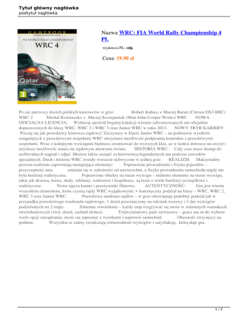 Tytuł główny nagłówka podtytuł nagłówka Nazwa WRC: FIA World Rally Championship 4 PL wydawca PL: cdp Cena: 19.90 zł Po raz pierwszy dwóch polskich kierowców w grze: Robert Kubica + Maciej Baran (Citroen DS3 RRC) WRC 2 Michał Kościuszko + Maciej Szczepaniak (Mini John Cooper Works) WRC NOWA OFICJALNA LICENCJA: Wybieraj spośród bogatej kolekcji wiernie odwzorowanych aut oficjalnie dopuszczonych do klasy WRC, WRC 2 i WRC 3 oraz Junior WRC w roku 2013. NOWY TRYB KARIERY: Poczuj się jak prawdziwy kierowca rajdowy! Zaczynasz w klasie Junior WRC – na podstawie wyników osiągniętych z prawdziwymi zespołami WRC otrzymasz możliwość podpisania kontraktu z prawdziwymi zespołami. Wraz z kolejnymi wyścigami będziesz awansować do wyższych klas, aż w końcu dotrzesz na szczyt i uzyskasz możliwość stania się rajdowym mistrzem świata. HISTORIA WRC: Cały czas masz dostęp do archiwalnych nagrań i zdjęć. Możesz także zasiąść za kierownicą legendarnych aut podczas zawodów specjalnych. Duch i historia WRC zostały wreszcie uchwycone w jednej grze. REALIZM: Maksymalny poziom realizmu zapewniają następujące elementy: Poprawione prowadzenie i fizyka pojazdów – przyczepność auta zmienia się w zależności od nawierzchni, a fizyka prowadzenia samochodu nigdy nie była bardziej realistyczna. Poprawione obiekty na trasie wyścigu – niektóre elementy na trasie wyścigu, takie jak drzewa, trawa, skały, reklamy, widzowie i krajobrazy, są teraz o wiele bardziej szczegółowe i realistyczne. Nowe ujęcia kamer i przerywniki filmowe. AUTENTYCZNOŚĆ: Gra jest wierna wszystkim elementom, które czynią rajdy WRC wyjątkowymi: • Autentyczny podział na klasy – WRC, WRC 2, WRC 3 oraz Junior WRC. Prawdziwa struktura rajdów – w grze obowiązuje podobny podział jak w przypadku prawdziwego weekendu rajdowego: 1 dzień przeznaczony na odcinek testowy i 3 dni wyścigów podzielonych na 2 etapy. Zmienne oświetlenie – każdy etap rozgrywać się może w zmiennych warunkach oświetleniowych (świt, dzień, zachód słońca). Trójwymiarowy park serwisowy – gracz ma tu do wyboru wiele opcji zarządzania, może się zapoznać z wynikami i naprawić samochód. Obecność zwycięzcy na podium. Wszystkie te zalety zwiększają różnorodność wyścigów i satysfakcję, którą daje gra. 1/2 Tytuł główny nagłówka podtytuł nagłówka Nazwa Wartość Wydawca PL CDP.pl / CD Projekt Data premiery 31.10.2013 Producent Tryb gry Kategoria wiekowa Wersja językowa Format Milestone Single / Multiplayer 3+ PL (napisy) DVD 2/2