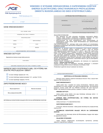 WZD (wz 15.06.2016) WNIOSEK O WYDANIE OŚWIADCZENIA O ZAPEWNIENIU DOSTAW ENERGII ELEKTRYCZNEJ ORAZ WARUNKACH PRZYŁĄCZENIA OBIEKTU BUDOWLANEGO DO SIECI DYSTRYBUCYJNEJ PGE Dystrybucja S.A. Oddział ………………………………………… ………………………………………………….. ………………………………………………….. tel.:………… e-mail:……………….…………. WYPEŁNIA PGE DYSTRYBUCJA S.A. ….……………………………………….……………………………. (NR WNIOSKU) _ _-_ _-_ _ _ _ r. DATA ZŁOŻENIA WNIOSKU ……………………………………………………………………….. (NR KONTRAHENTA) DANE WNIOSKODAWCY _ _-_ _-_ _ _ _ r. DATA KOMPLETNOŚCI WNIOSKU ……………………………………………………………………………………………… (imię i nazwisko / nazwa) …………………….………………………………………………….. Podpis pracownika stwierdzającego kompletność Wniosku ................................................................................................................................... (miejscowość , ulica, nr domu, nr mieszkania) …………………………………………………………………………………..…………. (kod pocztowy, poczta) ………………………………………… …...………………………………….. ……………………….………………. ……………………………………..... ……………………………………….. ………………………………………. (telefon) (PESEL) (telefon komórkowy) (email) (NIP) (REGON) ………………………………………………………………………………………………. (adres do korespondencji – jeśli inny niż powyżej) WNIOSEK DOTYCZY Zapewnienia dostaw energii elektrycznej do ……………………………………………………………………………………...………. (nazwa obiektu) …………………………………………………………………………………..….………. …………………………………………………………………..………………….………. (adres obiektu: miejscowość , gmina, ulica, nr domu, nr mieszkania, nr działki) ZAŁĄCZNIKI WYMAGANE: − plan zabudowy lub szkic sytuacyjny określający usytuowanie obiektu, w którym będą używane przyłączane urządzenia, instalacje lub sieci, względem istniejącej sieci oraz usytuowanie sąsiednich obiektów − pełnomocnictwo dla osób upoważnionych przez Wnioskodawcę do występowania w jego imieniu (jeżeli Wnioskodawca jest reprezentowany przez pełnomocnika) PGE DYSTRYBUCJA S.A. zastrzega sobie prawo żądania od wnioskodawcy przedłożenia dodatkowych dokumentów niezbędnych do prawidłowego określenia zapewnienia dostaw. Oświadczam, że wyrażam zgodę na przetwarzanie moich danych osobowych zawartych w niniejszym wniosku, zgodnie z ustawą z dnia 29 sierpnia 1997o ochronie danych osobowych (t.j. Dz.U. z 2015 r. poz. 2135 z późn. zm.), przez PGE Dystrybucja S.A. z siedzibą w Lublinie ul. Garbarska 21a, 20-340 Lublin w celu wydania oświadczenia o zapewnieniu dostaw energii elektrycznej oraz warunkach przyłączenia obiektu budowlanego do sieci dystrybucyjnej. Przyjmuję jednocześnie do wiadomości, że mam prawo żądania informacji o zakresie przetwarzania swoich danych osobowych, prawo dostępu do treści tych danych, uzupełnienia, uaktualnienia i sprostowania danych, gdy są niekompletne, nieaktualne, nieprawdziwe. Podanie danych osobowych jest dobrowolne, ale konieczne do rozpatrzenia wniosku – dotyczy osób fizycznych Podmiot wyraża zgodę na przesyłanie informacji związanych z procesem przyłączania drogą elektroniczną na wskazany we wniosku e-mail. Potwierdzam zgodność danych zawartych we wniosku. NAPIĘCIE SIECI DYSTRYBUCYJNEJ, DO KTÓREJ MA ZOSTAĆ PRZYŁĄCZONY OBIEKT ……………………………………........... do sieci niskiego napięcia (do 1 kV), do sieci średniego napięcia (powyżej 1 kV – poniżej 110 kV), INSTRTUKCJA WYPEŁNIANIA WNIOSKU. Wniosek należy wypełnić czytelnie drukowanymi literami. Pola z szarym tłem wypełnia PGE Dystrybucja S.A. do sieci wysokiego napięcia (110 kV). DANE WNIOSKODAWCY: ZAPOTRZEBOWANIE MOCY Wyszczególnienie _ _ - _ _ - _ _ _ _ r. CZYTELNY PODPIS WNIOSKODAWCY Wartość docelowa Moc przyłączeniowa [kW] INFORMACJE DODATKOWE MAJĄCE WPŁYW NA ZAPEWNIENIE DOSTAW należy podać imię i nazwisko lub nazwę wnioskodawcy. Wskazać adres zameldowania lub adres siedziby oraz adres korespondencyjny. Dla podmiotów prawnych prosimy podać NIP oraz REGON natomiast dla osób fizycznych PESEL. Dla ułatwienia kontaktu prosimy o podanie nr telefonu i adres e-mail. WNIOSEK DOTYCZY: należy podać nazwę obiektu oraz jego lokalizację wskazując adres i nr działki, na której będzie się znajdował. NAPIĘCIE SIECI DYSTRYBUCYJNEJ, PRZYŁĄCZONY OBIEKT: ………………………………………………………………………………………………. należy zaznaczyć „X” w odpowiedniej kratce. ………………………………………………………………………………………………. ZAPOTRZEBOWANIE MOCY: ………………………………………………………………………………………………. ………………………………………………………………………………………………. ………………………………………………………………………………………………. ………………………………………………………………………………………………. DO KTÓREJ MA ZOSTAĆ w kolumnie „Wartość docelowa”, należy podać docelową moc przyłączeniową czynną w kW. INFORMACJE DODATKOWE MAJĄCE WPŁYW NA ZAPEWNIENIE DOSTAW: należy podać inne inform