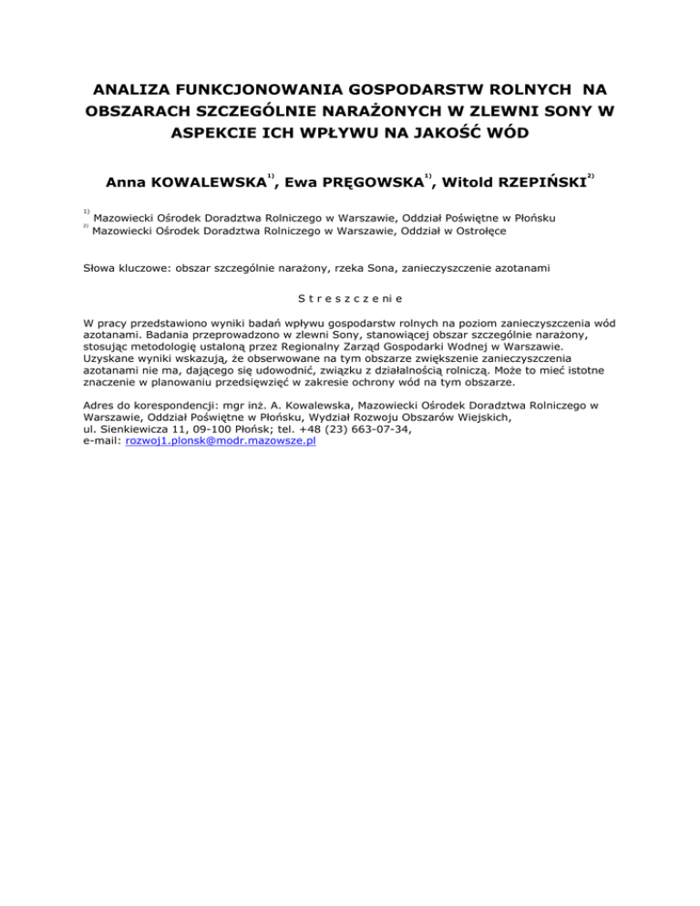 ANALIZA FUNKCJONOWANIA GOSPODARSTW ROLNYCH NA OBSZARACH SZCZEGÓLNIE NARAŻONYCH W ZLEWNI SONY W ASPEKCIE ICH WPŁYWU NA JAKOŚĆ WÓD 1) 1) 2) Anna KOWALEWSKA , Ewa PRĘGOWSKA , Witold RZEPIŃSKI 1) 2) Mazowiecki Ośrodek Doradztwa Rolniczego w Warszawie, Oddział Poświętne w Płońsku Mazowiecki Ośrodek Doradztwa Rolniczego w Warszawie, Oddział w Ostrołęce Słowa kluczowe: obszar szczególnie narażony, rzeka Sona, zanieczyszczenie azotanami S t r e s z c z e ni e W pracy przedstawiono wyniki badań wpływu gospodarstw rolnych na poziom zanieczyszczenia wód azotanami. Badania przeprowadzono w zlewni Sony, stanowiącej obszar szczególnie narażony, stosując metodologię ustaloną przez Regionalny Zarząd Gospodarki Wodnej w Warszawie. Uzyskane wyniki wskazują, że obserwowane na tym obszarze zwiększenie zanieczyszczenia azotanami nie ma, dającego się udowodnić, związku z działalnością rolniczą. Może to mieć istotne znaczenie w planowaniu przedsięwzięć w zakresie ochrony wód na tym obszarze. Adres do korespondencji: mgr inż. A. Kowalewska, Mazowiecki Ośrodek Doradztwa Rolniczego w Warszawie, Oddział Poświętne w Płońsku, Wydział Rozwoju Obszarów Wiejskich, ul. Sienkiewicza 11, 09-100 Płońsk; tel. +48 (23) 663-07-34, e-mail: [email protected]