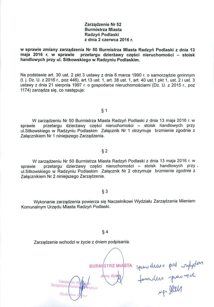 W zarządzeniu N r 5 0 B u r m i s t r z a M i a s t a Radzyń P o d l a s k i z d n i a 1 3 m a j a 2 0 1 6 r. w