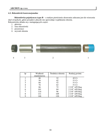 ARCHON sp. z o.o. 4.2. Rdzeniówki konwencjonalne Rdzeniówka pojedyncza typu B – o małym pierścieniu skrawania zalecana jest do wiercenia skał zwięzłych, gdzie przepływ płuczki nie spowoduje wypłukania rdzenia. Rdzeniówka składa się z następujących części: 1. głowica 2. rura rdzeniówki 3. poszerzacz 4. urywak rdzenia 4 3 lp 1 2 3 4 5 6 7 8 9 2 Wielkość znamionowa 46 56 66 76 86 101 116 131 146 1 Średnica rdzenia Rodzaj gwintu 32 42 52 62 72 84 96 109 120 42 Cr 51 Cr 51 Cr 51 Cr 2 3/8” API Reg 2 3/8” API Reg 2 3/8” API Reg 2 3/8” API Reg 2 3/8” API Reg 30 ARCHON sp. z o.o. Rdzeniówka podwójna typu T2, T6 – posiada dodatkową rurę która zabezpiecza rdzeń przed wypłukaniem. Rura ta nie obraca się w czasie wiercenia. Kompletna rdzeniówka składa się z następujących pozycji: 1. głowica rdzeniówki z systemem ułożyskowania rury wewnętrznej 2. rura zewnętrzna 3. rura wewnętrzna 4. poszerzacz 5. łącznik rury wewnętrznej 6. urywak rdzenia 7. korpus urywaka rdzenia 8. koronka 7 6 8 5 3 4 1 2 Wykonujemy rdzeniówki w standardowych długościach: 1m; 1,5m; 3m; 4,5m; 6m Wielkość znamionowa 46 56 66 76 86 101 76 86 101 116 131 146 Średnica rdzenia Rodzaj gwintu 32 42 52 62 72 84 57 67 79 93 108 123 42 Cr 51 Cr 51 Cr 51 Cr 2 3/8” 2 3/8” 51 Cr 60 Cr 2 3/8” 2 3/8” 2 3/8” 2 3/8” 31 Rdzeniówka T2 Rdzeniówka T6 ARCHON sp. z o.o. Rdzeniówka potrójna typu T6S - ta rdzeniówka ma większy pierścień skrawania gdyż można do niej włożyć trzecią (plastikową) rurę, która doskonale chroni rdzeń przed wypłukaniem. Kompletna rdzeniówka składa się z następujących pozycji: 1. głowica rdzeniówki z systemem ułożyskowania rury wewnętrznej 2. rura zewnętrzna 3. rura wewnętrzna 4. poszerzacz 5. łącznik rury wewnętrznej 6. urywak rdzenia 7. korpus urywaka rdzenia 8. koronka 9. rura osłonowa z kapturkami 7 6 8 5 3 4 1 2 9 Wykonujemy rdzeniówki w standardowych długościach: 1m; 1,5m; 3m; 4,5m; 6m Wielkość znamionowa Średnica rdzenia Rodzaj gwintu 101 116 131 146 76 90 103,5 118 2 3/8” 2 3/8” 2 3/8” 2 3/8” 32