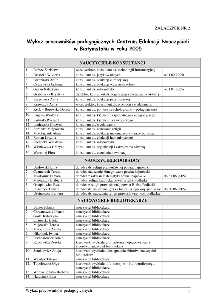 ZAŁĄCZNIK NR 2 Wykaz pracowników pedagogicznych Centrum Edukacji Nauczycieli w Białymstoku w roku 2005 NAUCZYCIELE KONSULTANCI 1. 2. 3. 4. 5. 6. 7. 8. 9. Babicz Zdzisław Blakicka Wiktoria Brzeziński Artur Czyżewska Jadwiga Gagan Katarzyna Grabowska Krystyna Karpowicz Anna Krawczuk Anna Ksok – Borowska Dorota 10. Kujawa Wioletta 11. Kuliński Ryszard 12. Łaniewska Grażyna 13. Łazarska Małgorzata 14. Mikołajczuk Alina 15. Roman Urszula 16. Suchocka Wiesława 17. Wiśniewska Grażyna 18. Worobiej Piotr wicedyrektor, konsultant ds. technologii informacyjnej konsultant ds. języków obcych konsultant ds. edukacji europejskiej konsultant ds. edukacji wczesnoszkolnej konsultant ds. informatyki dyrektor, konsultant ds. organizacji i zarządzania oświatą konsultant ds. edukacji przyrodniczej wicedyrektor, konsultant ds. promocji i wydawnictw konsultant ds. pomocy psychologiczno – pedagogicznej od 1.02.2005r od 1.01.2005r. konsultant ds. kształcenia specjalnego i integracyjnego konsultant ds. kształcenia zawodowego konsultant ds. wychowania konsultant ds. nauczania religii konsultant ds. edukacji matematyczno - przyrodniczej konsultant ds. edukacji humanistycznej konsultant ds. informatyki konsultant ds. organizacji i zarządzania oświatą konsultant ds. oceniania i ewaluacji NAUCZYCIELE DORADCY 1. 2. 3. 4. 5. 6. 7. Busłowska Lilla Czemerych Teresa Jawdosiuk Tamara Mateuszuk Elżbieta Ostapkowicz Ewa Rusaczyk Tamara Uścinowicz Barbara doradca ds. religii prawosławnej powiat hajnowski doradca nauczanie zintegrowane powiat hajnowski doradca z zakresu matematyki powiat hajnowski do 31.08.2005r. doradca, religia katolicka powiat Bielsk Podlaski doradca z religii prawosławnej powiat Bielsk Podlaski doradca ds. nauczania języka białoruskiego woj. podlaskie do 30.06.2005r. doradca ds. nauczania religii prawosławnej woj. podlaskie NAUCZYCIELE BIBLIOTEKARZE 1. 2. 3. 4. 5. 6. 7. 8. 9. Bakier Jolanta Chrzanowska Jolanta Gosk Katarzyna Łozowska Łucja Majewska Teresa Maciejczuk Aniela Nikołajuk Iwona Puchnarewicz Anatol Rutkowska Dorota 10. Stankiewicz Alicja 11. Wasiluk Tatiana 12. Topolewska Olga 13. Werpachowska Barbara 14. Harasimik Ewa nauczyciel bibliotekarz nauczyciel bibliotekarz nauczyciel bibliotekarz nauczyciel bibliotekarz nauczyciel bibliotekarz nauczyciel bibliotekarz nauczyciel bibliotekarz nauczyciel bibliotekarz kierownik wydziału gromadzenia i opracowywania zbiorów, nauczyciel bibliotekarz kierownik wydziału udostępniania zbiorów, nauczyciel bibliotekarz nauczyciel bibliotekarz kierownik wydziału informacyjno – bibliograficznego, nauczyciel bibliotekarz nauczyciel bibliotekarz nauczyciel bibliotekarz Wykaz pracowników pedagogicznych 1 15. 16. 17. 18. 19. Kraszewska Magdalena Skolimowska Bożena Konopka Małgorzata Grusza Tamara Grygoruk Irena nauczyciel bibliotekarz nauczyciel bibliotekarz nauczyciel bibliotekarz kierownik filii w Sokółce, nauczyciel bibliotekarz kierownik filii w Bielsku Podlaskim, nauczyciel bibliotekarz 20. Janicka Magdalena nauczyciel bibliotekarz – Filia w Mońkach 21. Krasnodębska-Chołuj Ewa kierownik filii w Siemiatyczach, nauczyciel bibliotekarz 22. Modzelewska Teresa nauczyciel bibliotekarz – Filia w Bielsku Podlaskim 23. Moroz Alina nauczyciel bibliotekarz – Filia w Hajnówce 24. Nowik Ewa nauczyciel bibliotekarz – Filia w Siemiatyczach 25. Prokopiuk Irena kierownik filii w Hajnówce, nauczyciel bibliotekarz 26. Raś Barbara kierownik filii w Mońkach, nauczyciel bibliotekarz 27. Śliż Teresa nauczyciel bibliotekarz – Filia w Sokółce Wykaz pracowników pedagogicznych od 6.01.2005r. od 24.10.2005r. 2
