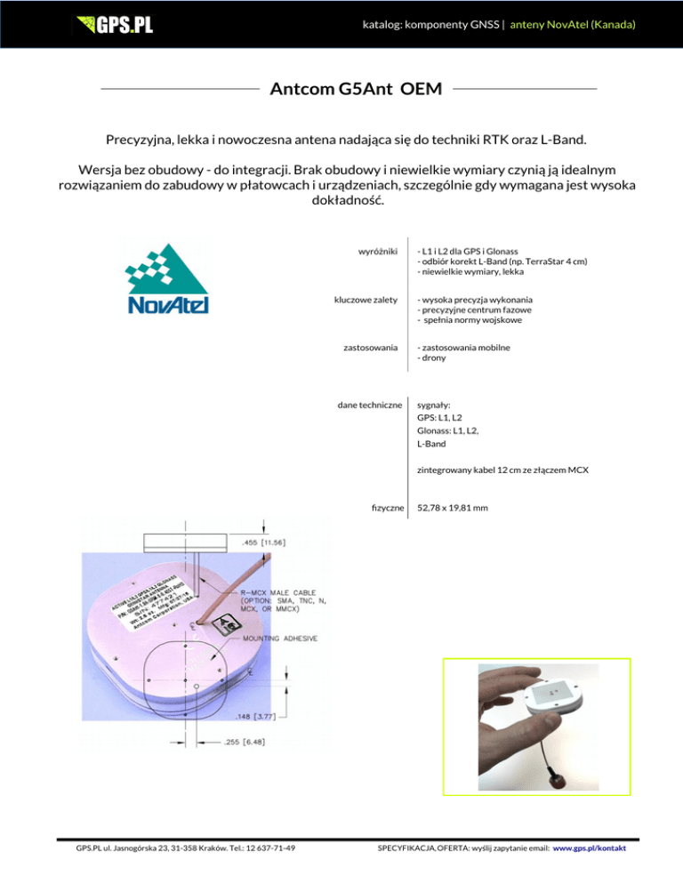 katalog: komponenty GNSS | anteny NovAtel (Kanada) Antcom G5Ant OEM Precyzyjna, lekka i nowoczesna antena nadająca się do techniki RTK oraz L-Band. Wersja bez obudowy - do integracji. Brak obudowy i niewielkie wymiary czynią ją idealnym rozwiązaniem do zabudowy w płatowcach i urządzeniach, szczególnie gdy wymagana jest wysoka dokładność. wyróżniki kluczowe zalety zastosowania dane techniczne - L1 i L2 dla GPS i Glonass - odbiór korekt L-Band (np. TerraStar 4 cm) - niewielkie wymiary, lekka - wysoka precyzja wykonania - precyzyjne centrum fazowe - spełnia normy wojskowe - zastosowania mobilne - drony sygnały: GPS: L1, L2 Glonass: L1, L2, L-Band zintegrowany kabel 12 cm ze złączem MCX fizyczne GPS.PL ul. Jasnogórska 23, 31-358 Kraków. Tel.: 12 637-71-49 52,78 x 19,81 mm SPECYFIKACJA, OFERTA: wyślij zapytanie email: www.gps.pl/kontakt