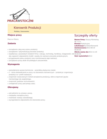 Kierownik Produkcji Polska, Sosnowiec Miejsce pracy Praca w Polsce. Szczegóły oferty Nazwa firmy: Snazzy Marketing Sp. z o.o. Zadania Branża:Produkcyjna Lokalizacja:Dyrektor/Kierownik Zamieszczono:2013-08-19 zarządzanie całą praca pionu produkcji, 00:00:00 zarządzanie i optymalizację procesów produkcji, Oferta ważna do:2013-11-19 współpracę z pozostałymi działami firmy ( zakupy, technolog, handlowy, księgowość), tak 00:00:00 Ilość wyświetleń:6512 aby zapewnić odpowiednie środki i zasoby do realizacji procesów produkcyjnych, ● ● ● ● ● przygotowanie planu produkcji oraz monitorowanie jego realizacji, zarządzanie pracą około 50 podległych pracowników. Wymagania ● ● ● ● ● wykształcenie wyższe techniczne – przeróbka plastyczna metali, 2 – letnie doświadczenie w pracy na stanowisku kierowniczym – produkcja i organizacja produkcji rur i profili stalowych, znajomość nowoczesnych metod zarządzania produkcją, dobra znajomość języka niemieckiego lub angielskiego, znajomość podstaw rachunkowości, umiejętność pracy pod presją czasu. Oferujemy ● ● ● ● zatrudnienie na umowę o pracę, niezbędne narzędzia pracy, możliwość rozwoju zawodowego, wynagrodzenie odpowiednie do stanowiska pracy.
