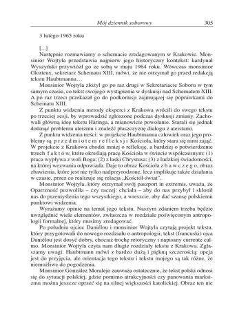 Mój dziennik soborowy 305 3 lutego 1965 roku [...] Następnie rozmawiamy o schemacie zredagowanym w Krakowie. Monsinior Wojtyła przedstawia najpierw jego historyczny kontekst: kardynał Wyszyński przywiózł go ze sobą w maju 1964 roku. Wówczas monsinior Glorieux, sekretarz Schematu XIII, mówi, że nie otrzymał go przed redakcją tekstu Haubtmanna… Monsinior Wojtyła złożył go po raz drugi w Sekretariacie Soboru w tym samym czasie, co tekst swojego wystąpienia w dyskusji nad Schematem XIII. A po raz trzeci przekazał go do podkomisji zajmującej się poprawkami do Schematu XIII. Z punktu widzenia metody eksperci z Krakowa wrócili do swego tekstu po trzeciej sesji, by wprowadzić zgłoszone podczas dyskusji zmiany. Zachowali główną ideę tekstu Häringa, a mianowicie powołanie. Starali się jednak dotknąć problemu ateizmu i znaleźć płaszczyznę dialogu z ateistami. Z punktu widzenia treści: w projekcie Haubtmanna człowiek oraz jego problemy są p r z e d m i o t e m r e f l e k s j i Kościoła, który stara się nimi zająć. W projekcie z Krakowa chodzi mniej o refleksję, a bardziej o potwierdzenie trzech f a k t ó w, które określają pracę Kościoła w świecie współczesnym: (1) praca wypływa z woli Boga; (2) z łaski Chrystusa; (3) z ludzkiej świadomości, na której wezwania odpowiada. Daje to obraz Kościoła z b a w c z e g o, obraz zbawienia, które jest nie tylko nadprzyrodzone, lecz implikuje także działania w czasie, przez co realizuje się relacja „Kościół-świat”. Monsinior Wojtyła, który otrzymał swój paszport in extremis, uważa, że Opatrzność pozwoliła – czy raczej: chciała – aby do nas przybył i skłonił nas do przemyślenia tego wszystkiego, a wreszcie, aby dać szansę polskiemu punktowi widzenia. Wyrażamy opinie na temat jego tekstu. Naszym zdaniem trzeba będzie uwzględnić wiele elementów, zwłaszcza w rozdziale poświęconym antropologii formalnej, który musimy zredagować. Po południu ojciec Daniélou i monsinior Wojtyła czytają projekt tekstu, który przygotowali do nowego rozdziału o antropologii; tekst (francuski) ojca Daniélou jest dosyć dobry, chociaż trochę retoryczny i napisany currente calmo. Monsinior Wojtyła czyta nam długie rozdziały tekstu z Krakowa. Zgłaszamy uwagi. Haubtmann mówi z bardzo dużą i piękną szczerością: opcja jest do przyjęcia, ale orientacja tego tekstu i tekstu mojego są tak różne, że niemożliwe do pogodzenia. Monsinior González Moralejo zauważa ostatecznie, że tekst polski odnosi się do sytuacji polskiej, gdzie pomimo atrakcyjności czy panowania marksizmu można jeszcze oprzeć się na silnej większości katolickiej. Obraz ten nie Yves CONGAR OP 306 odpowiada jednak sytuacji marksizmu w innych krajach, takich jak Chiny lub ZSRR. Postanowiono, że fragmenty krakowskie jako takie nie zostaną przyjęte, lecz zwróci się dużą uwagę na podobne idee. [...] 25 marca 1965 roku [...] Wieczorem, przy kolacji, trzech redaktorów schematu trzynastego oraz monsinior Kominek, polski biskup z Komisji Świeckich. Opowiada on niestrudzenie o sytuacji w Polsce – z wielką ufnością, a nawet z czymś w rodzaju owej zuchwałej wiary w Polskę, wiary, którą często dostrzegałem u moich polskich kolegów w niewoli. Według niego komunizm się zmienia, można mówić o pewnej ewolucji, o nieco większej swobodzie. Rosjanie są w Polsce znienawidzeni – tak samo, jak w Chinach. Rosjanie dużo rozmyślają nad żółtym zagrożeniem. W Polsce nikt nie wierzy w marksizm. Młodzi? Oni również nie. Spoglądają na Kościół dosyć krytycznie, ale jeśli jakiś młody, sympatyczny ksiądz chce być dla nich, wtedy za nim idą. Itd. Potem mówi: u nas nie można prowadzić takiej rozmowy, jak tutaj i wyrażać się tak s w o b o d n i e. [...] 3 kwietnia 1965 roku [...] Garonne i Wojtyła: dobrze określić, jakim prawem Sobór mówi do chrześcijan i mówi do niechrześcijan. [...] 25 października 1965 roku [...] Podkreślam głębię pytań stawianych przez ateizm, głęboką tożsamość jego metody z metodą ekumenizmu (jeśli potraktujemy ateizm jako duchowy świat wartości, a nie tylko jako fakt odejścia), konieczność uwrażliwienia pasterzy Kościoła oraz teologów: Sobór byłby jedyną okazją do podjęcia tych spraw – albo w czasie dyskusji nad Schematem XIII, albo po dyskusjach, podczas wykładów dla Ojców. [...]