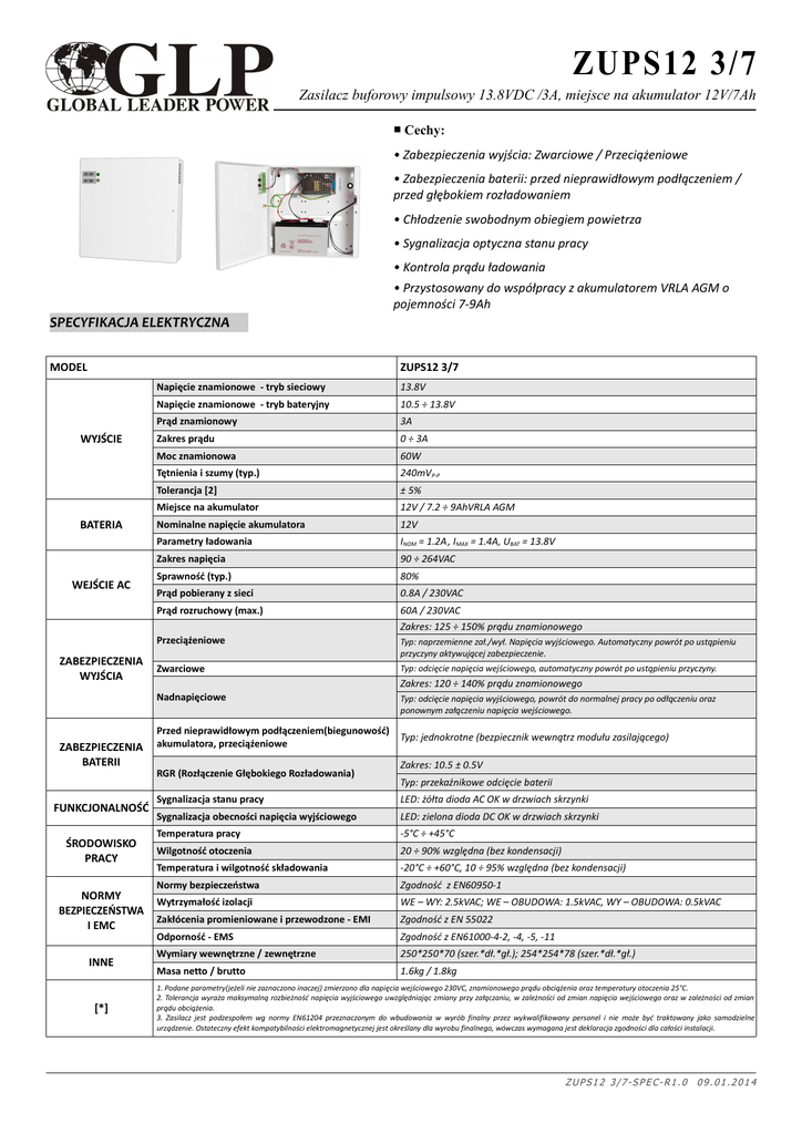 ZUPS12 3/7 3 Zasilacz buforowy impulsowy 13.8VDC /3A, miejsce na akumulator 12V/7Ah ■ Cechy: • Zabezpieczenia wyjścia: Zwarciowe / Przeciążeniowe • Zabezpieczenia baterii: przed nieprawidłowym podłączeniem / przed głębokiem rozładowaniem • Chłodzenie swobodnym obiegiem powietrza • Sygnalizacja optyczna stanu pracy • Kontrola prądu ładowania • Przystosowany do współpracy z akumulatorem VRLA AGM o pojemności 7-9Ah SPECYFIKACJA ELEKTRYCZNA MODEL ZUPS12 3/7 WYJŚCIE BATERIA WEJŚCIE AC ZABEZPIECZENIA WYJŚCIA Napięcie znamionowe - tryb sieciowy 13.8V Napięcie znamionowe - tryb bateryjny 10.5 ÷ 13.8V Prąd znamionowy 3A Zakres prądu 0 ÷ 3A Moc znamionowa 60W Tętnienia i szumy (typ.) 240mVP-P Tolerancja [2] ± 5% Miejsce na akumulator 12V / 7.2 ÷ 9AhVRLA AGM Nominalne napięcie akumulatora 12V Parametry ładowania INOM = 1.2A , IMAX = 1.4A, UBAT = 13.8V Zakres napięcia 90 ÷ 264VAC Sprawność (typ.) 80% Prąd pobierany z sieci 0.8A / 230VAC Prąd rozruchowy (max.) 60A / 230VAC Zakres: 125 ÷ 150% prądu znamionowego Przeciążeniowe Typ: naprzemienne zał./wył. Napięcia wyjściowego. Automatyczny powrót po ustąpieniu przyczyny aktywującej zabezpieczenie. Zwarciowe Typ: odcięcie napięcia wejściowego, automatyczny powrót po ustąpieniu przyczyny. Zakres: 120 ÷ 140% prądu znamionowego Nadnapięciowe ZABEZPIECZENIA BATERII FUNKCJONALNOŚĆ ŚRODOWISKO PRACY NORMY BEZPIECZEŃSTWA I EMC INNE [*] Przed nieprawidłowym podłączeniem(biegunowość) akumulatora, przeciążeniowe RGR (Rozłączenie Głębokiego Rozładowania) Typ: odcięcie napięcia wyjściowego, powrót do normalnej pracy po odłączeniu oraz ponownym załączeniu napięcia wejściowego. Typ: jednokrotne (bezpiecznik wewnątrz modułu zasilającego) Zakres: 10.5 ± 0.5V Typ: przekaźnikowe odcięcie baterii Sygnalizacja stanu pracy LED: żółta dioda AC OK w drzwiach skrzynki Sygnalizacja obecności napięcia wyjściowego LED: zielona dioda DC OK w drzwiach skrzynki Temperatura pracy -5°C ÷ +45°C Wilgotność otoczenia 20 ÷ 90% względna (bez kondensacji) Temperatura i wilgotność składowania -20°C ÷ +60°C, 10 ÷ 95% względna (bez kondensacji) Normy bezpieczeństwa Zgodność z EN60950-1 Wytrzymałość izolacji WE – WY: 2.5kVAC; WE – OBUDOWA: 1.5kVAC, WY – OBUDOWA: 0.5kVAC Zakłócenia promieniowane i przewodzone - EMI Zgodność z EN 55022 Odporność - EMS Zgodność z EN61000-4-2, -4, -5, -11 Wymiary wewnętrzne / zewnętrzne 250*250*70 (szer.*dł.*gł.); 254*254*78 (szer.*dł.*gł.) Masa netto / brutto 1.6kg / 1.8kg 1. Podane parametry(jeżeli nie zaznaczono inaczej) zmierzono dla napięcia wejściowego 230VC, znamionowego prądu obciążenia oraz temperatury otoczenia 25°C. 2. Tolerancja wyraża maksymalną rozbieżność napięcia wyjściowego uwzględniając zmiany przy załączaniu, w zależności od zmian napięcia wejściowego oraz w zależności od zmian prądu obciążenia. 3. Zasilacz jest podzespołem wg normy EN61204 przeznaczonym do wbudowania w wyrób finalny przez wykwalifikowany personel i nie może być traktowany jako samodzielne urządzenie. Ostateczny efekt kompatybilności elektromagnetycznej jest określany dla wyrobu finalnego, wówczas wymagana jest deklaracja zgodności dla całości instalacji. ZUPS1 2 3/7-SP EC- R1.0 09.01.2014 ZUPS12 3/7 3 Zasilacz buforowy impulsowy 13.8VDC /3A, miejsce na akumulator 12V/7Ah SPECYFIKACJA MECHANICZNA Moduł zasilający – wejście Nr Funkcja TAMPER Opis Nr Funkcja Opis CN1:1 AC/L Zacisk fazowy napięcia wejściowego 1 NO Styk normalnie otwarty przycisku antysabotażowego CN1:2 AC/N Zacisk neutralny napięcia wejściowego 2 COM Styk wspólny otwarty przycisku antysabotażowego CN1:3 GND Zacisk uziemiający Moduł RGR – wyjście i bateria CN1: 1 VOUT+ Zacisk dodatni napięcia wyjściowego CN2: 2 VOUT- Zacisk ujemny napięcia wyjściowego CN3: 3 BAT+ (czerwony) konektor żeński 6.3x0.7 Zacisk dodatni akumulatora CN3: 4 BAT- (czarny) konektor żeński 6.3x0.7 Zacisk ujemny akumulatora Dioda LED AC OK (żółta) Dioda LED DC OK (zielona) Opis Uwagi Praca normalna – tryb sieciowy - nie świeci Praca w trybie bateryjnym, zanik sieci Mógł zostać uszkodzony bezpiecznik sieciowy Brak napięcia wejściowego oraz wyjściowego Mógł zostać uszkodzony bezpiecznik sieciowy i bateryjny - świeci ZUPS1 2 3/7-SP EC- R1.0 09.01.2014