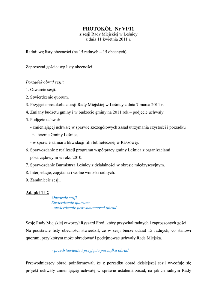 PROTOKÓŁ Nr VI/11 z Sesji Rady Miejskiej w Leśnicy z