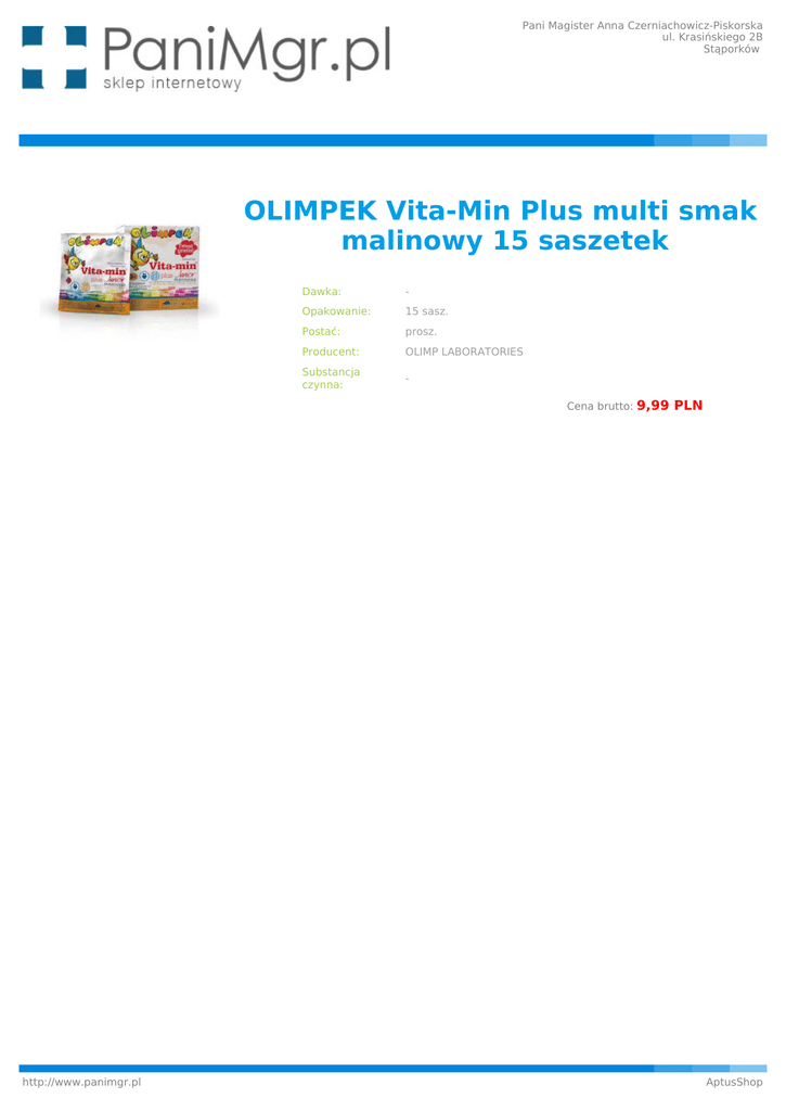 Pani Magister Anna Czerniachowicz-Piskorska ul. Krasińskiego 2B Stąporków OLIMPEK Vita-Min Plus multi smak malinowy 15 saszetek Dawka: - Opakowanie: 15 sasz. Postać: prosz. Producent: OLIMP LABORATORIES Substancja czynna: Cena brutto: http://www.panimgr.pl 9,99 PLN AptusShop