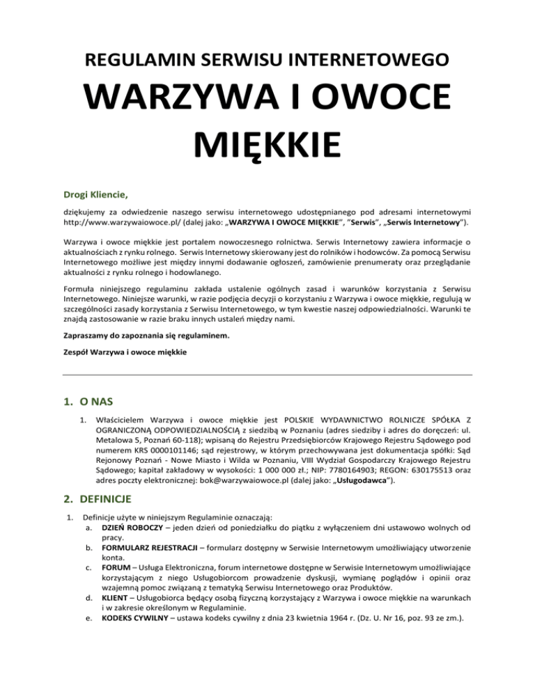 REGULAMIN SERWISU INTERNETOWEGO WARZYWA I OWOCE MIĘKKIE Drogi Kliencie, dziękujemy za odwiedzenie naszego serwisu internetowego udostępnianego pod adresami internetowymi http://www.warzywaiowoce.pl/ (dalej jako: „WARZYWA I OWOCE MIĘKKIE”, ”Serwis”, „Serwis Internetowy”). Warzywa i owoce miękkie jest portalem nowoczesnego rolnictwa. Serwis Internetowy zawiera informacje o aktualnościach z rynku rolnego. Serwis Internetowy skierowany jest do rolników i hodowców. Za pomocą Serwisu Internetowego możliwe jest między innymi dodawanie ogłoszeń, zamówienie prenumeraty oraz przeglądanie aktualności z rynku rolnego i hodowlanego. Formuła niniejszego regulaminu zakłada ustalenie ogólnych zasad i warunków korzystania z Serwisu Internetowego. Niniejsze warunki, w razie podjęcia decyzji o korzystaniu z Warzywa i owoce miękkie, regulują w szczególności zasady korzystania z Serwisu Internetowego, w tym kwestie naszej odpowiedzialności. Warunki te znajdą zastosowanie w razie braku innych ustaleń między nami. Zapraszamy do zapoznania się regulaminem. Zespół Warzywa i owoce miękkie 1. O NAS 1. Właścicielem Warzywa i owoce miękkie jest POLSKIE WYDAWNICTWO ROLNICZE SPÓŁKA Z OGRANICZONĄ ODPOWIEDZIALNOŚCIĄ z siedzibą w Poznaniu (adres siedziby i adres do doręczeń: ul. Metalowa 5, Poznań 60-118); wpisaną do Rejestru Przedsiębiorców Krajowego Rejestru Sądowego pod numerem KRS 0000101146; sąd rejestrowy, w którym przechowywana jest dokumentacja spółki: Sąd Rejonowy Poznań - Nowe Miasto i Wilda w Poznaniu, VIII Wydział Gospodarczy Krajowego Rejestru Sądowego; kapitał zakładowy w wysokości: 1 000 000 zł.; NIP: 7780164903; REGON: 630175513 oraz adres poczty elektronicznej: [email protected] (dalej jako: „Usługodawca”). 2. DEFINICJE 1. Definicje użyte w niniejszym Regulaminie oznaczają: a. DZIEŃ ROBOCZY – jeden dzień od poniedziałku do piątku z wyłączeniem dni ustawowo wolnych od pracy. b. FORMULARZ REJESTRACJI – formularz dostępny w Serwisie Internetowym umożliwiający utworzenie konta. c. FORUM – Usługa Elektroniczna, forum internetowe dostępne w Serwisie Internetowym umożliwiające korzystającym z niego Usługobiorcom prowadzenie dyskusji, wymianę poglądów i opinii oraz wzajemną pomoc związaną z tematyką Serwisu Internetowego oraz Produktów. d. KLIENT – Usługobiorca będący osobą fizyczną korzystający z Warzywa i owoce miękkie na warunkach i w zakresie określonym w Regulaminie. e. KODEKS CYWILNY – ustawa kodeks cywilny z dnia 23 kwietnia 1964 r. (Dz. U. Nr 16, poz. 93 ze zm.). f. KONTO – Usługa Elektroniczna; oznaczony indywidualnym adresem poczty elektronicznej (adres email) i hasłem podanym przez Usługobiorcę zbiór zasobów w systemie teleinformatycznym Usługodawcy; w którym gromadzone są dane podane przez Usługobiorcę oraz informacje o zamieszczonych przez niego danych w Serwisie Internetowym. g. NEWSLETTER – Usługa Elektroniczna, elektroniczna usługa dystrybucyjna świadczona przez Usługodawcę za pośrednictwem poczty elektronicznej e-mail, która umożliwia wszystkim korzystającym z niej Usługobiorcom automatyczne otrzymywanie od Usługodawcy cyklicznych treści kolejnych edycji newslettera zawierającego informacje o Ogłoszeniach, nowościach i promocjach w Serwisie Internetowym. h. PRAWO AUTORSKIE – ustawa o prawie autorskim i prawach pokrewnych z dnia 4 lutego 1994 r. (Dz. U. Nr 24, poz. 83 ze zm.) i. REGULAMIN – niniejszy regulamin Serwisu Internetowego. j. SERWIS INTERNETOWY, SERWIS, WARZYWA I OWOCE MIĘKKIE - serwis internetowy Usługodawcy dostępny pod adresami internetowymi http://warzywaiowoce.pl/oraz http://www.warzywaiowoce.pl/. k. USŁUGA ELEKTRONICZNA – usługa świadczona drogą elektroniczną przez Usługodawcę na rzecz Usługobiorcy za pośrednictwem Serwisu Internetowego zgodnie z Regulaminem. l. USŁUGOBIORCA – (1) osoba fizyczna posiadająca pełną zdolność do czynności prawnych; (2) osoba prawna; albo (3) jednostka organizacyjna nieposiadająca osobowości prawnej, której ustawa przyznaje zdolność prawną; - korzystająca albo zamierzająca korzystać z Usług Elektronicznych dostępnych w Warzywa i owoce miękkie. m. USŁUGODAWCA - POLSKIE WYDAWNICTWO ROLNICZE SPÓŁKA Z OGRANICZONĄ ODPOWIEDZIALNOŚCIĄ z siedzibą w Poznaniu (adres siedziby i adres do doręczeń: ul. Metalowa 5, Poznań 60-118); wpisaną do Rejestru Przedsiębiorców Krajowego Rejestru Sądowego pod numerem KRS 0000101146; sąd rejestrowy, w którym przechowywana jest dokumentacja spółki: Sąd Rejonowy Poznań - Nowe Miasto i Wilda w Poznaniu, VIII Wydział Gospodarczy Krajowego Rejestru Sądowego; kapitał zakładowy w wysokości: 1 000 000 zł.; NIP: 7780164903; REGON: 630175513 oraz adres poczty elektronicznej [email protected]. n. USTAWA O PRAWACH KONSUMENTA, USTAWA – ustawa z dnia 30 maja 2014 r. o prawach konsumenta (Dz.U. 2014 poz. 827 ze zm.). 3. OGÓLNE WARUNKI KORZYSTANIA Z WARZYWA I OWOCE MIĘKKIE 1. 2. 3. 4. 5. Niniejszy Regulamin skierowany jest zarówno do konsumentów, jak i do przedsiębiorców korzystających z Serwisu Internetowego, z zastrzeżeniem postanowień skierowanych wyraźnie jedynie do konsumentów albo do przedsiębiorców. Postanowienia niniejszego Regulaminu nie mają na celu wyłączać ani ograniczać jakichkolwiek praw konsumentów przysługujących im na mocy bezwzględnie wiążących przepisów prawa. W przypadku ewentualnej niezgodności postanowień niniejszego Regulaminu z powyższymi przepisami, pierwszeństwo mają te przepisy i należy je stosować. Usługobiorca obowiązany jest do korzystania z Warzywa i owoce miękkie w sposób zgodny z prawem i dobrymi obyczajami mając na uwadze poszanowanie dóbr osobistych oraz praw autorskich i własności intelektualnej Usługodawcy oraz osób trzecich. Usługobiorca obowiązany jest do wprowadzania danych zgodnych ze stanem faktycznym. Usługobiorcę obowiązuje zakaz dostarczan