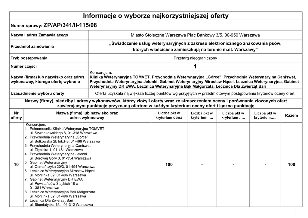 Informacje o wyborze najkorzystniejszej oferty Numer sprawy: ZP/AP/341/II-115/08 Miasto Stołeczne Warszawa Plac Bankowy 3/5, 00-950 Warszawa Nazwa i adres Zamawiającego „Świadczenie usług weterynaryjnych z zakresu elektronicznego znakowania psów, których właściciele zamieszkują na terenie m.st. Warszawy” Przedmiot zamówienia Tryb postępowania Przetarg nieograniczony 1 Numer części Nazwa (firma) lub nazwisko oraz adres wykonawcy, którego ofertę wybrano Uzasadnienie wyboru oferty Konsorcjum: Klinika Weterynaryjna TOMVET, Przychodnia Weterynaryjna „Górce”, Przychodnia Weterynaryjna Caniswet, Przychodnia Weterynaryjna Jelonki, Gabinet Weterynaryjny Mirosław Hącel, Lecznica Weterynaryjna, Gabinet Weterynaryjny DR EWA, Lecznica Weterynaryjna Bąk Małgorzata, Lecznica Dla Zwierząt Bari Oferta uzyskała największa liczbę punktów wg przyjętych w przedmiotowym postępowaniu kryteriów oceny ofert Nazwy (firmy), siedziby i adresy wykonawców, którzy złoŜyli oferty wraz ze streszczeniem oceny i porównania złoŜonych ofert zawierającym punktację przyznaną ofertom w kaŜdym kryterium oceny ofert i łączną punktację Nr oferty 10 Nazwa (firma) lub nazwisko oraz adres wykonawcy Konsorcjum: 1. Pełnomocnik: Klinika Weterynaryjna TOMVET ul. Szwankowskiego 8, 01-318 Warszawa 2. Przychodnia Weterynaryjna „Górce” ul. Bolkowska 2b lok.H3, 01-466 Warszawa 3. Przychodnia Weterynaryjna Caniswet ul. Ziębicka 1, 01-461 Warszawa 4. Przychodnia Weterynaryjna Jelonki ul. Borowej Góry 3, 01-354 Warszawa 5. Gabinet Weterynaryjny ul. Osmańczyka 20/3, 01-494 Warszawa 6. Lecznica Weterynaryjna Mirosław Hącel ul. Morcinka 32, 01-496 Warszawa 7. Gabinet Weterynaryjny DR EWA ul. Powstańców Śląskich 18 c 01-381 Warszawa 8. Lecznica Weterynaryjna Bąk Małgorzata ul. Morcinka 32, 01-496 Warszawa 9. Lecznica Dla Zwierząt Bari ul. Siemiatycka 15a, 01-312 Warszawa Liczba pkt w kryterium cena Liczba pkt w kryterium …. Liczba pkt w kryterium ….. Liczba pkt w kryterium….. Razem 100 - - - 100 1 2 Numer części Nazwa (firma) lub nazwisko oraz adres wykonawcy, którego ofertę wybrano Uzasadnienie wyboru oferty Konsorcjum: Całodobowa Klinika Weterynaryjna „VETKA”, Przychodnia Weterynaryjna RADWET, Gabinet Weterynaryjny Luxvet, Lecznica Weterynaryjna Centrum Zdrowia Małych Zwierząt, Przychodnia Weterynaryjna AMICULUS Oferta uzyskała największa liczbę punktów wg przyjętych w przedmiotowym postępowaniu kryteriów oceny ofert Nazwy (firmy), siedziby i adresy wykonawców, którzy złoŜyli oferty wraz ze streszczeniem oceny i porównania złoŜonych ofert zawierającym punktację przyznaną ofertom w kaŜdym kryterium oceny ofert i łączną punktację Nr oferty 14 Nazwa (firma) lub nazwisko oraz adres wykonawcy Konsorcjum: 1. Pełnomocnik: Całodobowa Klinika Weterynaryjna „VETKA” ul. Modlińska 65, 03-199 Warszawa 2. RADWET Przychodnia Weterynaryjna ul. Myśliborska 104, 03-185 Warszawa 3. Gabinet Weterynaryjny Luxvet ul. Modlińska 331, 03-151 Warszawa 4. Lecznica Weterynaryjna Centrum Zdrowia Małych Zwierząt ul. Śreniawitów 9, 03-188 Warszawa 5. Przychodnia Weterynaryjna AMICULUS ul. Pancerna 6 A, 03-187 Warszawa Numer części Nazwa (firma) lub nazwisko oraz adres wykonawcy, którego ofertę wybrano Uzasadnienie wyboru oferty Liczba pkt w kryterium cena Liczba pkt w kryterium .......... - 100 Liczba pkt w kryterium ........... Liczba pkt w kryterium ...... Razem - - 100 3 Polskie Towarzystwo Rejestracji i Identyfikacji Zwierząt ul. Wały Piastowskie 1, 80-855 Gdańsk Oferta uzyskała największa liczbę punktów wg przyjętych w przedmiotowym postępowaniu kryteriów oceny ofert Nazwy (firmy), siedziby i adresy wykonawców, którzy złoŜyli oferty wraz ze streszczeniem oceny i porównania złoŜonych ofert zawierającym punktację przyznaną ofertom w kaŜdym kryterium oceny ofert i łączną punktację 2 Nr oferty 1 19 Nazwa (firma) lub nazwisko oraz adres wykonawcy Konsorcjum: 1. Pełnomocnik: Gabinet Weterynaryjny, ul. Conrada 13, 01-922 Warszawa 2. Gabinet Weterynaryjny, Jerzy Czubak ul. Staffa 59, 01-884 Warszawa 3. Gabinet Weterynaryjny, ul. Klaudyny 32, 01-684 Warszawa 4. Gabinet Weterynaryjny, ul. Wolumen 53, 01-912 Warszawa 5. Gabinet Weterynaryjny Anna Pomianowska, ul. Staffa 2, 01-891 Warszawa 6. Prywatna Lecznica Zwierząt Anima s.c. J. Sobczyk, J. Jędruch, K. Ratajska-Michalczak, B. Barańska, ul. RóŜana 71, 02-569 Warszawa 7. Przychodnia Weterynaryjna, ul. Conrada 4a, 01-922 Warszawa Polskie Towarzystwo Rejestracji i Identyfikacji Zwierząt, ul. Wały Piastowskie 1 80-855 Gdańsk Numer części Nazwa (firma) lub nazwisko oraz adres wykonawcy, którego ofertę wybrano Uzasadnienie wyboru oferty Liczba pkt w kryterium cena Liczba pkt w kryterium ........ 53,94 - 100 - Liczba pkt w kryterium ......... Liczba pkt w kryterium ....... Razem - - 53,94 - - 100 4 Konsorcjum: Centrum Zdrowia Małych Zwierząt MULTIWET Spółka Cywilna, Gabinet Weterynaryjny Zygmunt Kudelski, Prima-Vet Magdalena Zdanowska, Przychodnia Weterynaryjna Sfora, Lecznica Zwierząt Janusz Gawliński, Lecznica Weterynaryjna Hau-Miau s. c, Prywatna Lecznica Zwierząt Anima s.c., Gabinet Weterynaryjny Vitea Vet, Przychodnia Weterynaryjna na Katalońskiej, Gabinet Weterynaryjny „Prima-Vet”, Klinika Weterynaryjna Elwet s. c., Przychodnia Weterynaryjna Nova, Gabinet Weterynaryjny Tomasz Kuszewski, Przychodnia Weterynaryjna Vets, Lecznica Weterynaryjna Morskie Oko, Oferta uzyskała największa liczbę punktów wg przyjętych w przedmiotowym postępowaniu kryteriów oceny ofert Nazwy (firmy), siedziby i adresy wykonawców, którzy złoŜyli oferty wraz ze streszczeniem oceny i porównania złoŜonych ofert zawierającym punktację przyznaną ofertom w kaŜdym kryterium oceny ofert i łączną punktację 3 Nr oferty Nazwa (firma) lub nazwisko oraz adres wykonawcy Liczba pkt w kryterium cena 18 Konsorcjum: 1. Pełnomocnik: Centrum Zdrowia Małych Zwierząt MULTIWET Spółka 