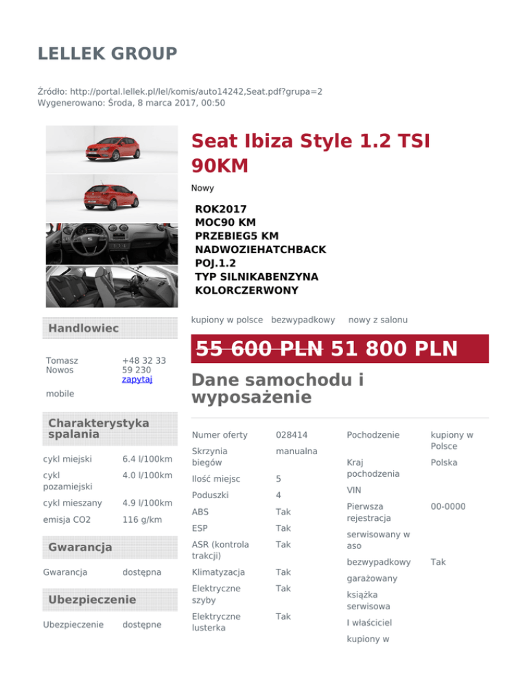 LELLEK GROUP Źródło: http://portal.lellek.pl/lel/komis/auto14242,Seat.pdf?grupa=2 Wygenerowano: Środa, 8 marca 2017, 00:50 Seat Ibiza Style 1.2 TSI 90KM Nowy ROK2017 MOC90 KM PRZEBIEG5 KM NADWOZIEHATCHBACK POJ.1.2 TYP SILNIKABENZYNA KOLORCZERWONY kupiony w polsce bezwypadkowy Handlowiec Tomasz Nowos +48 32 33 59 230 zapytaj mobile Charakterystyka spalania 55 600 PLN 51 800 PLN Dane samochodu i wyposażenie Numer oferty 028414 cykl miejski 6.4 l/100km Skrzynia biegów manualna cykl pozamiejski 4.0 l/100km Ilość miejsc 5 cykl mieszany 4.9 l/100km Poduszki 4 emisja CO2 116 g/km ABS Tak ESP Tak ASR (kontrola trakcji) Tak Klimatyzacja Tak Elektryczne szyby Tak Elektryczne lusterka Tak Gwarancja Gwarancja dostępna Ubezpieczenie Ubezpieczenie dostępne nowy z salonu Pochodzenie kupiony w Polsce Kraj pochodzenia Polska VIN Pierwsza rejestracja 00-0000 serwisowany w aso bezwypadkowy garażowany książka serwisowa I właściciel kupiony w Tak Kredyt Kredyt dostępny Zeskanuj kod, aby zobaczyć ofertę online salonie Wspomaganie kierownicy Tak Komputer Tak homologacja Radioodtwarza cz Tak stan idealny Immobilizer Tak właściciel niepalący Centralny zamek Tak Światła przeciwmgieln e Tak Czujniki parkowania Tak Kierownica wielofunkcyjna Tak Bluetooth Tak Alufelgi 15" Miejsce postoju Gliwice ul. Portowa 2 tunning Opis dodatkowy Samochód fabrycznie NOWY Samochód dealera LELLEK GLIWICE, nr: 0284124 Pojazd dostępny fizycznie w salonie Seat Auto Centrum Gliwice przy ul. Portowej 2 Pojazd posiada 4 letnią gwarancję fabryczną. SEAT IBIZA 1.2 TSI 90 KM STYLE Wybrane elementy standardowego wyposażenia: - ABS, ESC, ASR I EBA - Asystent podjazdu - System kontroli ciśnienia w oponach - Automatyczny hamulec pokolizyjny - Zaczepy ISOFIX - Elektrycznie regulowane i podgrzewane lusterka boczne - Klimatyzacja manualna - Komputer pokładowy - Elektrycznie sterowane szyby z przodu - Media System Colour – 5 calowy kolorowy ekran dotykowy - USB, SD, Aux-in, 6 głośników - Światła do jazdy dziennej - Reflektory przeciwmgielne z przodu z funkcją doświetlania zakrętów - Chromowane elementy dekoracyjne deski rozdzielczej Dodatkowo Pakiet Comfort + : - Czujniki parkowania, - 15-calowe felgi aluminiowe IBIA, - Pakiet LED: Podwójne reflektory ze światłami do jazdy dziennej LED i tylne światła LED CENA KATALOGOWA: 55 600 PLN KORZYŚĆ: 3800 PLN CENA PROMOCYJNA: 51 800 PLN DOSTĘPNE FORMY FINANSOWANIA ZAKUPU: KREDYT 3,99% LEASING 101,99% PRZYJMUJEMY W ROZLICZENIU AUTA UŻYWANE WSZYSTKICH MAREK W RAZIE PYTAŃ PROSIMY O KONTAKT Z DZIAŁEM HANDLOWYM 32 335 92 31 wew. 0233 * ZDJĘCIA POGLĄDOWE Informacje od handlowca 028412 Nota prawna Informacja nie stanowi oferty w rozumieniu art. 66 Kodeksu Cywilnego. Podane dane mają charakter wyłącznie informacyjny. Pełna informacja dostępna jest u handlowca. Sprzedający nie odpowiada za ewentualne błędy lub nieaktualność ogłoszenia.