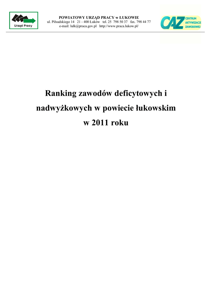POWIATOWY URZĄD PRACY w ŁUKOWIE ul. Piłsudskiego 14 21 - 400 Łuków tel. 25 798 50 37 fax. 798 44 77 e-mail: [email protected] http://www.praca.lukow.pl/ Ranking zawodów deficytowych i nadwyżkowych w powiecie łukowskim w 2011 roku Spis treści WSTĘP……………………………………………………………….str. 3 ROZDZIAŁ I………………………………………………………….str. 4 Analiza bezrobocia w powiecie według zawodów (grup zawodów) ROZDZIAŁ II…………………………………………………………str. 9 Analiza ofert pracy zarejestrowanych w powiecie według zawodów (grup zawodów) ROZDZIAŁ III………………………………………………………..str. 12 Analiza zawodów deficytowych i nadwyżkowych ROZDZIAŁ IV……………………………………………………….str. 17 Osoby Bezrobotne i oferty pracy wg Polskiej Klasyfikacji Działalności WNIOSKI……………………………………………………………str. 19 WSTĘP Raport zawiera analizę zawodów deficytowych i nadwyżkowych na terenie powiatu łukowskiego. Ogólna powierzchnia powiatu wynosi 1395 km2. W jego skład wchodzą następujące miasta: Łuków i Stoczek Łukowski oraz gminy: Adamów, Krzywda, Łuków, Serokomla, Stanin, Stoczek Łukowski, Trzebieszów, Wojcieszków, Wola Mysłowska. Powiat łukowski jest typowym regionem rolniczo-przemysłowym. Gospodarka opiera się na produkcji rolnej małych i średnich gospodarstw, przetwórstwie spożywczym, przemyśle odzieżowym, obuwniczym oraz handlu zarówno hurtowym jak i detalicznym. Utworzone firmy przez bezrobotnych to najczęściej zakłady usługowe z zakresu budownictwa, usługi leśne, usługi remontowo-budowlane, handel art. spożywczoprzemysłowymi, usługi krawieckie, mechanika pojazdowa, usługi fryzjerskie, kosmetyczne. Monitoring zawodów deficytowych i nadwyżkowych to proces systematycznego obserwowania zjawisk zachodzących na rynku pracy dotyczących kształtowania popytu na pracę i podaży zasobów pracy w przekroju terytorialno – zawodowym oraz formułowania na tej podstawie ocen, wniosków i krótkotrwałych prognoz niezbędnych dla prawidłowego funkcjonowania systemów: szkolenia bezrobotnych oraz kształcenia zawodowego. Głównym celem badania zawodów deficytowych i nadwyżkowych jest stworzenie ich rankingu, które stanowią narzędzie dla monitoringu. Źródłem do opracowania monitoringu zawodów deficytowych i nadwyżkowych była aplikacja informatyczna opracowana według zaleceń metodycznych do prowadzenia monitoringu zawodów deficytowych i nadwyżkowych Departamentu Rynku Pracy w MPiPS, Sprawozdania zostały umieszczone na stronie http://mz.praca.gov.pl. ROZDZIAŁ I Analiza bezrobocia w powiecie według zawodów ( grup zawodów) Na koniec 2011r. w tutejszym u rzędzie było zarejestrowanych 5232 osoby w tym 2814 kobiet. Figurujących w ewidencji ponad 12 miesięcy było 1023 osób tj. prawie 17,8 % ogółu bezrobotnych z tego 616 kobiet. Osoby, które ukończyły szkoły zawodowe, średnie i wyższe oraz u których nie minęło 12 miesięcy od daty ukończenia szkoły wskazanej na świadectwie lub dyplomie, czyli absolwentów figurowało 523 w tym 293 kobiety. Tabela 1. Bezrobotni wg zawodów w powiecie (najliczniejsze grupy). Stan w końcu 2011 roku W tym Lp . Nazwa zawodu 1. 2. 3. 4. 5. 6. 7. 8. 9. 10. 11. 12. 11. Bez zawodu Sprzedawca Obuwnik przemysłowy Technik ekonomista Krawiec Ślusarz Kucharz małej gastronomii Robotnik budowlany Technik mechanik Piekarz Murarz Robotnik pomocniczy w przemyskie przetwórczym Robotnik gospodarczy Bezrobotni ogółem Kobiety Absolwenci Pow. 12 m-cy Razem Kobiety Razem Kobiety 894 496 173 97 33 22 366 312 23 17 114 104 239 201 0 0 50 41 136 105 11 9 27 23 160 154 3 3 43 42 107 1 0 0 26 1 126 80 32 14 16 14 109 0 0 0 30 0 104 6 6 0 15 2 49 8 3 0 11 3 72 0 1 0 18 0 77 42 0 0 24 18 58 16 1 0 21 6 4 13. 14. 15. Szwaczka Specjalista administracji publicznej Technik żywienia i gospodarstwa domowego Ogółem bezrobotni 61 60 0 0 19 19 63 42 14 9 11 8 56 44 10 8 7 6 5232 2814 523 293 1023 616 Źródło: Opracowanie własne PUP W tabeli zostały uwzględnione tylko te zawody, w których figurowało, co najmniej 50 osób. Jak wynika z powyższej tabeli grupa osób bez zawodu stanowiła 17,09 % ogółu bezrobotnych. Z osób posiadających zawód wyuczony lub wykonywany (podobnie jak w roku ubiegłym) najliczniejszą grupę stanowili sprzedawcy tj. 366 osób. Tendencja ta nie zmienia się od kilku lat. Wśród kobiet najwięcej figurowało sprzedawców tj. 312 osób, krawcowych 154 osoby oraz obuwników przemysłowych 201. Spośród mężczyzn najwięcej figurowało ślusarzy 106 osób oraz robotników budowlanych 109 osób, techników mechaników 98, bez zawodu było 398 mężczyzn. Tabela 2. Struktura bezrobotnych wg grup zawodowych w powiecie (najliczniejsze grupy). L.p. Kod grupy Nazwa grupy zawodu zawodu Ogółem bezrobotni w % w 2011 r. Robotnicy w przetwórstwie spożywczym, 1. 75 obróbce drewna, produkcji wyrobów tekstylnych 14,31 i pokrewni 2. 52 3. 51 4. 72 5. 71 6. 93 Sprzedawcy i pokrewni Pracownicy usług osobistych Robotnicy obróbki metali, mechanicy maszyn i urządzeń i pokrewni Robotnicy budowlani i pokrewni Robotnicy pomocniczy w górnictwie, przemyśle, budownictwie i transporcie 9,56 7,97 8,22 5,67 6,89 Źródło: Opracowania własne PUP 5 Analizując duże grupy zawodowe (wg kodów dwucyfrowych) największą grupę stanowią robotnicy w przetwórstwie spożywczym, obróbce drewna, produkcji wyrobów tekstylnych i pokrewni, w tym kobiety stanowią 14,31 % ogółu. Natomiast wśród mężczyzn dominują zawody robotnicze ( robotnicy budowlani i pokrewni, robotnicy obróbki metali, mechanicy maszyn i urządzeń i pokrewni) Tabela 3. Struktura napływu bezrobotnych wg grup zawodowych w powiecie (najliczniejsze grupy) w 2011 r. Kod L.p. Bezrobotni grupy Nazwa grupy zawodów zawodó w ogółem % w 2011
