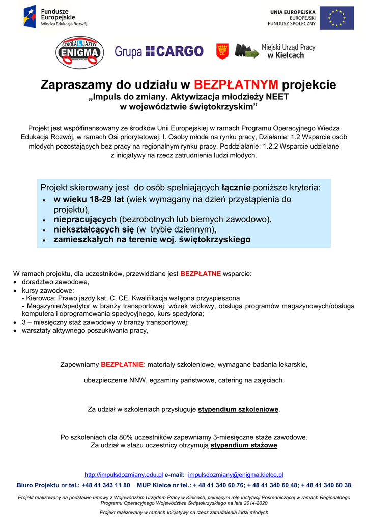 Zapraszamy do udziału w BEZPŁATNYM projekcie „Impuls do zmiany. Aktywizacja młodzieży NEET w województwie świętokrzyskim” Projekt jest współfinansowany ze środków Unii Europejskiej w ramach Programu Operacyjnego Wiedza Edukacja Rozwój, w ramach Osi priorytetowej: I. Osoby młode na rynku pracy, Działanie: 1.2 Wsparcie osób młodych pozostających bez pracy na regionalnym rynku pracy, Poddziałanie: 1.2.2 Wsparcie udzielane z inicjatywy na rzecz zatrudnienia ludzi młodych. Projekt skierowany jest do osób spełniających łącznie poniższe kryteria: w wieku 18-29 lat (wiek wymagany na dzień przystąpienia do projektu), niepracujących (bezrobotnych lub biernych zawodowo), niekształcących się (w trybie dziennym), zamieszkałych na terenie woj. świętokrzyskiego W ramach projektu, dla uczestników, przewidziane jest BEZPŁATNE wsparcie: doradztwo zawodowe, kursy zawodowe: - Kierowca: Prawo jazdy kat. C, CE, Kwalifikacja wstępna przyspieszona - Magazynier/spedytor w branży transportowej: wózek widłowy, obsługa programów magazynowych/obsługa komputera i oprogramowania spedycyjnego, kurs spedytora; 3 – miesięczny staż zawodowy w branży transportowej; warsztaty aktywnego poszukiwania pracy, Zapewniamy BEZPŁATNIE: materiały szkoleniowe, wymagane badania lekarskie, ubezpieczenie NNW, egzaminy państwowe, catering na zajęciach. Za udział w szkoleniach przysługuje stypendium szkoleniowe. Po szkoleniach dla 80% uczestników zapewniamy 3-miesięczne staże zawodowe. Za udział w stażu uczestnicy otrzymują stypendium stażowe http://impulsdozmiany.edu.pl e-mail: [email protected] Biuro Projektu nr tel.: +48 41 343 11 80 MUP Kielce nr tel.: + 48 41 340 60 76; + 48 41 340 60 48; + 48 41 340 60 38 Projekt realizowany na podstawie umowy z Wojewódzkim Urzędem Pracy w Kielcach, pełniącym rolę Instytucji Pośredniczącej w ramach Regionalnego Programu Operacyjnego Województwa Świętokrzyskiego na lata 2014-2020 Projekt realizowany w ramach Inicjatywy na rzecz zatrudnienia ludzi młodych