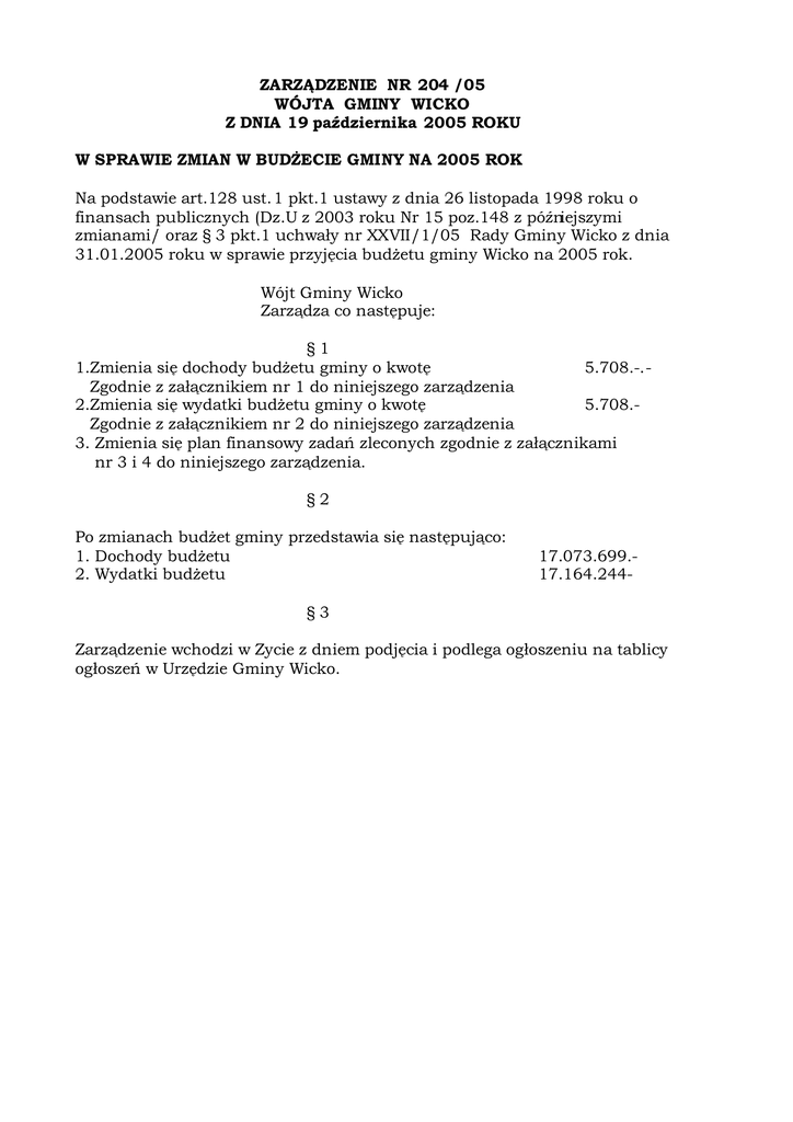 ZARZĄDZENIE NR 204 /05 WÓJTA GMINY WICKO Z DNIA 19