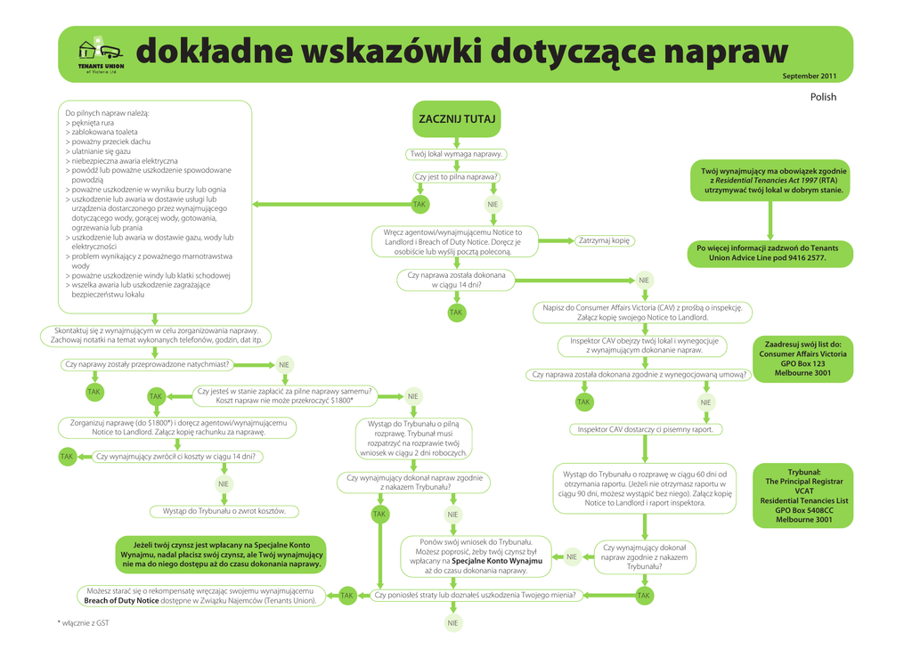 dokładne wskazówki dotyczące napraw September 2011 Polish Do pilnych napraw należą: > pęknięta rura > zablokowana toaleta > poważny przeciek dachu > ulatnianie się gazu > niebezpieczna awaria elektryczna > powódź lub poważne uszkodzenie spowodowane powodzią > poważne uszkodzenie w wyniku burzy lub ognia > uszkodzenie lub awaria w dostawie usługi lub urządzenia dostarczonego przez wynajmującego dotyczącego wody, gorącej wody, gotowania, ogrzewania lub prania > uszkodzenie lub awaria w dostawie gazu, wody lub elektryczności > problem wynikający z poważnego marnotrawstwa wody > poważne uszkodzenie windy lub klatki schodowej > wszelka awaria lub uszkodzenie zagrażające bezpieczeństwu lokalu ZACZNIJ TUTAJ Twój lokal wymaga naprawy. Twój wynajmujący ma obowiązek zgodnie z Residential Tenancies Act 1997 (RTA) utrzymywać twój lokal w dobrym stanie. Czy jest to pilna naprawa? TAK NIE Wręcz agentowi/wynajmującemu Notice to Landlord i Breach of Duty Notice. Doręcz je osobiście lub wyślij pocztą poleconą. Zatrzymaj kopię Czy naprawa została dokonana w ciągu 14 dni? NIE TAK Napisz do Consumer Affairs Victoria (CAV) z prośbą o inspekcję. Załącz kopię swojego Notice to Landlord. Skontaktuj się z wynajmującym w celu zorganizowania naprawy. Zachowaj notatki na temat wykonanych telefonów, godzin, dat itp. Czy naprawy zostały przeprowadzone natychmiast? Po więcej informacji zadzwoń do Tenants Union Advice Line pod 9416 2577. Inspektor CAV obejrzy twój lokal i wynegocjuje z wynajmującym dokonanie napraw. NIE Czy naprawa została dokonana zgodnie z wynegocjowaną umową? TAK TAK Czy jesteś w stanie zapłacić za pilne naprawy samemu? Koszt napraw nie może przekroczyć $1800* Zorganizuj naprawę (do $1800*) i doręcz agentowi/wynajmującemu Notice to Landlord. Załącz kopię rachunku za naprawę. TAK Czy wynajmujący dokonał napraw zgodnie z nakazem Trybunału? Wystąp do Trybunału o zwrot kosztów. TAK * włącznie z GST TAK NIE Inspektor CAV dostarczy ci pisemny raport. Wystąp do Trybunału o rozprawę w ciągu 60 dni od otrzymania raportu. (Jeżeli nie otrzymasz raportu w ciągu 90 dni, możesz wystąpić bez niego). Załącz kopię Notice to Landlord i raport inspektora. NIE Ponów swój wniosek do Trybunału. Możesz poprosić, żeby twój czynsz był wpłacany na Specjalne Konto Wynajmu aż do czasu dokonania naprawy. Jeżeli twój czynsz jest wpłacany na Specjalne Konto Wynajmu, nadal płacisz swój czynsz, ale Twój wynajmujący nie ma do niego dostępu aż do czasu dokonania naprawy. Możesz starać się o rekompensatę wręczając swojemu wynajmującemu Breach of Duty Notice dostępne w Związku Najemców (Tenants Union). TAK Wystąp do Trybunału o pilną rozprawę. Trybunał musi rozpatrzyć na rozprawie twój wniosek w ciągu 2 dni roboczych. Czy wynajmujący zwrócił ci koszty w ciągu 14 dni? NIE NIE NIE Czy poniosłeś straty lub doznałeś uszkodzenia Twojego mienia? NIE Zaadresuj swój list do: Consumer Affairs Victoria GPO Box 123 Melbourne 3001 Czy wynajmujący dokonał napraw zgodnie z nakazem Trybunału? TAK Trybunał: The Principal Registrar VCAT Residential Tenancies List GPO Box 5408CC Melbourne 3001
