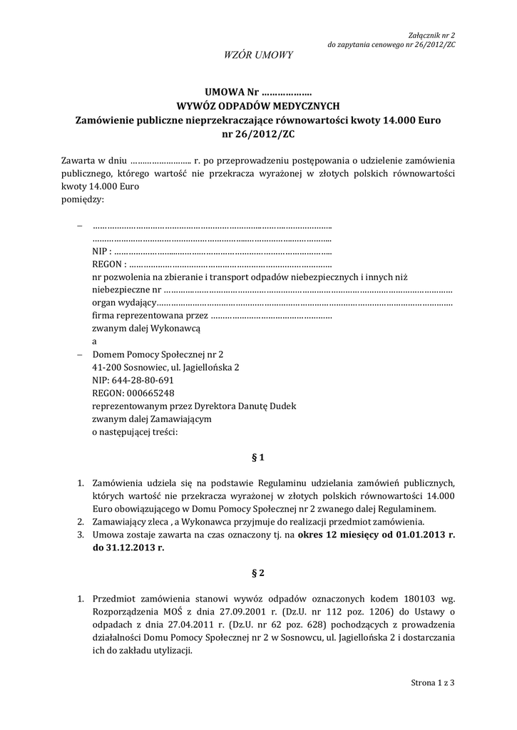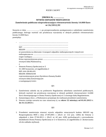 Załącznik nr 2 do zapytania cenowego nr 26/2012/ZC WZÓR UMOWY UMOWA Nr ………………. WYWÓZ ODPADÓW MEDYCZNYCH Zamówienie publiczne nieprzekraczające równowartości kwoty 14.000 Euro nr 26/2012/ZC Zawarta w dniu …………………….. r. po przeprowadzeniu postępowania o udzielenie zamówienia publicznego, którego wartość nie przekracza wyrażonej w złotych polskich równowartości kwoty 14.000 Euro pomiędzy: ……………………………………………………………..……….……………….. ………………………………………………………..……………….…………….. NIP : ……………………...……………………………………………………….. REGON : …………………………………………………………………………. nr pozwolenia na zbieranie i transport odpadów niebezpiecznych i innych niż niebezpieczne nr ………….……………………………………………………………………………………………… organ wydający……………………………………………………………………………………………………………. firma reprezentowana przez …………………………………………… zwanym dalej Wykonawcą a Domem Pomocy Społecznej nr 2 41-200 Sosnowiec, ul. Jagiellońska 2 NIP: 644-28-80-691 REGON: 000665248 reprezentowanym przez Dyrektora Danutę Dudek zwanym dalej Zamawiającym o następującej treści: §1 1. Zamówienia udziela się na podstawie Regulaminu udzielania zamówień publicznych, których wartość nie przekracza wyrażonej w złotych polskich równowartości 14.000 Euro obowiązującego w Domu Pomocy Społecznej nr 2 zwanego dalej Regulaminem. 2. Zamawiający zleca , a Wykonawca przyjmuje do realizacji przedmiot zamówienia. 3. Umowa zostaje zawarta na czas oznaczony tj. na okres 12 miesięcy od 01.01.2013 r. do 31.12.2013 r. §2 1. Przedmiot zamówienia stanowi wywóz odpadów oznaczonych kodem 180103 wg. Rozporządzenia MOŚ z dnia 27.09.2001 r. (Dz.U. nr 112 poz. 1206) do Ustawy o odpadach z dnia 27.04.2011 r. (Dz.U. nr 62 poz. 628) pochodzących z prowadzenia działalności Domu Pomocy Społecznej nr 2 w Sosnowcu, ul. Jagiellońska 2 i dostarczania ich do zakładu utylizacji. Strona 1 z 3 Załącznik nr 2 do zapytania cenowego nr 26/2012/ZC WZÓR UMOWY 2. Częstotliwość wywozu: dwa razy w miesiącu w drugim i czwartym tygodniu miesiąca w godzinach od 7 do 15 – łącznie 24 razy w trakcie trwania umowy, po wcześniejszym uzgodnieniu z pracownikiem Zamawiającego 3. Wykonawca przy każdym odbiorze odpadów dostarczał będzie Zamawiającemu na wymianę odpowiednie opakowania: pojemnik plastikowy o poj. 1 L w ilości 1 szt., pojemnik kartonowy o poj. 7,5 L w ilości 1 szt. 4. Odpady wywożone będą wyspecjalizowanym sprzętem do zakładu utylizacji. 5. Wykonawca zobowiązany jest do podstawienia pojemników najpóźniej do dnia 27.12.2012 r. 6. Wykonawca oświadcza, że zapoznał się z warunkami realizacji zamówienia i miejscem jego wykonania. 7. Integralną częścią umowy jest Formularz Ofertowy. 8. Zamawiający odpowiedzialny jest za gromadzenie odpadow w sposob zgodny z Rozporządzeniem Ministra Zdrowia z dnia 30 lipca 2010r. W sprawie szczegołowego sposobu postępowania z odpadami medycznymi. 9. Wykonawca zastrzega sobie prawo do odmowy przyjęcia odpadow, gdy stan techniczny opakowania uniemozliwia ich bezpieczny transport. O uszkodzeniu opakowania Zamawiający zobowiązany jest powiadomic kierowcę dokonującego odbioru. 10. W razie nieodpowiedniego opakowania przez Zamawiającego odpadow lub uzycia opakowan niezgodnych z Rozporządzeniem Ministra Zdrowia z dnia 30 lipca 2010r. w sprawie szczegołowego sposobu postępowania z odpadami medycznymi (Dz. U. Nr 139, poz. 940) ponosi on wszelką odpowiedzialnosc za konsekwencje wynikłe z tego faktu. 11. Do biezących kontaktow, przyjmowania wszelkich uwag i sugestii oraz sprawowania wewnętrznego nadzoru mad przebiegiem realizacji zobowiązan niniejszej umowy Strony wyznaczają: ze strony Zamawiającego: Kierownik Zespołu Pielęgniarek – Ewa Szafirska ze strony Wykonawcy: ............................................................................................................ §3 1. Strony ustalają, że obowiązującą formą wynagrodzenia Wykonawcy za okres dwunastu miesięcy, zgodnie z ofertą cenową będzie wynagrodzenie wg. ogólną kwotę w wysokości: Wartość ogółem netto ………………………………………………………………………………………………… Wartość ogółem VAT ………………………………………………………………………………………………….. Wartość ogółem brutto ……………………………………………………………………….……………………… Słownie wartość ogółem brutto……………………………………………………………………………………. …………………………………………………………………………………………………………………………………….. 2. Cena oferty jest stała, niezmienna przez okres realizacji zamówienia tj. 12 miesięcy. Zamawiający zakazuje zmian, chyba, że wynikają z wprowadzenia koniecznych zmian Strona 2 z 3 Załącznik nr 2 do zapytania cenowego nr 26/2012/ZC WZÓR UMOWY wynikających z okoliczności, których nie można było przewidzieć w chwili zawarcia umowy. 3. Fakt odebrania odpadów musi zostać udokumentowany listem przewozowym kierowcy. §4 1. Rozliczenie za przedmiot umowy będzie następowało na podstawie rachunków\faktur jeden raz w miesiącu. Termin zapłaty ustala się na 14 dni od daty doręczenia rachunku\faktury. 2. Strony postanawiają, iż zapłata następuje w dniu obciążenia rachunku bankowego Zamawiającego. §5 1. Wykonawca płaci Zamawiającemu karę umowną za każdą rozpoczęta dobę zw