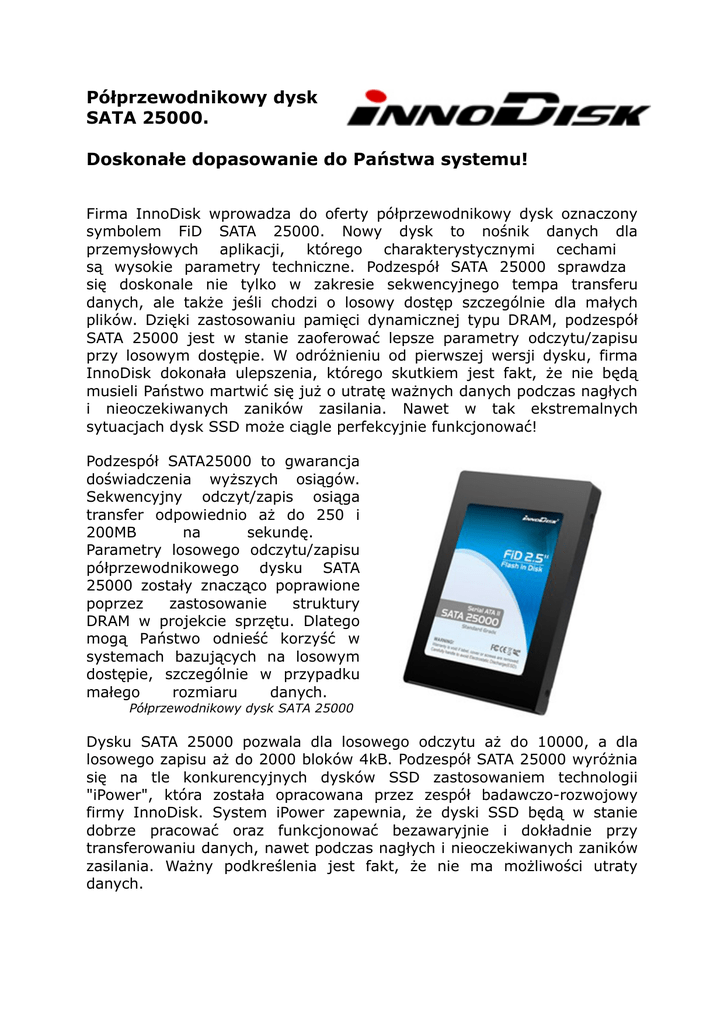 Półprzewodnikowy dysk SATA 25000. Doskonałe dopasowanie do Państwa systemu! Firma InnoDisk wprowadza do oferty półprzewodnikowy dysk oznaczony symbolem FiD SATA 25000. Nowy dysk to nośnik danych dla przemysłowych aplikacji, którego charakterystycznymi cechami są wysokie parametry techniczne. Podzespół SATA 25000 sprawdza się doskonale nie tylko w zakresie sekwencyjnego tempa transferu danych, ale także jeśli chodzi o losowy dostęp szczególnie dla małych plików. Dzięki zastosowaniu pamięci dynamicznej typu DRAM, podzespół SATA 25000 jest w stanie zaoferować lepsze parametry odczytu/zapisu przy losowym dostępie. W odróżnieniu od pierwszej wersji dysku, firma InnoDisk dokonała ulepszenia, którego skutkiem jest fakt, że nie będą musieli Państwo martwić się już o utratę ważnych danych podczas nagłych i nieoczekiwanych zaników zasilania. Nawet w tak ekstremalnych sytuacjach dysk SSD może ciągle perfekcyjnie funkcjonować! Podzespół SATA25000 to gwarancja doświadczenia wyższych osiągów. Sekwencyjny odczyt/zapis osiąga transfer odpowiednio aż do 250 i 200MB na sekundę. Parametry losowego odczytu/zapisu półprzewodnikowego dysku SATA 25000 zostały znacząco poprawione poprzez zastosowanie struktury DRAM w projekcie sprzętu. Dlatego mogą Państwo odnieść korzyść w systemach bazujących na losowym dostępie, szczególnie w przypadku małego rozmiaru danych. Półprzewodnikowy dysk SATA 25000 Dysku SATA 25000 pozwala dla losowego odczytu aż do 10000, a dla losowego zapisu aż do 2000 bloków 4kB. Podzespół SATA 25000 wyróżnia się na tle konkurencyjnych dysków SSD zastosowaniem technologii "iPower", która została opracowana przez zespół badawczo-rozwojowy firmy InnoDisk. System iPower zapewnia, że dyski SSD będą w stanie dobrze pracować oraz funkcjonować bezawaryjnie i dokładnie przy transferowaniu danych, nawet podczas nagłych i nieoczekiwanych zaników zasilania. Ważny podkreślenia jest fakt, że nie ma możliwości utraty danych. Mając na uwadze znaczenie monitorowania statusu zużycia dysku SSD, w skład którego wchodzą takie parametry jak ilość kasowań danych bloków, ilość wolnych bloków oraz informacje o złych sektorach, podzespół SATA 25000 wspiera funkcję SMART. Klienci mogą monitorować informacje o sektorach na dyskach SSD oraz uzyskać informację na temat ich oczekiwanej długości życia. Firma InnoDisk zapewnia oprogramowanie SMART (do wyboru), które klienci mogą dalej rozwijać. Możliwe jest także elastyczne dostosowanie podzespołu do potrzeb użytkownika. Firma InnoDIsk oferuje takie usługi po otrzymaniu prośby od klienta. Półprzewodnikowy dysk SATA 25000 zapewnia doskonałe osiągi, niezawodność i dużo więcej innych funkcji dla Państwa systemu. Próbki podzespołu SATA 25000 są dostępne na życzenie. Zapraszamy do składania zapytań - przygotujemy satysfakcjonującą Państwa ofertę! SE Spezial-Electronic Sp. z o.o. ul. Stępińska 22/30 lok. 209 00-739 Warszawa tel. 022 840 91 10 fax. 022 841 20 10 www.spezial.pl