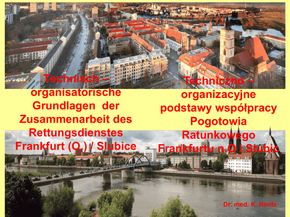 Technisch – organisatorische Grundlagen der Zusammenarbeit des Rettungsdienstes Frankfurt (O.) / Slubice Techniczno – organizacyjne podstawy współpracy Pogotowia Ratunkowego Frankfurtu n.O i Słubic Dr. med. K. Nimtz Auf Bewährtem aufbauen • Zusammenarbeit im Rettungsdienst, auch mit dem Krankenhaus in Slubice hat gute Tradition • Współdziałanie między Frankfurtem nad Odrą a Słubicami w dziedzinie ratownictwa medycznego ma dobrą wieloletnią tradycję. • Rettungsdienstliche Zusammenarbeit ist bisher meist auf Versorgung polnischer Patienten in Deutschland und Transport deutscher Patienten von Slubice nach Frankfurt (O.) begrenzt • Dotychczas współpraca ograniczała się wyłącznie do opieki lekarskiej nad polskimi pacjentami po stronie niemieckiej i transportu niemieckich pacjentów ze Słubic do Frankfurtu. • Gefestigte Strukturen existieren im Bereich Brand- u. Katastrophenschutz (Hochwasserschutz) • Istnieją już sprawdzone struktury w ochronie przeciwpożarowej i zapobiegania nadzwyczajnym zagrożeniom (ratownictwo wysokościowe, ochrona przeciwpowodziowa). Wo gibt es Unterschiede und mögliche Probleme ? • Leistungsfähigkeit der Krankenhäuser • Disposition der Notrufe in den Leitstellen • Indikationen für den Einsatz des Notarztes • Ausbildung und Kompetenzen des Rettungsdienstpersonals • Wydajność szpitali • Sposoby alarmowania i dysponowania • Wskazania dla lekarzy pogotowia ratunkowego • Szkolenia i umiejętności medycznych służb ratunkowych nie są jednolite • Ausstattung der Rettungsmittel mit Medizintechnik u. Medikamenten • Juristische Unsicherheiten (z.B. bei verstorbenen Pat.) • wyposażenie sprzętu ratunkowego w leki i technologie medyczne jest kompatybilne jedynie częściowo. • istnieją różnice natury prawnej, wynikające z rozbieżności przepisów (np. postępowanie z pacjentem po jego zgonie). • Kommunikationsproble me durch Sprachbarriere • Unterschiede in der Dokumentation • problemy w komunikacji będące następstwem bariery językowej. • nie istnieje jednolita dokumentacja. Welche Lösungsansätze gibt es ? • należy określić przepisy • Alarm- u. dotyczące zgłoszeń i Ausrückeordnung reagowania, w insbes. für szczególności Großschadensfälle auf zwalczania poważnych polnischer u. szkód powypadkowych bundesdeutscher Seite po polskiej i niemieckiej gemeinsam festlegen stronie • Indikationen für • Wytyczne dla lekarzy Notarzteinsätze pogotowia ratunkowego gegenseitig kennen und wo mögl. abstimmen muszą być wzajemnie wymieniane i uzgadniane. • Gemeinsame praktische • Wspólne praktyczne szkolenia personelu Ausbildung des Rettungsdienstpersonal ratunkowego, również s na poziomie lekarzy • Erfahrungsaustausch pogotowia ratunkowego. und Fortbildung der • Należy dążyć do Notärzte prowadzenia wspólnych • Persönlicher Kontakt szkoleń. der Führungskräfte • Notfallmedizinische Therapie für bestimmte Diagnosen (ACS, cerebraler Notfall, Polytrauma) weitestgehend abstimmen. • Ważna jest koordynacja leczenia powypadkowego i wynikającej z tego dalszej opieki klinicznej nad pacjentami wraz z odpowiednią diagnozą (np. ostry zespół wieńcowy, udar, obrażenia wielonarządowe). • Ausstattung der Rettungsmittel muss gegenseitig bekannt sein und wo möglich kompatibel gestaltet werden (unter Beachtung gesetzlicher Grundlagen – MPG – u. finanzieller Rahmenbedingungen) • Rechtliche Probleme zeitnah klären • Relevante Dokumente zweisprachig vorhalten • Zgodnie z wymogami ustawowymi (np. niemiecka ustawa o stosowaniu aparatów medycznych MPG) i oczywiście ogólne warunki finansowania, wyposażenie w środki ratownictwa medycznego powinno być dostosowane tak, aby istniała wzajemna ich kompatybilność. • Stosowne dokumenty muszą być dwujęzyczne. • Enge Kommunikation zwischen den Leitstellen auf beiden Seiten herstellen (personell u. technisch) • Ścisła współpraca między centrami jest najważniejszym warunkiem skutecznej współpracy. Nieodzowna jest regularna komunikacja pomiędzy kierownictwem obu stron. Wie können wir das schaffen ? Womit fangen wir an ? • Arbeitsgruppe „Rettungsdienst Frankfurt (O.) / Slubice“ • Persönlicher Kontakt über polnisch sprechende Kollegen • grupa robocza "Pogotowie Ratunkowe Frankfurt nad Odrą / Słubice„ („Rettungsdienst Frankfurt (O.)/Słubice“). • Osobisty kontakt po przez polskojęzycznego współpracownika. • Praktische rettungsdienstliche Ausbildung auf der Rettungswache der Berufsfeuerwehr u. ggf. in der San-Arena an der Landesrettungsschule • Ausbildung von Notärzten an der Landesrettungsschule • Praktyczne szkolenia ratownictwa medycznego przeprowadzane na terenie Straży Pożarnej we Frankfurcie nad Odrą, oraz w regionalnej szkole ratownictwa medycznego w Bad Saarow (San-Arena). • Hospitationen gegenseitig, Mischbesatzungen im Rettungsdienst, Personalaustausch der Leitstellen • Gemeinsame Übungen mit Rettungsdienst, Brand- u. Katastrophenschutz beider Städte • Możliwe jest okresowe stosowanie mieszanych polsko-niemieckich załóg ratowniczych. • Wspólne ćwiczenia we współpracy ze służbami ochrony przeciwpożarowej i zapobiegania katastrofom. • Einbeziehen des polnischen Rettungsdienstes in besondere Einsatzlagen, z.B. bei Autobahnunfällen und anderen größeren Schadensfällen und umgekehrt • W akcjach o szczególnym charakterze oraz przypadkach ogromnych szkód w następstwie wypadków (np. autostrada nr 112; BAB 112) powinny być przede wszystkim zaangażowane służby ratunkowe. • Notrufe, die aus dem Bereich Slubice in der Leitstelle in Frankfurt (O.) eingehen werden dort disponiert und die Einsätze werden mit Rettungsmitteln aus Frankfurt (O.) realisiert. • Obecnie zgłoszenia alarmowe ze Słubic, nadchodzące do centrali we Frankfurcie nad Odrą i tam dysponowane, realizowane są za pośrednictwem pogotowia ratunkowego we Frankfur