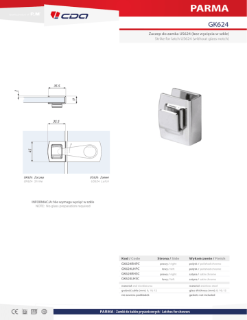 PARMA GK624 Zaczep do zamka US624 (bez wycięcia w szkle) Strike for latch US624 (without glass notch) 17 2 35.5 45 35.5 GK624 Zaczep GK624 Strike US624 Zamek US624 Latch INFORMACJA: Nie wymaga wycięć w szkle NOTE: No glass preparation required Kod / Code Strona / Side Wykończenie / Finish GK624RHPC GK624LHPC GK624RHSC GK624LHSC prawy / right połysk / polished chrome lewy / left połysk / polished chrome prawy / right satyna / satin chrome lewy / left satyna / satin chrome materiał: stal nierdzewna material: stainless steel grubość szkła (mm): 8; 10; 12 glass thickness (mm): 8; 10; 12 nie zawiera podkładek gaskets not included PARMA І Zamki do kabin prysznicowych І Latches for showers