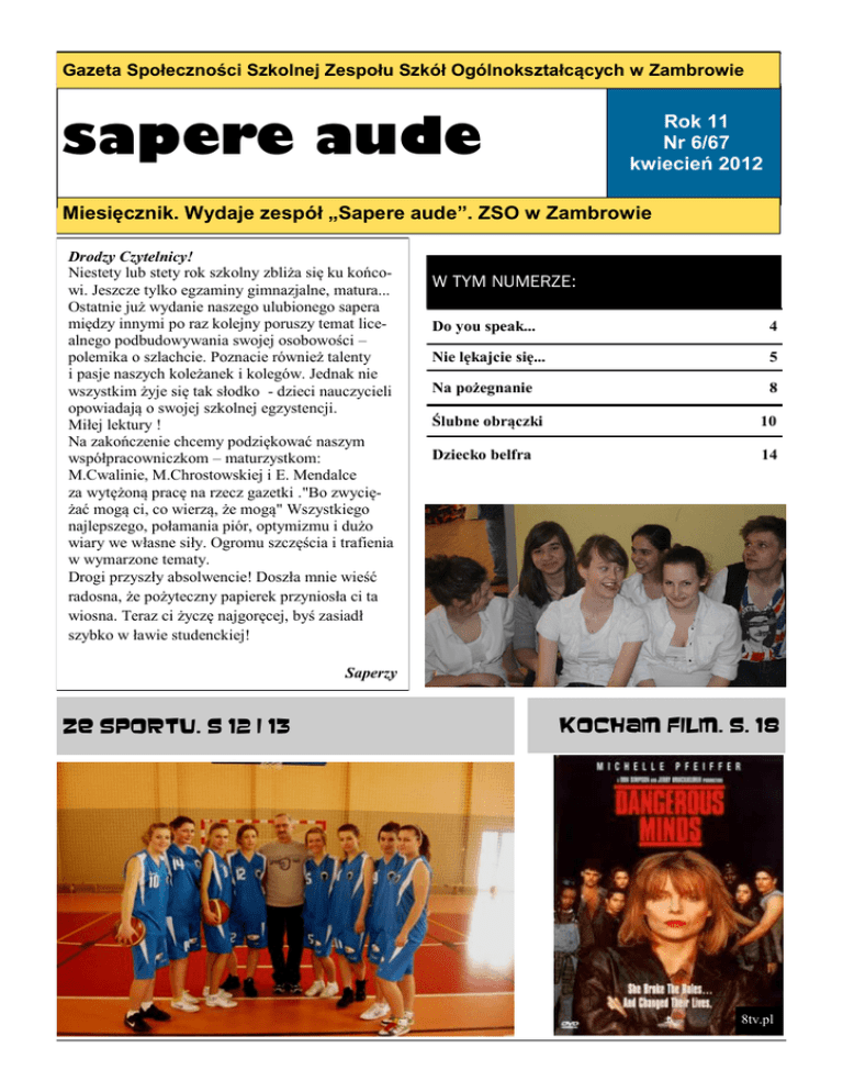 S AP ER E AU DE S TR. 1 Gazeta Społeczności Szkolnej Zespołu Szkół Ogólnokształcących w Zambrowie sapere aude Rok 11 Nr 6/67 kwiecień 2012 Miesięcznik. Wydaje zespół „Sapere aude”. ZSO w Zambrowie Drodzy Czytelnicy! Niestety lub stety rok szkolny zbliża się ku końcowi. Jeszcze tylko egzaminy gimnazjalne, matura... Ostatnie już wydanie naszego ulubionego sapera między innymi po raz kolejny poruszy temat licealnego podbudowywania swojej osobowości – polemika o szlachcie. Poznacie również talenty i pasje naszych koleżanek i kolegów. Jednak nie wszystkim żyje się tak słodko - dzieci nauczycieli opowiadają o swojej szkolnej egzystencji. Miłej lektury ! Na zakończenie chcemy podziękować naszym współpracowniczkom – maturzystkom: M.Cwalinie, M.Chrostowskiej i E. Mendalce za wytężoną pracę na rzecz gazetki ."Bo zwyciężać mogą ci, co wierzą, że mogą" Wszystkiego najlepszego, połamania piór, optymizmu i dużo wiary we własne siły. Ogromu szczęścia i trafienia w wymarzone tematy. Drogi przyszły absolwencie! Doszła mnie wieść radosna, że pożyteczny papierek przyniosła ci ta wiosna. Teraz ci życzę najgoręcej, byś zasiadł szybko w ławie studenckiej! W TYM NUMERZE: Do you speak... 4 Nie lękajcie się... 5 Na pożegnanie 8 Ślubne obrączki 10 Dziecko belfra 14 Saperzy Ze sportu. S 12 i 13 Kocham film. S. 18 8tv.pl S TR. 2 R OK 11 6/67 K marzec-kwiecień alendarz 7 marca w Centrum Kultury w Zambrowie odbyły się powiatowe eliminacje do 57. Ogólnopolskiego Konkurs Recytatorskiego. Organizatorem eliminacji był Miejski Ośrodek Kultury. Konkurs skierowany był do uczniów szkół ponadgimnazjalnych. Po przeprowadzonych wcześniej eliminacjach szkolnych do konkursu na szczeblu powiatowym dostała się trójka uczniów z naszego liceum. Z przyjemnością informujemy, że laureatem II miejsca został uczeń ZSO – Adam Szyszko, którego opiekunem jest p. prof. Anna Rutkowska. Tym samym został zakwalifikowany do eliminacji wojewódzkich, które odbędą się w Wojewódzkim Ośrodku Animacji Kultury „Spodki” w Białymstoku. Marzec to jak zwykle czas finałów wojewódzkich konkursów przedmiotowych organizowanych przez Kuratorium Oświaty w Białymstoku. A, jak wiadomo, jest o co walczyć, gdyż uzyskanie tytułu laureata skutkuje zwolnieniem z części humanistycznej lub matematycznoprzyrodniczej egzaminu gimnazjalnego. Tym samym laureat otrzymuje maksymalną ilość punktów z danej części egzaminu i ocenę celującą z przedmiotu na koniec roku. Oczywiście nasza szkoła jak co roku może się pochwalić liczną grupą laureatów i finalistów. 7 marca na pierwszy ogień poszedł język polski. Tytuł laureata Wojewódzkiego Konkursu Języka Polskiego uzyskała uczennica klasy III C naszego gimnazjum Dominika Kowalewska, którą do konkursu przygotowywała p. prof. Bożena Rykaczewska. 13 marca odbył się natomiast finał Wojewódzkiego Konkursu Fizycznego. Tutaj tytuł laureata wywalczył Krzysztof Mioduszewski, uczeń klasy III D, którego do konkursu przygotowywała p. prof. Danuta Krajewska. Warto dodać, że Krzysztof dzień wcześniej (12 marca) startował w finale Wojewódzkiego Konkursu Matematycznego, do którego był przygotowywany przez p. prof. Justynę Krasowską i osiągnął tytuł finalisty. W roku szkolnym 2010/2011 Krzysztof jako drugoklasista został laureatem w Wojewódzkiego Konkursu Historycznego i dzięki temu został zwolniony z obydwu części egzaminu gimnazjalnego. Jednak prawdziwym dniem triumfu naszych gimnazjalistów był 16 marca, dzień rozstrzygnięcia finałowego etapu Wojewódzkiego Konkursu Historycznego. Do udziału w nim zakwalifikowała się aż dziewiątka naszych gimnazjalistów. Aż siedmioro z nich uzyskało tytuł laureata, a dwie osoby – tytuł finalisty. Laureatami Wojewódzkiego Konkursu Historycznego zostali: Dawid Chaberek kl. IA, Jakub Ciecierski kl. IC, Bartosz Korzeb kl. IA, Beata Jadźwińska kl. IIA, Olga Gniazdowska kl. II B, Piotr Olszewski kl. IIIA i Anita Grabowska kl. IIIC. Tytuł finalisty otrzymali: Eliza Kalata kl. II B i Adrian Woźniak kl. I B. Wszystkich uczniów do konkursu przygotowywała p. prof. Wiesława Iwanicka. 29 marca- „Balladyna” i „Mam talent” W czwartek, 29 marca, uczniowie gimnazjum i liceum mieli okazję podziwiać kunszt aktorski członków naszego szkolnego koła teatralnego „Antrakt”, które wystawiało słynną „Balladynę” Juliusza Słowackiego. Uczniowie gimnazjum i liceum pod opieką p. prof. Bożeny Rykaczewskiej i p. prof. Elżbiety Chmielewskiej długo przygotowywali się do tego występu. W przedstawienie zaangażowani byli następujący aktorzy: Norbert Zubkowicz i Mateusz Ajdyna z klasy Iag, Katarzyna Gosk z klasy IIcg, Anita Grabowska, Dominika Kowalewska, Michalina Sutkowska, Dominik Sierzputowski, Piotr Baczewski i Szymon Kruszewski z klasy IIIcg, Martyna Dekutowska z klasy IIIdg, Dominika Kalupa z klasy Ie LO, Magdalena Przeździecka i Patryk Topolski z klasy IIa LO oraz Dariusz Krystowski z klasy IIe LO. Tuż po przedstawieniu odbyła się szkolna edycja popularnego show „Mam Talent”. Podobnie jak w latach ubiegłych uczniowie mogli zaprezentować swoje szczególne umiejętności wokalne oraz taneczne. W ramach zabawy na scenie pojawiło się w sumie 8 utalentowanych grup i wykonawców, a wśród nich: Natalia Kijek, grupa taneczna NONAME, Kamila Pieńczykowska, Milena Zaręba, Aleksandra Duchnowska, Katarzyna Gosk, grupa Rrrr..., Oliwia Kalinowska, LMFAO (Karol Kos i Kuba Piotrowski), Magdalena Zaręba i Aleksandra Cackowska. S AP ER E S TR. 3 AU D E 30 marca w Komendzie Powiatowej Państwowej Straży Pożarnej w Zambrowie odbyły się powiatowe eliminacje Ogólnopolskiego Turnieju Wiedzy Pożarniczej "Młodzież zapobiega pożarom". Eliminacje powiatowe składały się z dwóch etapów. Najpierw młodzież musiała zmierzyć się z testem dotyczącym zasad bezpieczeństwa przeciwpożarowego. Na tej podstawie
